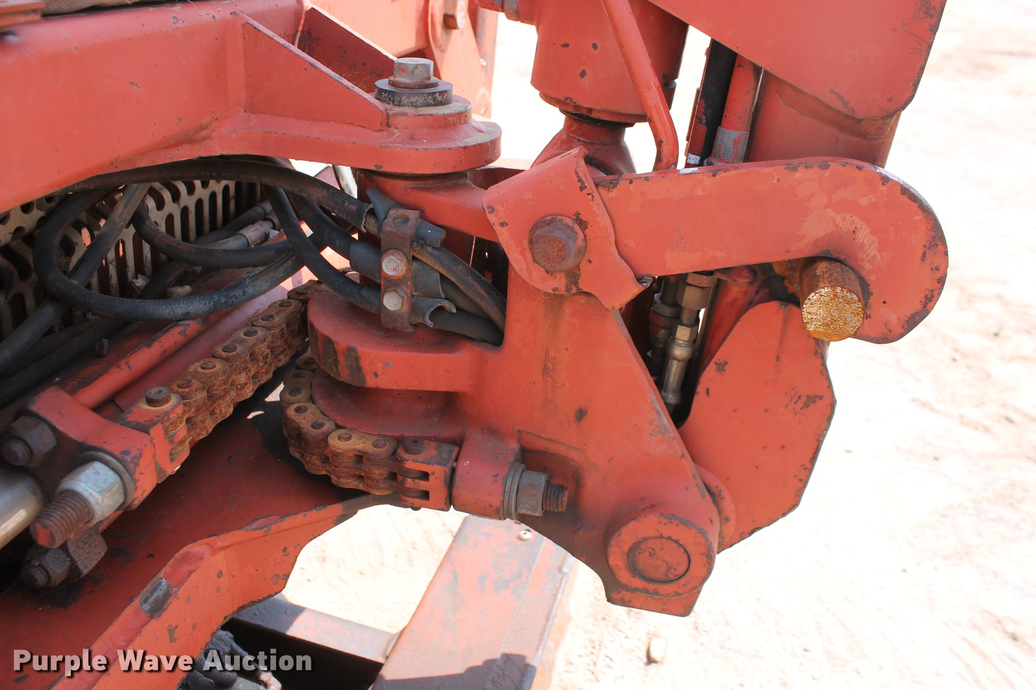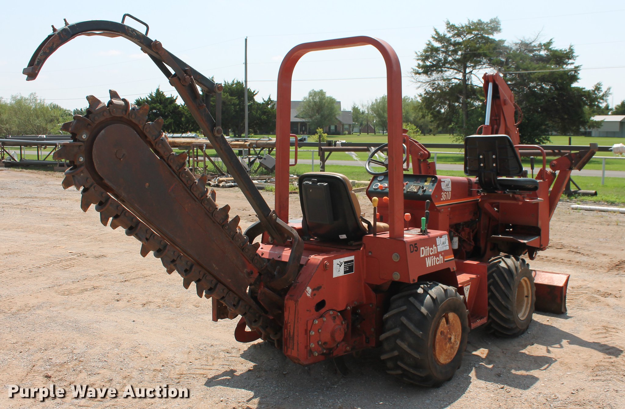 Purple Wave is selling a used Trencher or Rock Saw in Oklahoma. This item is a 2000 Ditch Witch 3610DD trencher with the following: 1,159 hours on meter, Deutz F3L1011F three cylinder diesel engine, 26 kW, Serial 00469481, Manual transmission, 3F-1R gears, Four wheel drive, ROPS bar, Auxiliary hydraulics, 48"L trenching boom, 6" cutting width, 14" end idler diameter, Rock teeth, Crumber bridge, Manual crumber arch, 3.5" crumber shoe width,, Backhoe model A222, 11"W three tooth bucket, Outriggers, Serial 1L3404, 64"W six-way backfill blade, Wheel weights, 26 x 12.00-12 tires, Serial 3T0687, Unit# D5