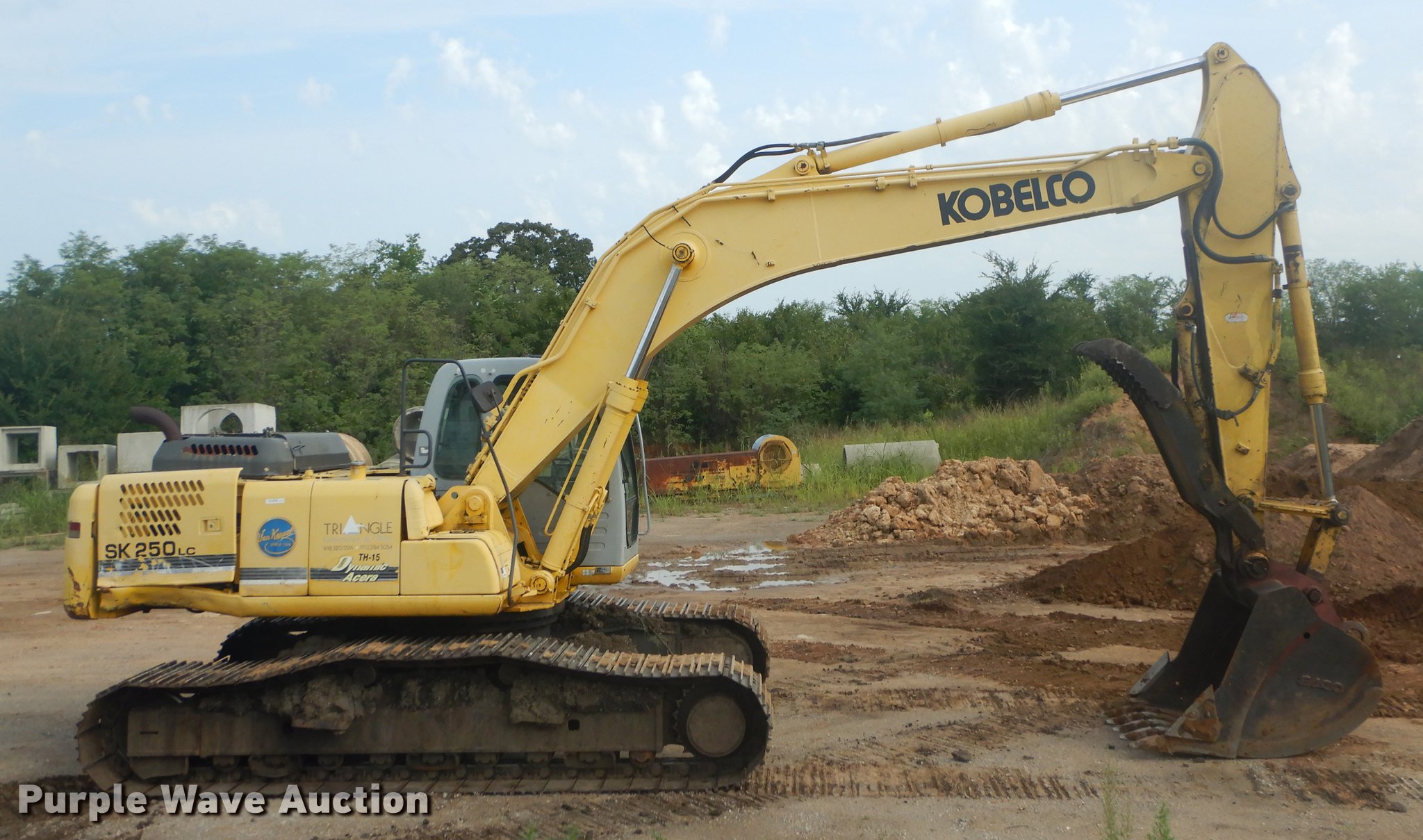 2004 Kobelco SK250LC excavator. 8,198 hours on meter, Six cylinder turbo diesel engine, Hydrostatic transmission, AC and heat, AM/FM, Suspension seat, Front work lights, Wipers, Auto lube, Standard boom, 101" stick length, Two-way auxiliary hydraulics, Hydraulic thumb, Eaco 54"W bucket Bolt-on cutting edge, (6) bolt-on teeth, 31"W steel tracks, Front windshield wiper missing, Front work light missing, Weak hydraulic pressure on thumb, Unknown operating condition of AC and heat, Serial LL09-U0741. Triangle Construction & Utility. 2241 S. 49th W. Avenue. Tulsa, OK 74107