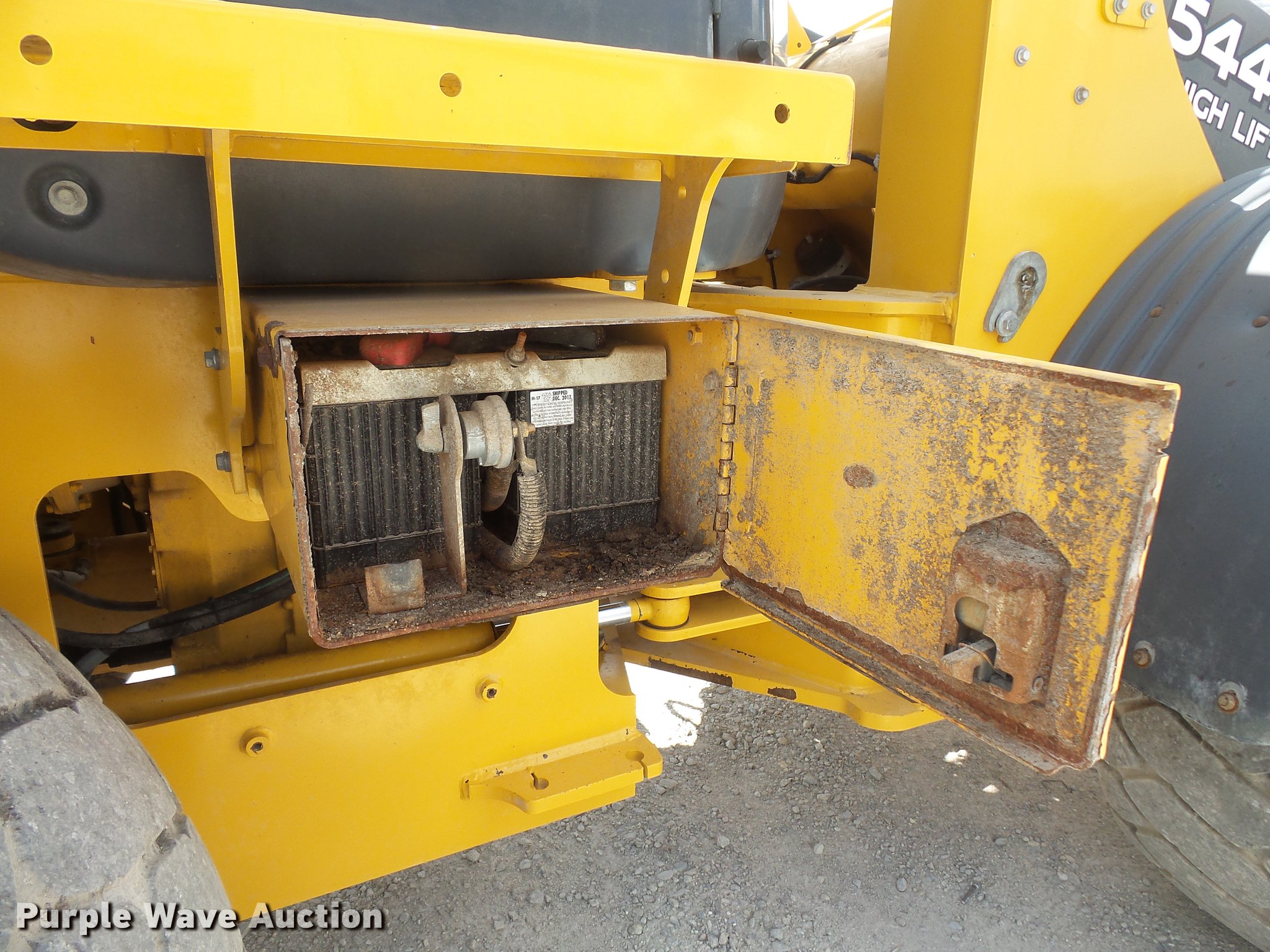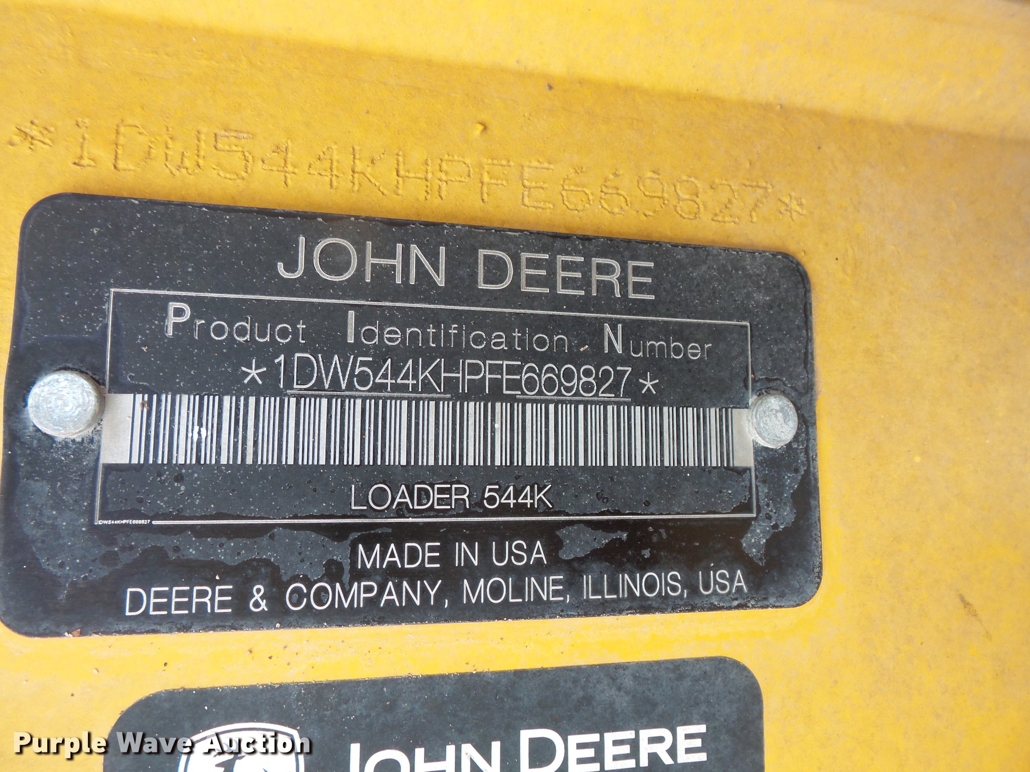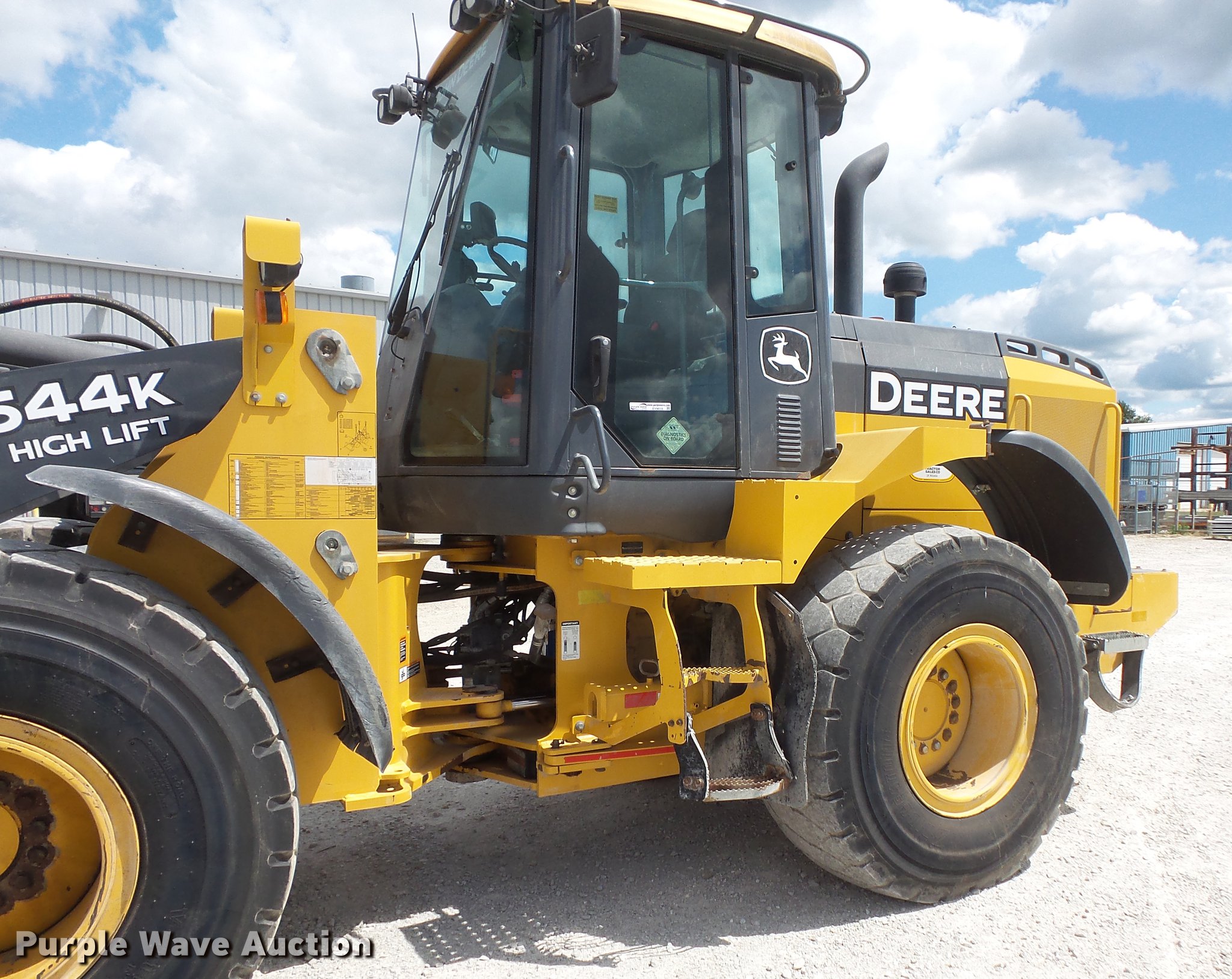 Purple Wave is selling a used Wheel Loader in Indiana. This item is a 2015 John Deere 544K High Lift wheel loader with the following: 8,258 hours on meter, John Deere 6068 six cylinder turbo diesel engine, 163 HP, Serial PE6068R103397, Powershift transmission, 4F-3R gears, Differential lock, EROPS, AC and heat, AM/FM, Suspension seat, Joystick bucket controls, Ride control, Wipers, Front and rear work lights, John Deere AT340089-544 105"W general purpose bucket, Three cu. yd. capacity, Bolt-on cutting edge, Counterweights, 20.5R25 tires, Serial 1DW544KHPFE669827
