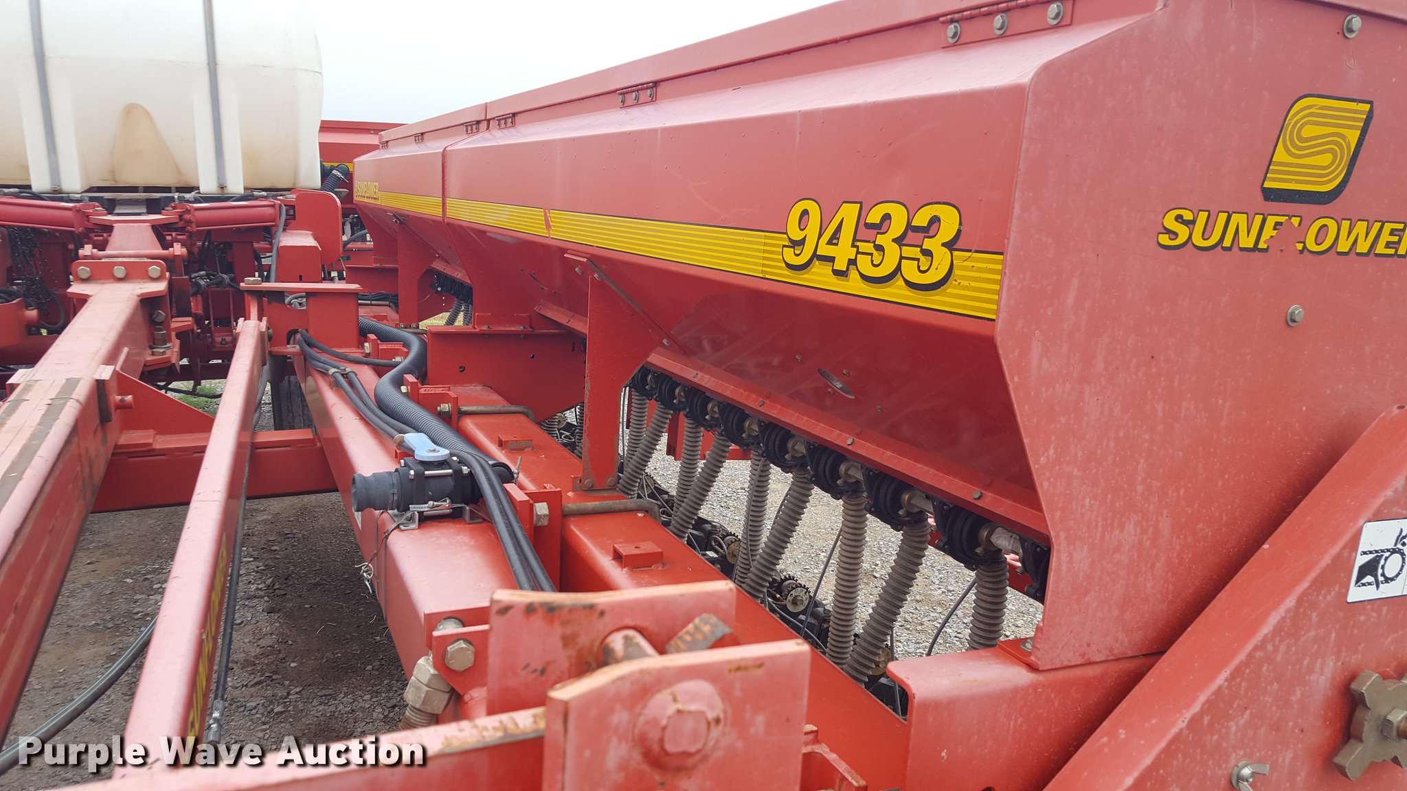Purple Wave is selling a used Grain Drill or Seeder in Texas. This item is a Sunflower 9433 grain drill with the following: 40'W, 64 row units, 7.5" row spacing, Hydraulic front fold, Bulk fill system, 96 bushel capacity, 500 gallon liquid fertilizer tank, Coulter, Piston pump, Pin hitch, (4) 12.5L-15 transport tires, (7) 9.5L-15 drive/outside tires, Serial 433106078