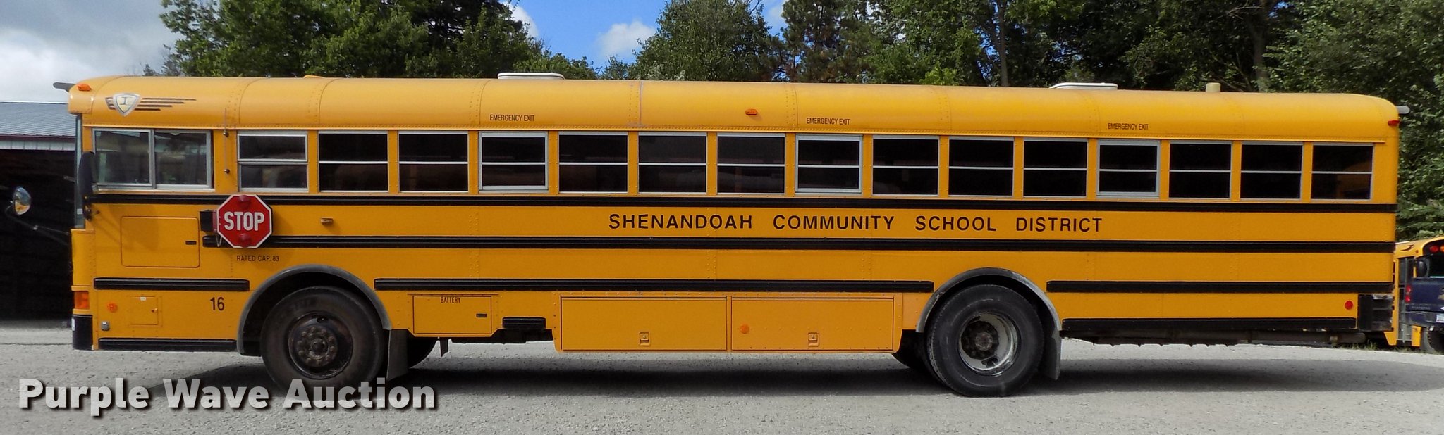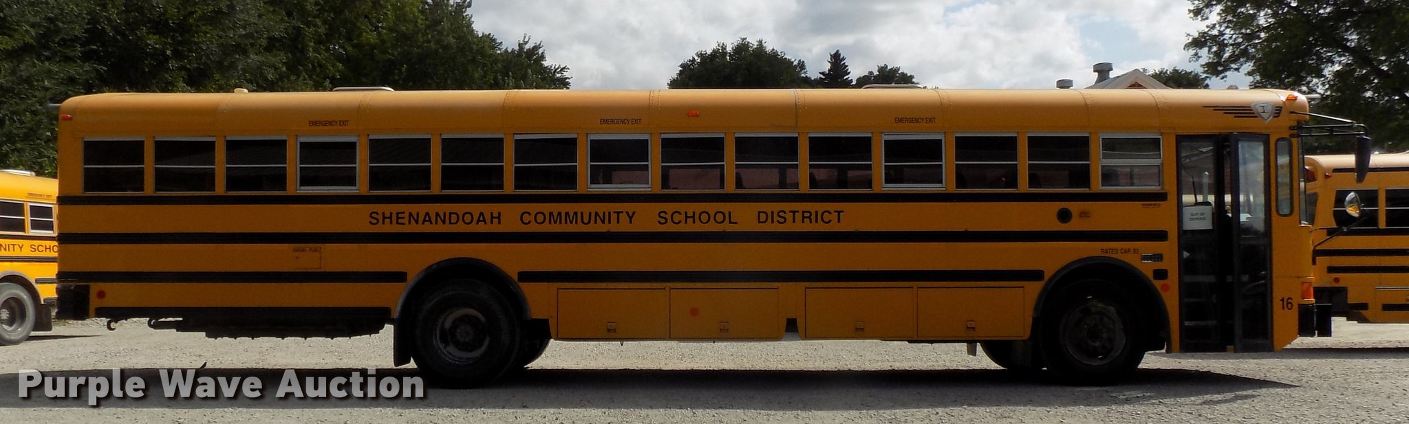 2005 International FE school bus. 111,650 miles on odometer, 6,824 hours on meter, International CH215/DT466 7.6L L6 turbo diesel engine Serial 470HM2U1452485, Allison automatic transmission, Single axle, Heat, AM/FM/cassette, Heated mirrors, Suspension seat, 83 passenger capacity, (29) adult seats, Rear and side emergency exits, Lighted stop sign, Backup alarm, Underside luggage storage, Rear tow hooks, Air suspension, Air brakes, 11R22.5 tires, GVWR 31,350 lbs, Unit# 16. Iowa title. Seller is a government entity who will be assigning and distributing the title. Please contact the seller for distribution questions. 4DRBGAAN94A971711. Shenandoah Community Schools. 115 W Nishua Rd. Shenandoah, IA 51601
