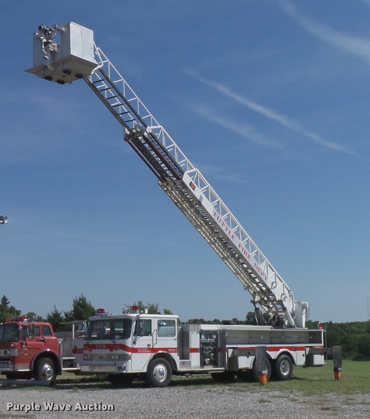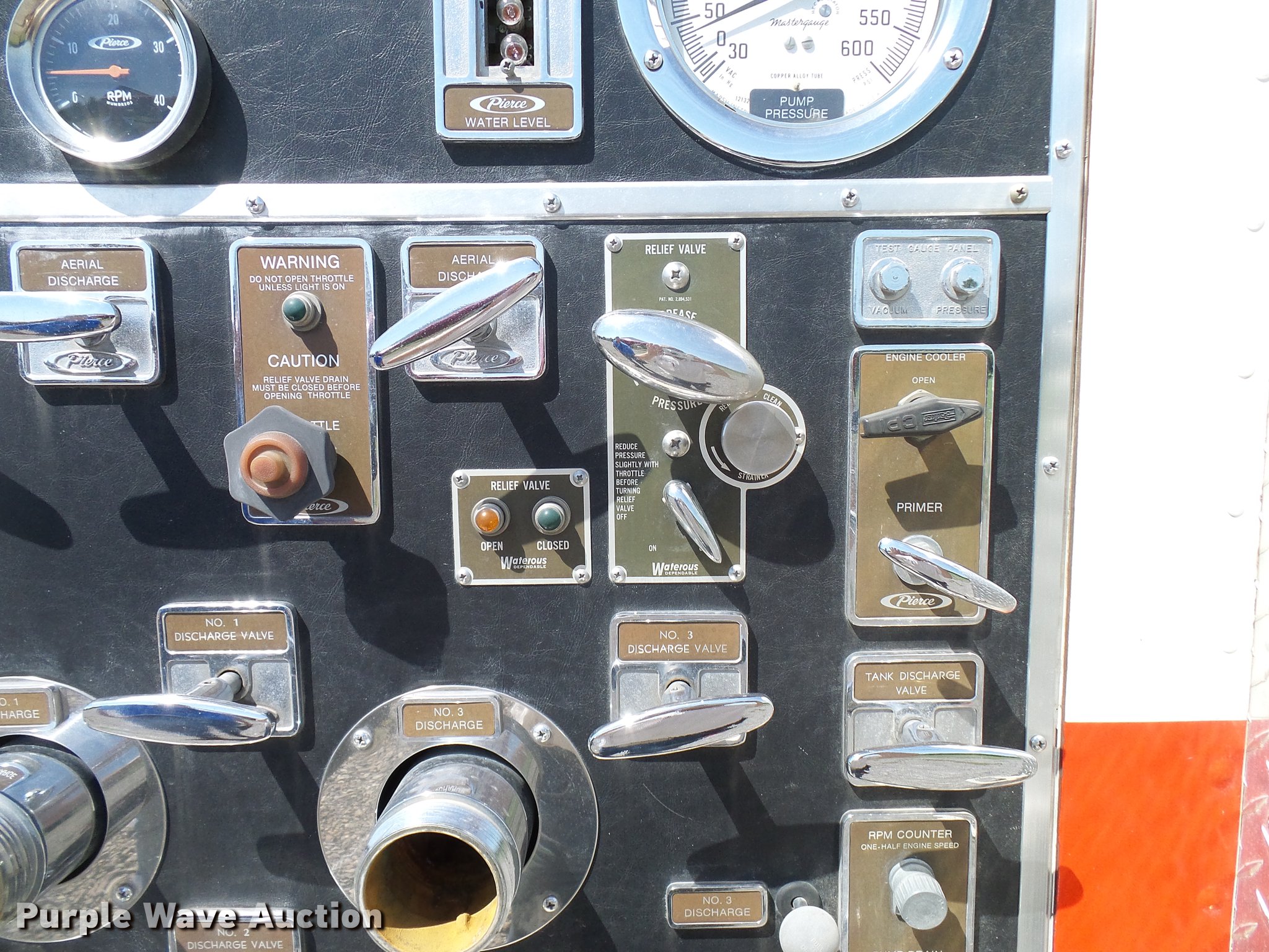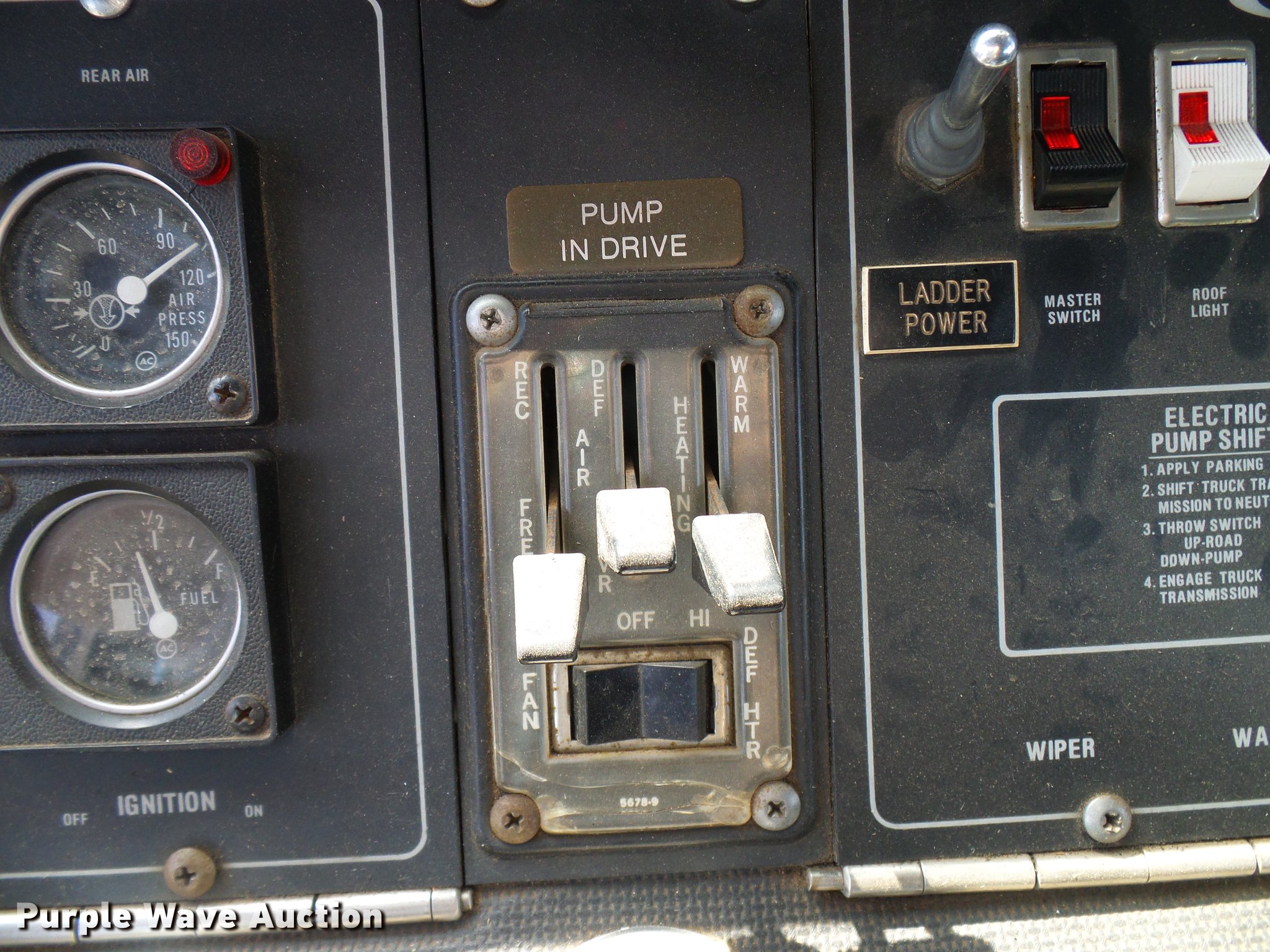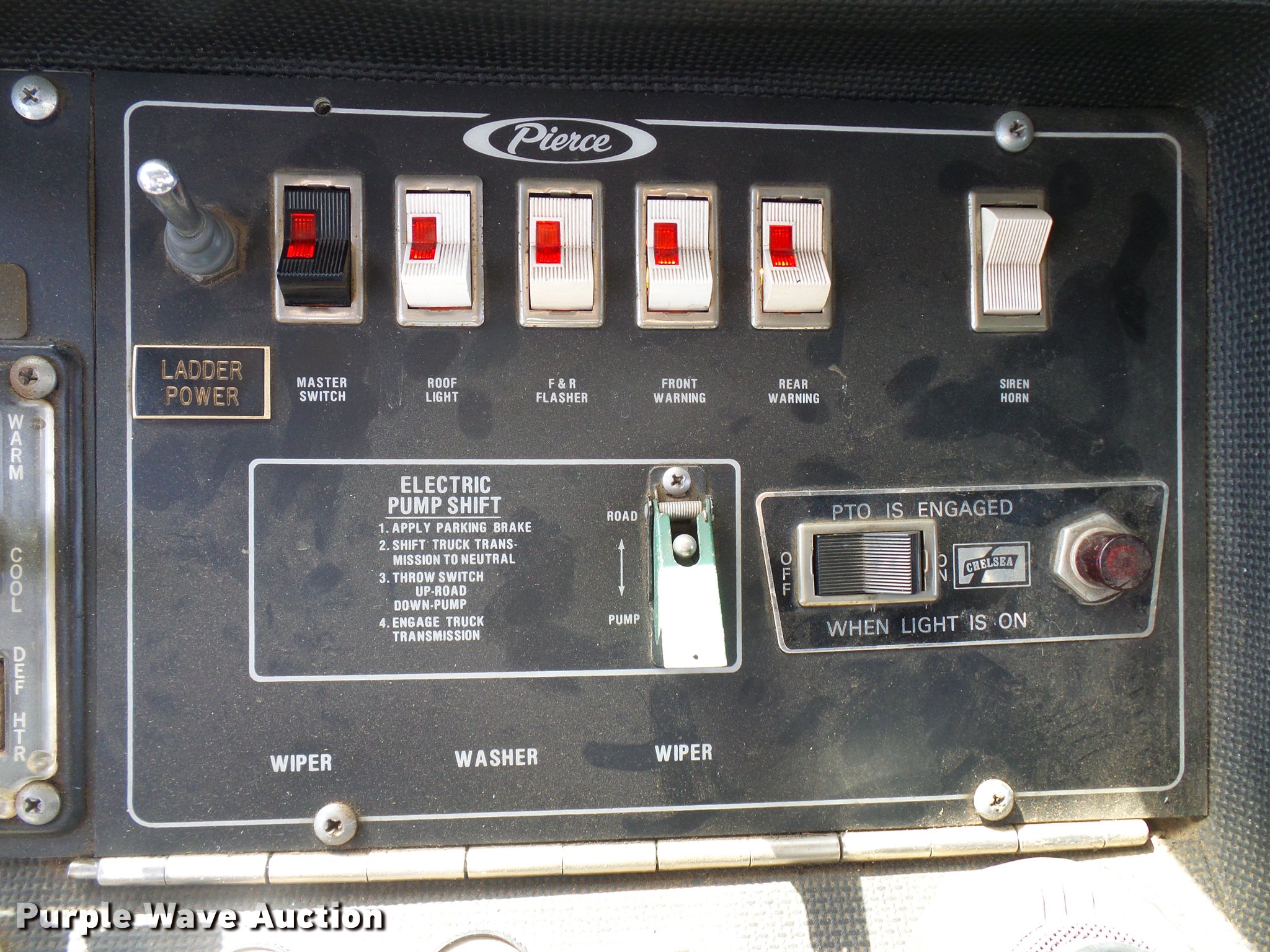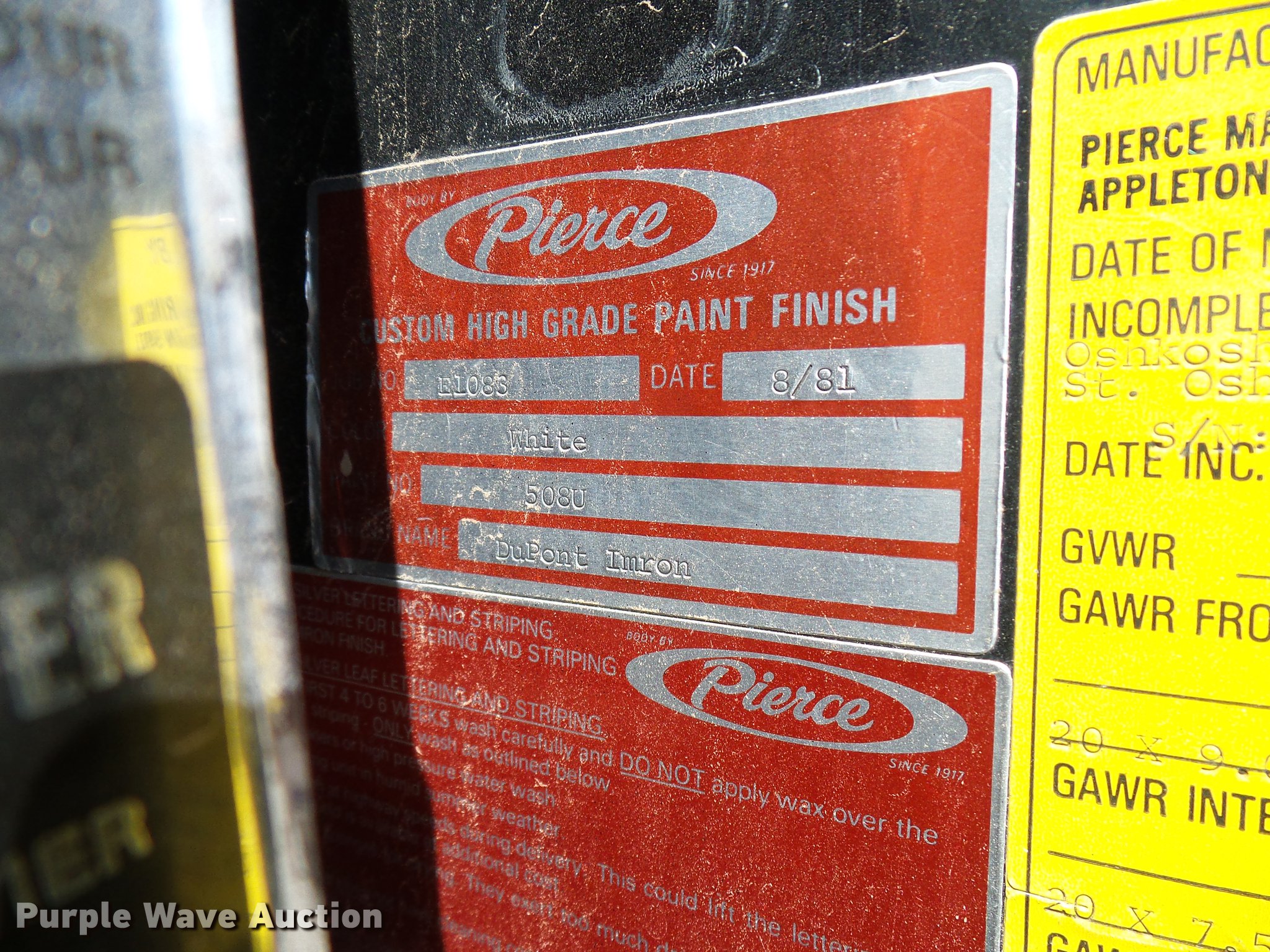 Purple Wave is selling a used Fire Truck or Emergency Vehicle in Oklahoma. This item is a 1981 Pierce U-1844M fire truck with the following: 16,820 miles on odometer, 156,995 hours on meter, Detroit Diesel eight cylinder turbo diesele ngine, Automatic transmission, Inter-axle differential locks, Tandem axle, Heat, Suspension seat, Auxiliary controls, PTO, Pierce E-1083 platform, 1,250 gallon per minute pump, Ladder & Towers 3S-85 fire apparatus, Elevated control station, Water gun, Outlet box, Three section ladder, 85'L,, (4) outriggers, 232" wheelbase, Air brakes, 12R22.5 front tires, 10.00R20 rear tires, GVWR 62,000 lbs, Two way radio not included, Hydraulic leak