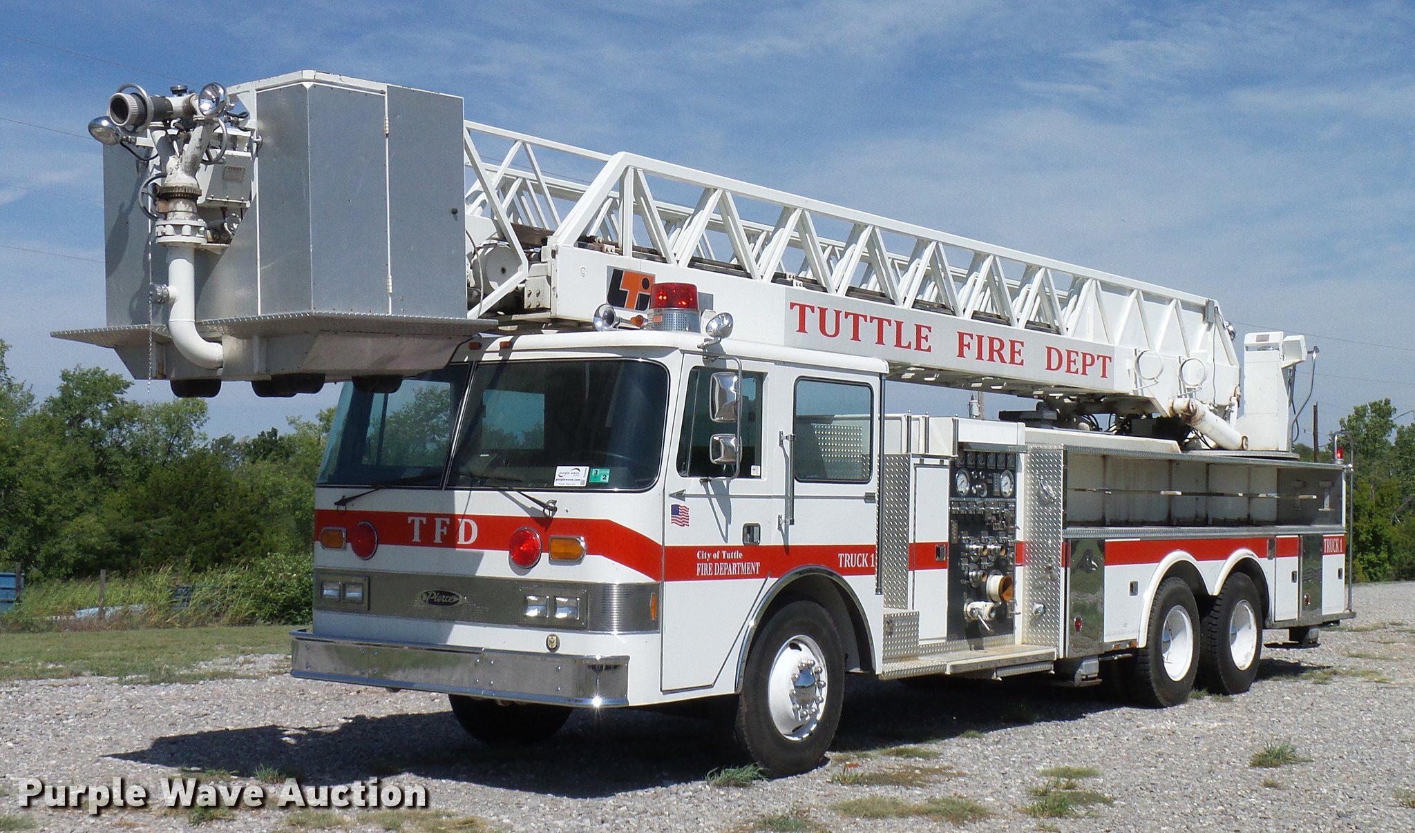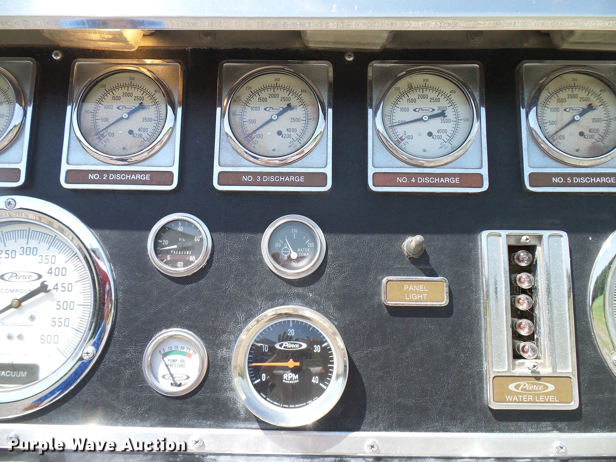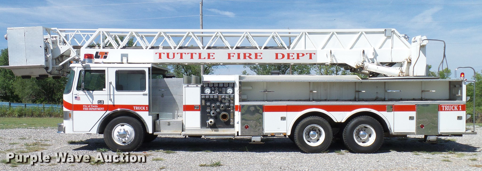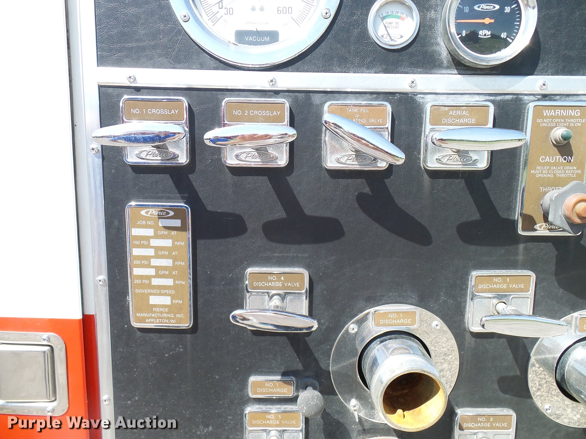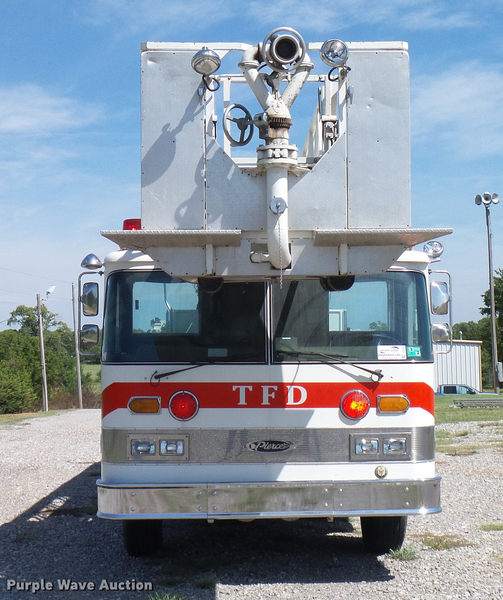 Purple Wave is selling a used Fire Truck or Emergency Vehicle in Oklahoma. This item is a 1981 Pierce U-1844M fire truck with the following: 16,820 miles on odometer, 156,995 hours on meter, Detroit Diesel eight cylinder turbo diesele ngine, Automatic transmission, Inter-axle differential locks, Tandem axle, Heat, Suspension seat, Auxiliary controls, PTO, Pierce E-1083 platform, 1,250 gallon per minute pump, Ladder & Towers 3S-85 fire apparatus, Elevated control station, Water gun, Outlet box, Three section ladder, 85'L,, (4) outriggers, 232" wheelbase, Air brakes, 12R22.5 front tires, 10.00R20 rear tires, GVWR 62,000 lbs, Two way radio not included, Hydraulic leak