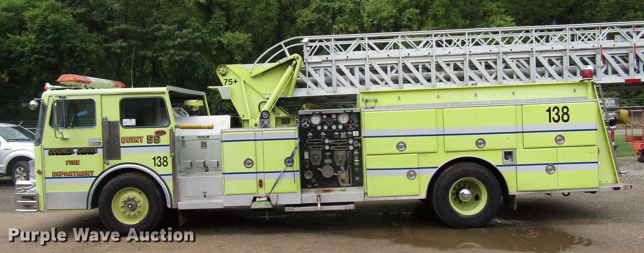 1984 Spartan Quint fire truck. 93,128 miles on odometer, 9,755 hours on meter, Detroit Diesel 8V92 turbo diesel engine, Automatic transmission, Single axle, Heat, Air horn, PTO, 1,250 gpm pump, Elevated control station, Electric cord reel, 75'L ladder, (2) outriggers, Air brakes, 315/80R22.5 front tires, 12R22.5 rear tires, Unit was last certified April 2011, Outriggers bleed off, need seals, Some rungs on ladder need to be replaced. Kansas title. S29RT6F03EC423705. City of Council Grove. 608 N Mission. Council Grove, KS 66846