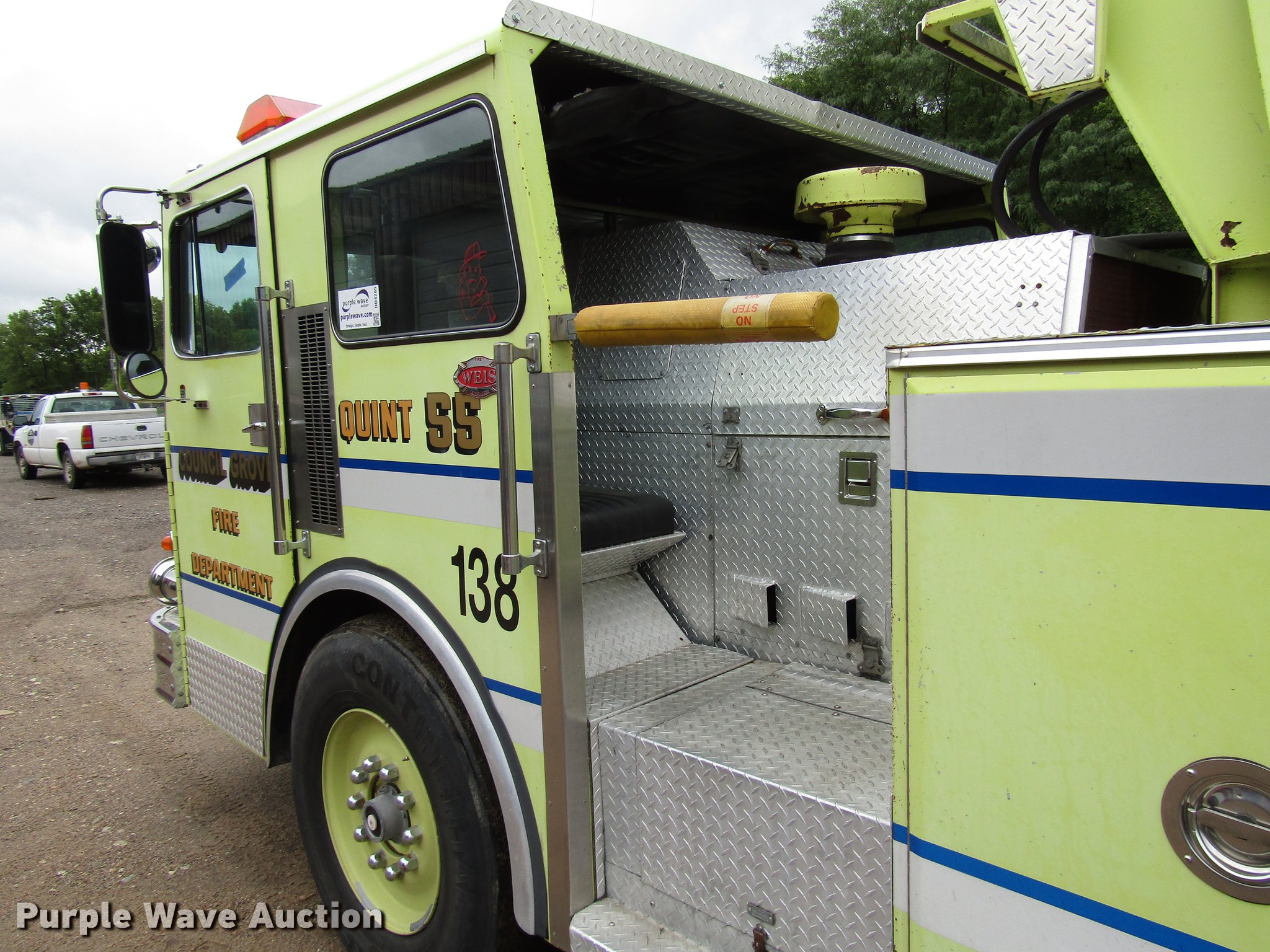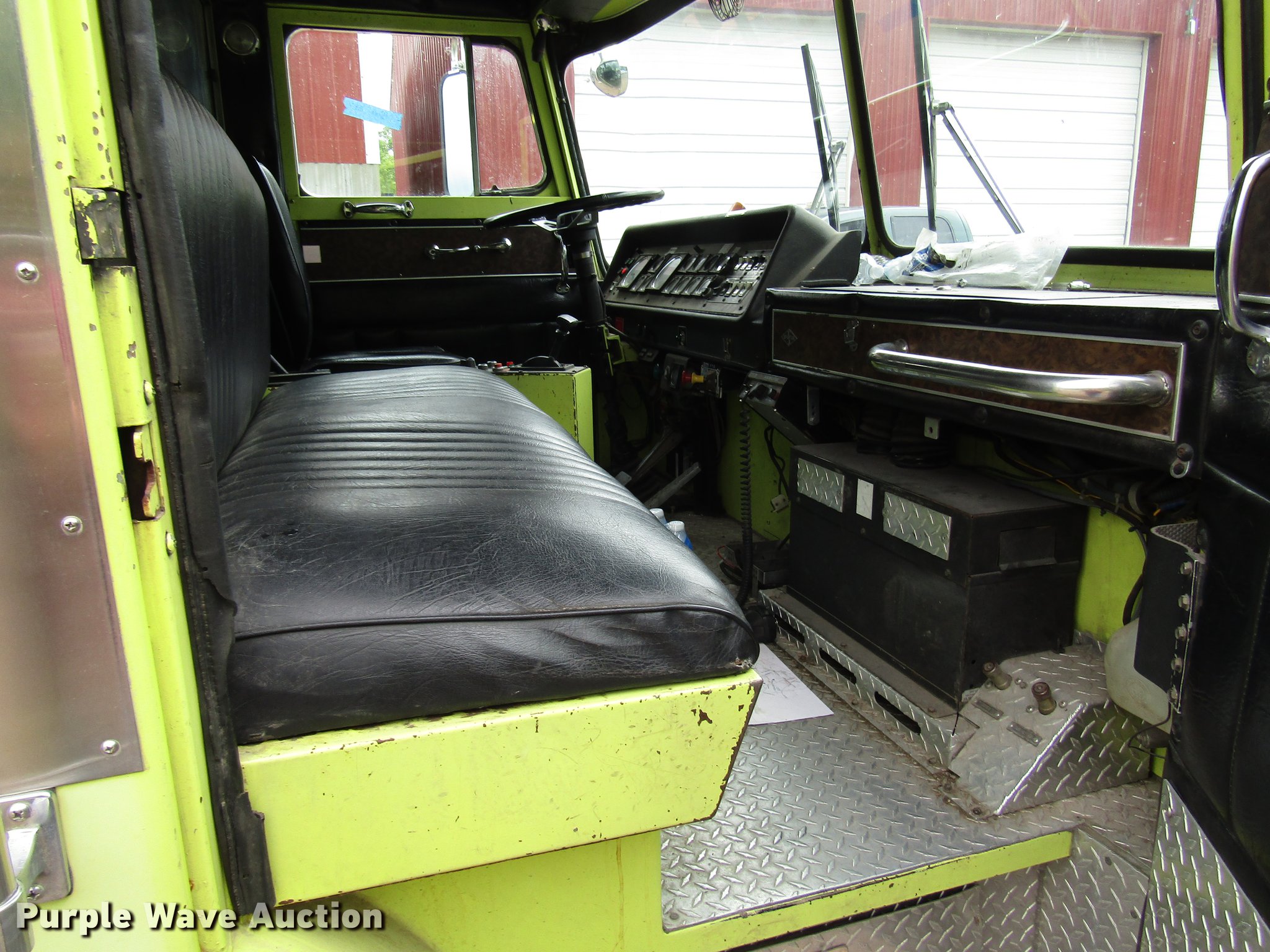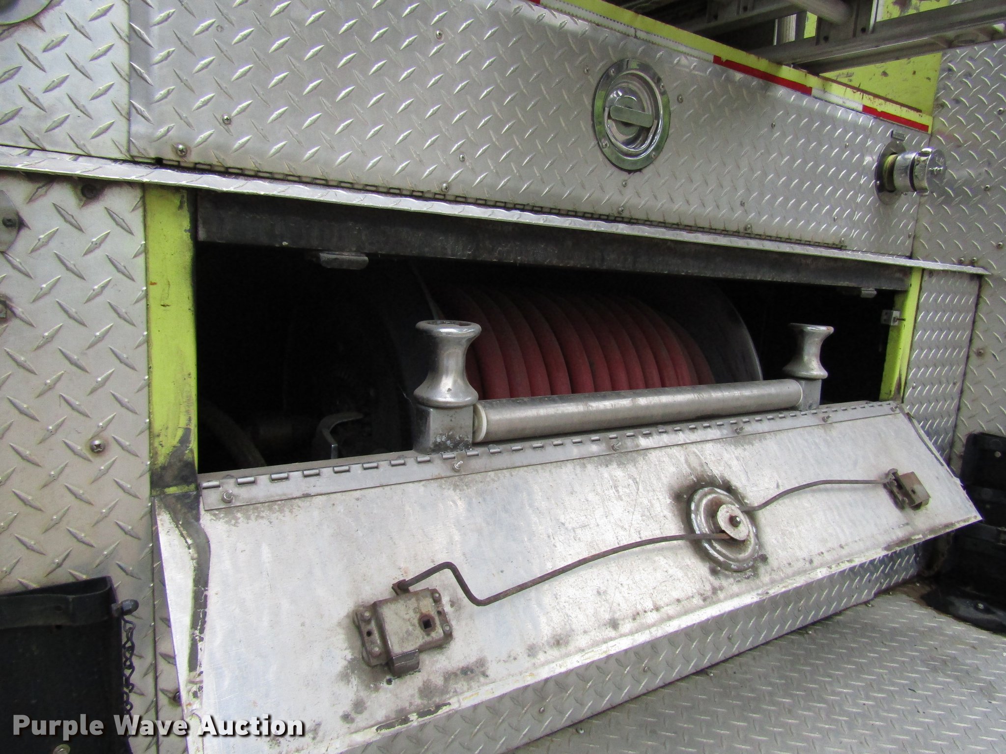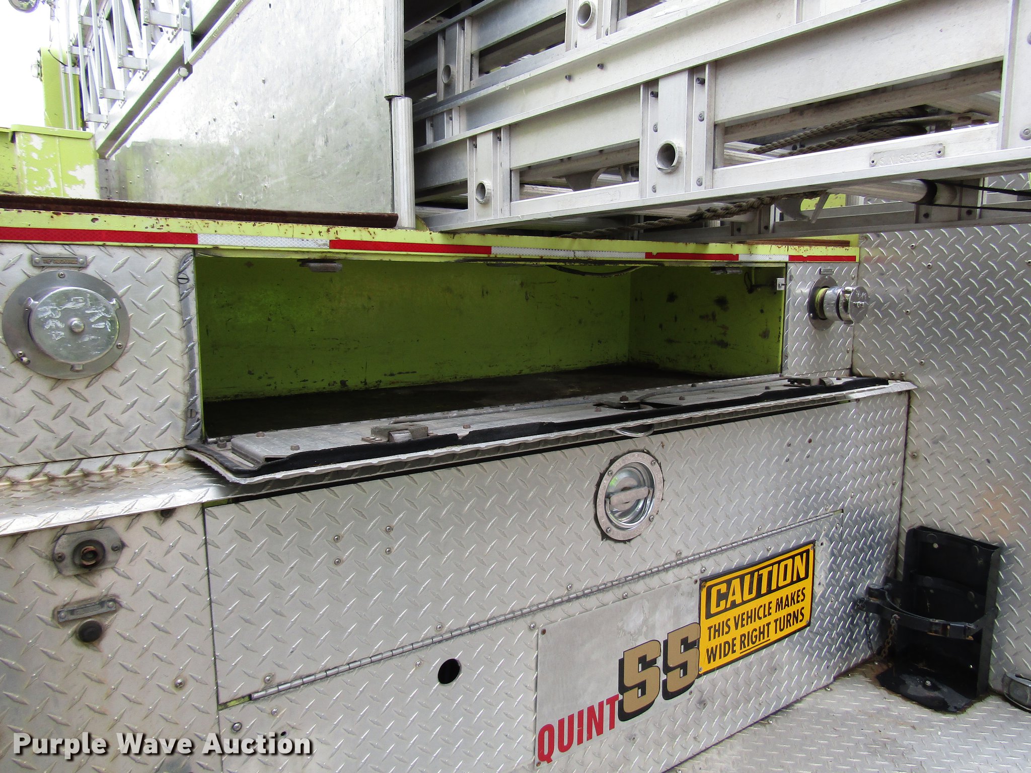 Purple Wave is selling a used Fire Truck or Emergency Vehicle in Kansas. This item is a 1984 Spartan Quint fire truck with the following: 93,128 miles on odometer, 9,755 hours on meter, Detroit Diesel 8V92 turbo diesel engine, Automatic transmission, Single axle, Heat, Air horn, PTO, 1,250 gpm pump, Elevated control station, Electric cord reel, 75'L ladder, (2) outriggers, Air brakes, 315/80R22.5 front tires, 12R22.5 rear tires, Unit was last certified April 2011, Outriggers bleed off, need seals, Some rungs on ladder need to be replaced
