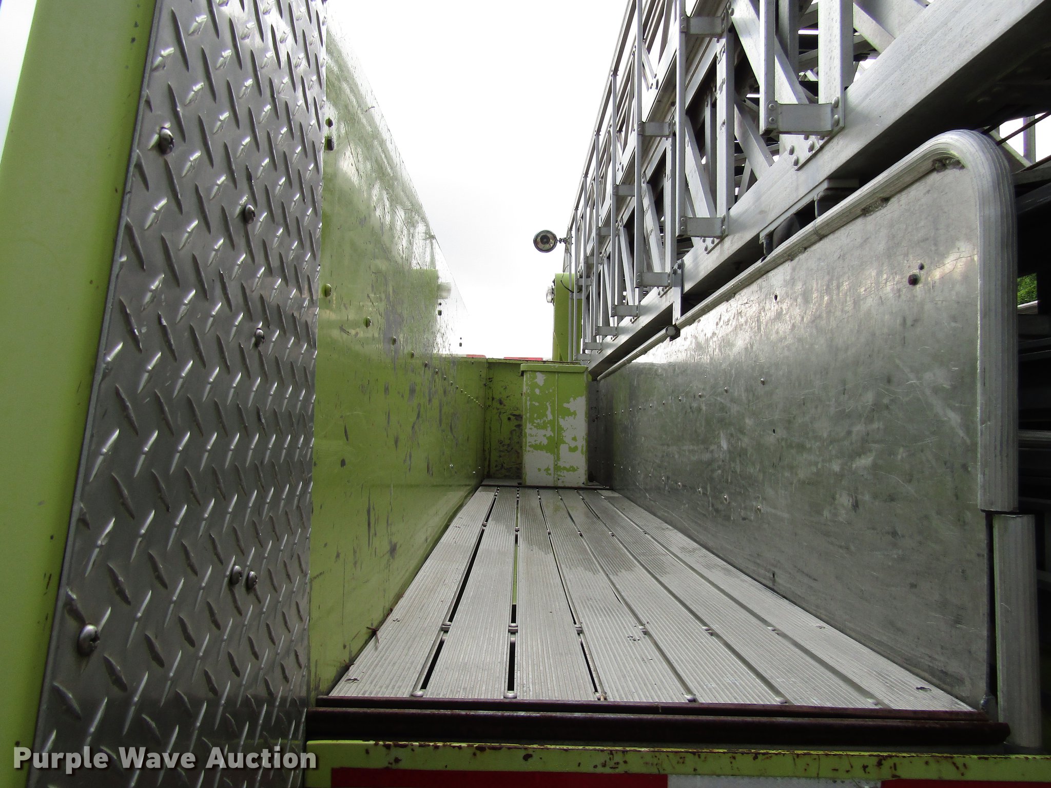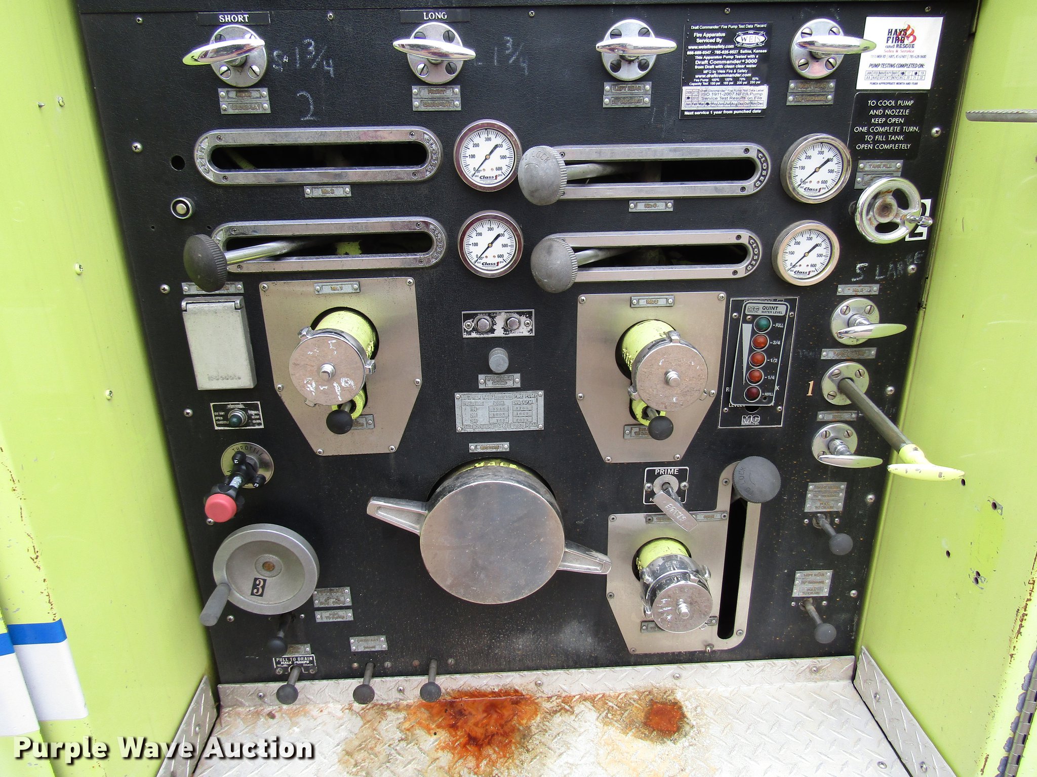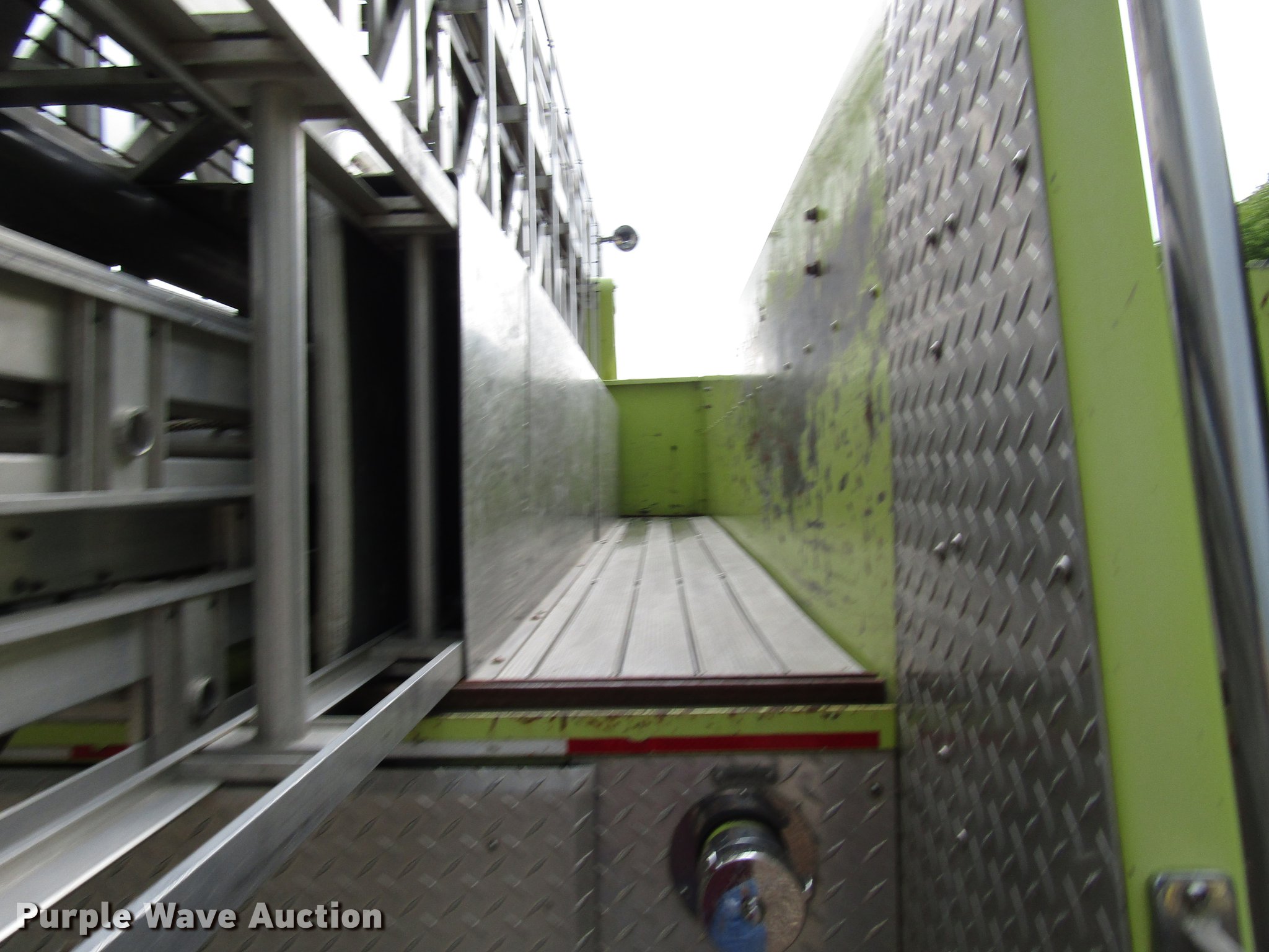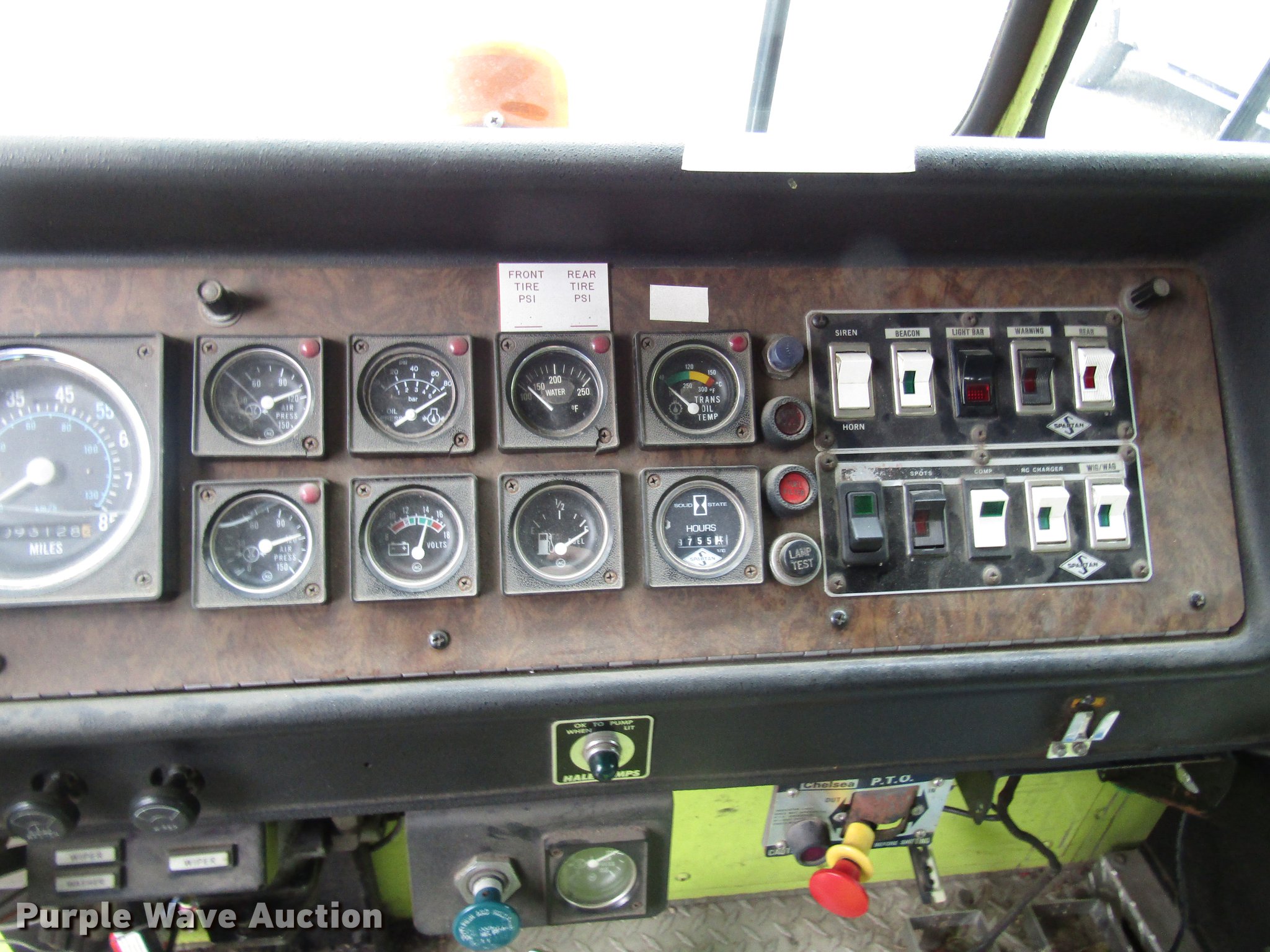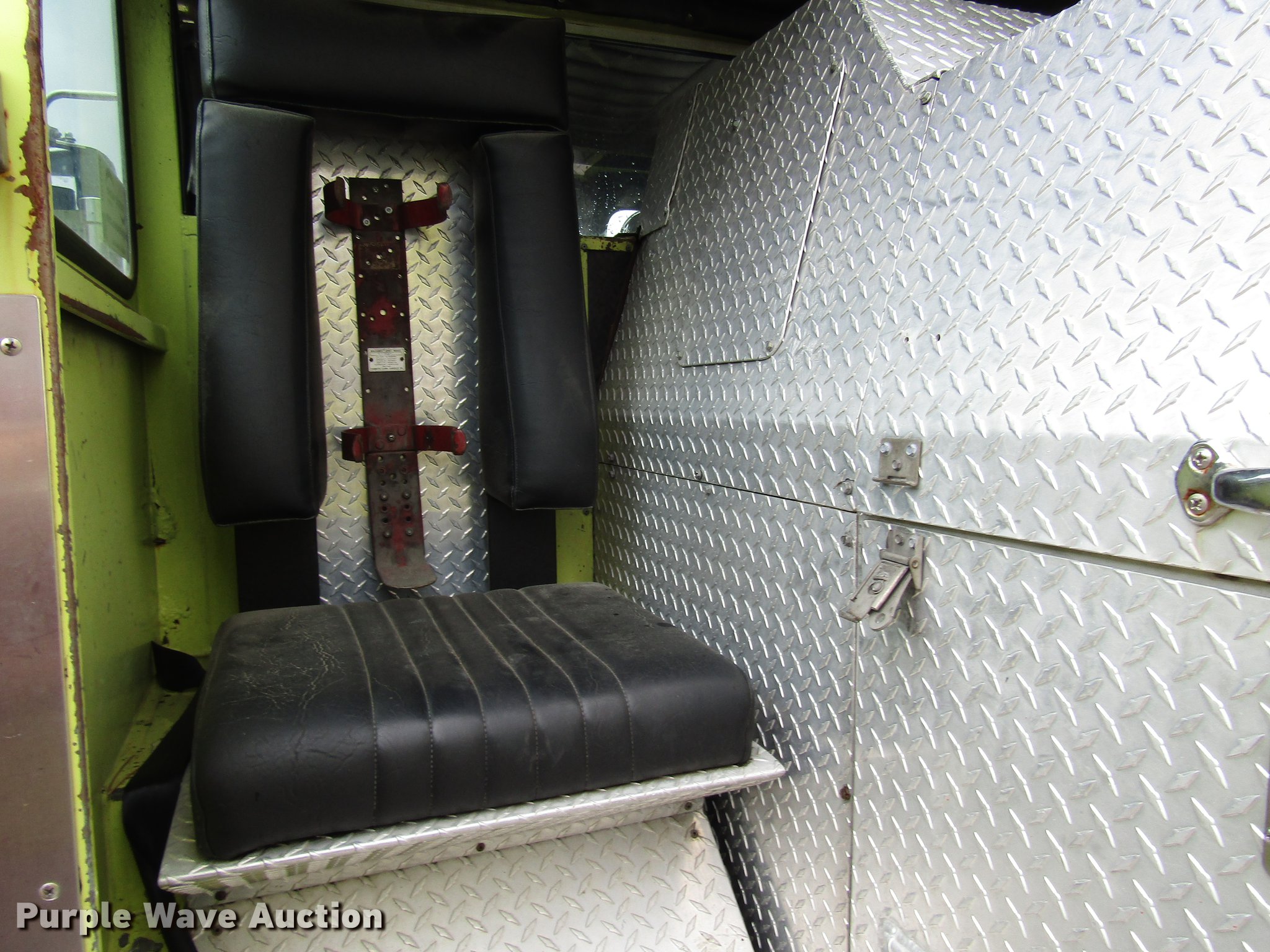 Purple Wave is selling a used Fire Truck or Emergency Vehicle in Kansas. This item is a 1984 Spartan Quint fire truck with the following: 93,128 miles on odometer, 9,755 hours on meter, Detroit Diesel 8V92 turbo diesel engine, Automatic transmission, Single axle, Heat, Air horn, PTO, 1,250 gpm pump, Elevated control station, Electric cord reel, 75'L ladder, (2) outriggers, Air brakes, 315/80R22.5 front tires, 12R22.5 rear tires, Unit was last certified April 2011, Outriggers bleed off, need seals, Some rungs on ladder need to be replaced
