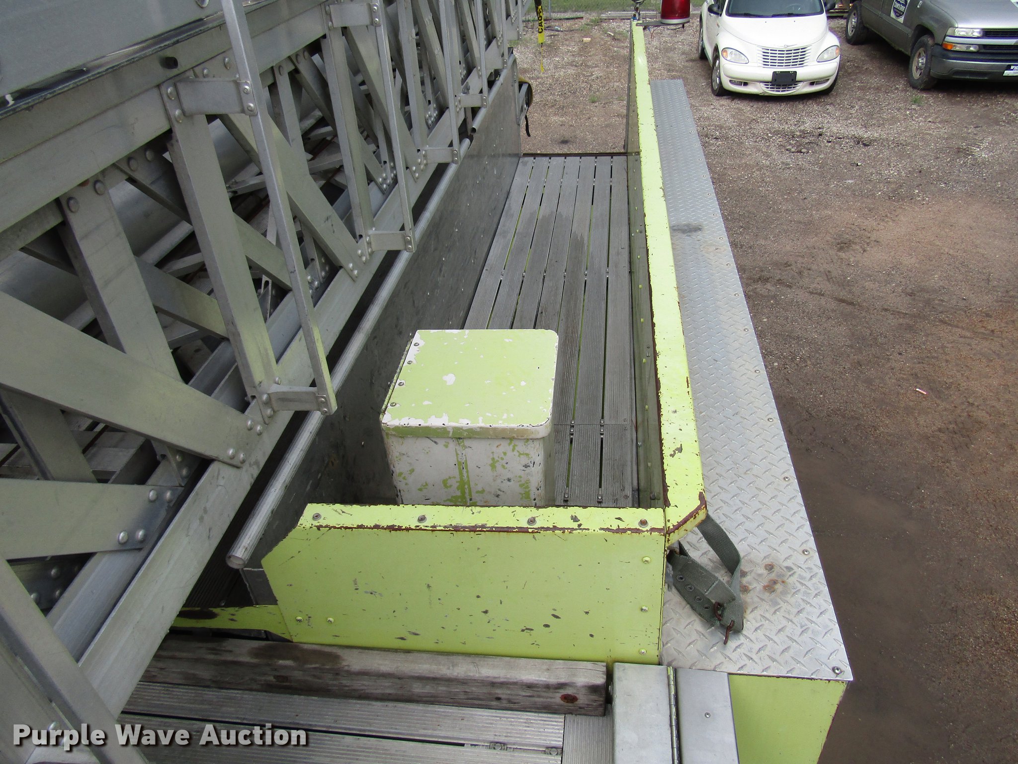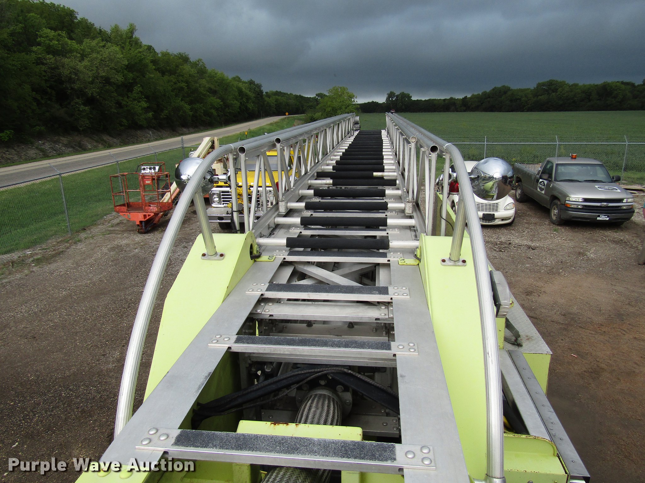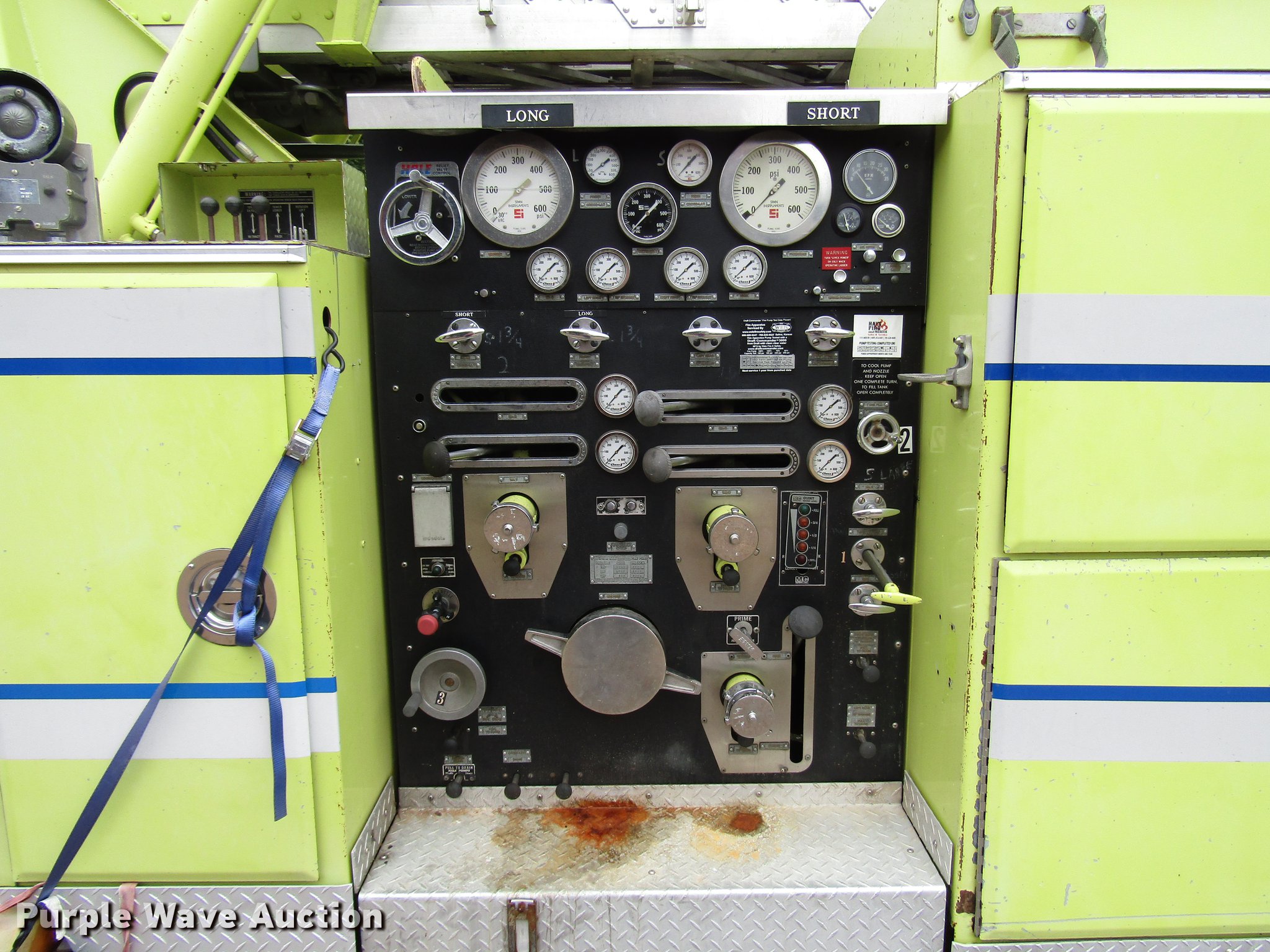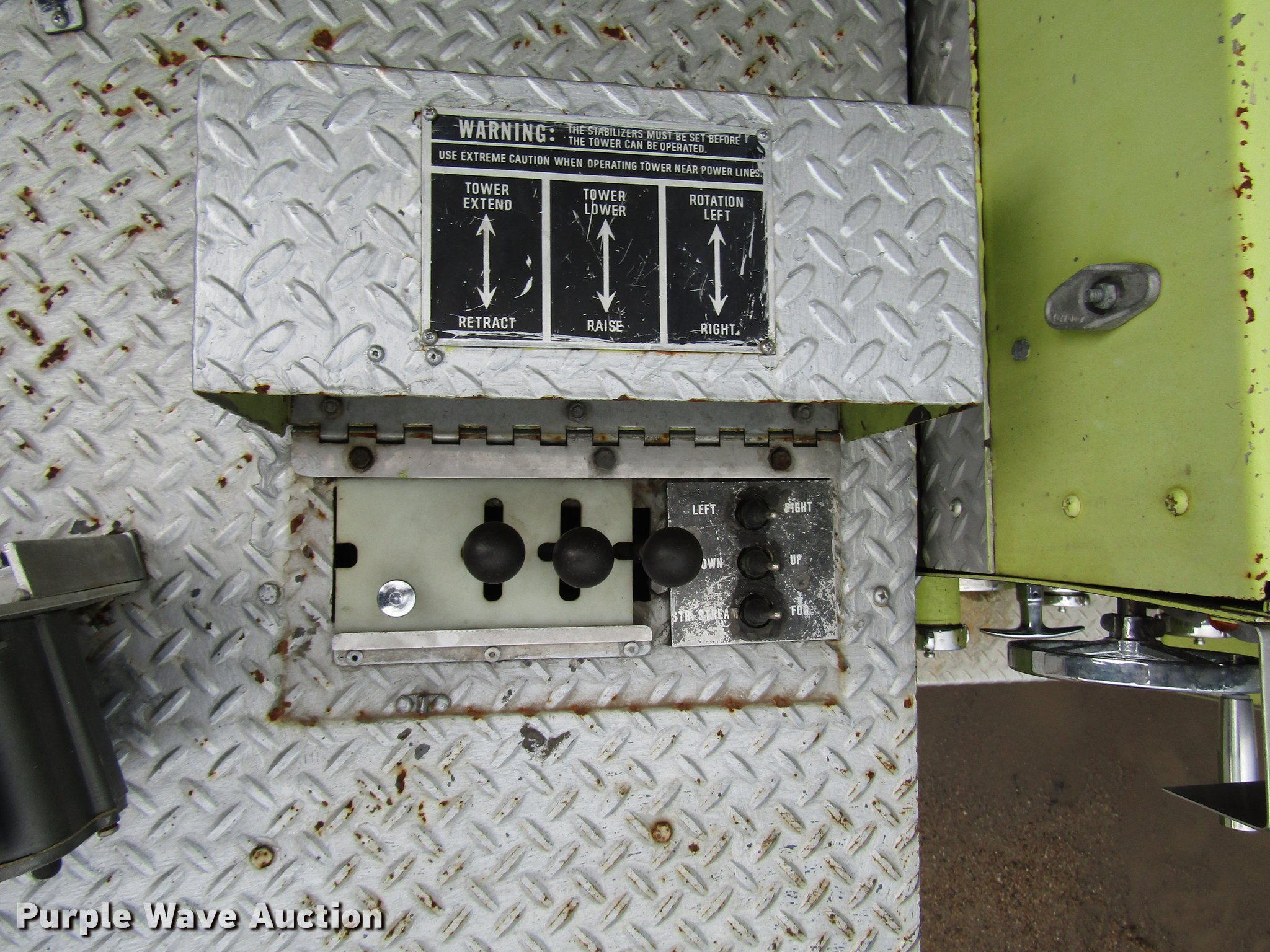 Purple Wave is selling a used Fire Truck or Emergency Vehicle in Kansas. This item is a 1984 Spartan Quint fire truck with the following: 93,128 miles on odometer, 9,755 hours on meter, Detroit Diesel 8V92 turbo diesel engine, Automatic transmission, Single axle, Heat, Air horn, PTO, 1,250 gpm pump, Elevated control station, Electric cord reel, 75'L ladder, (2) outriggers, Air brakes, 315/80R22.5 front tires, 12R22.5 rear tires, Unit was last certified April 2011, Outriggers bleed off, need seals, Some rungs on ladder need to be replaced