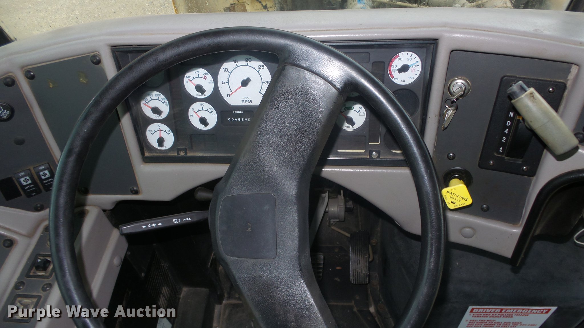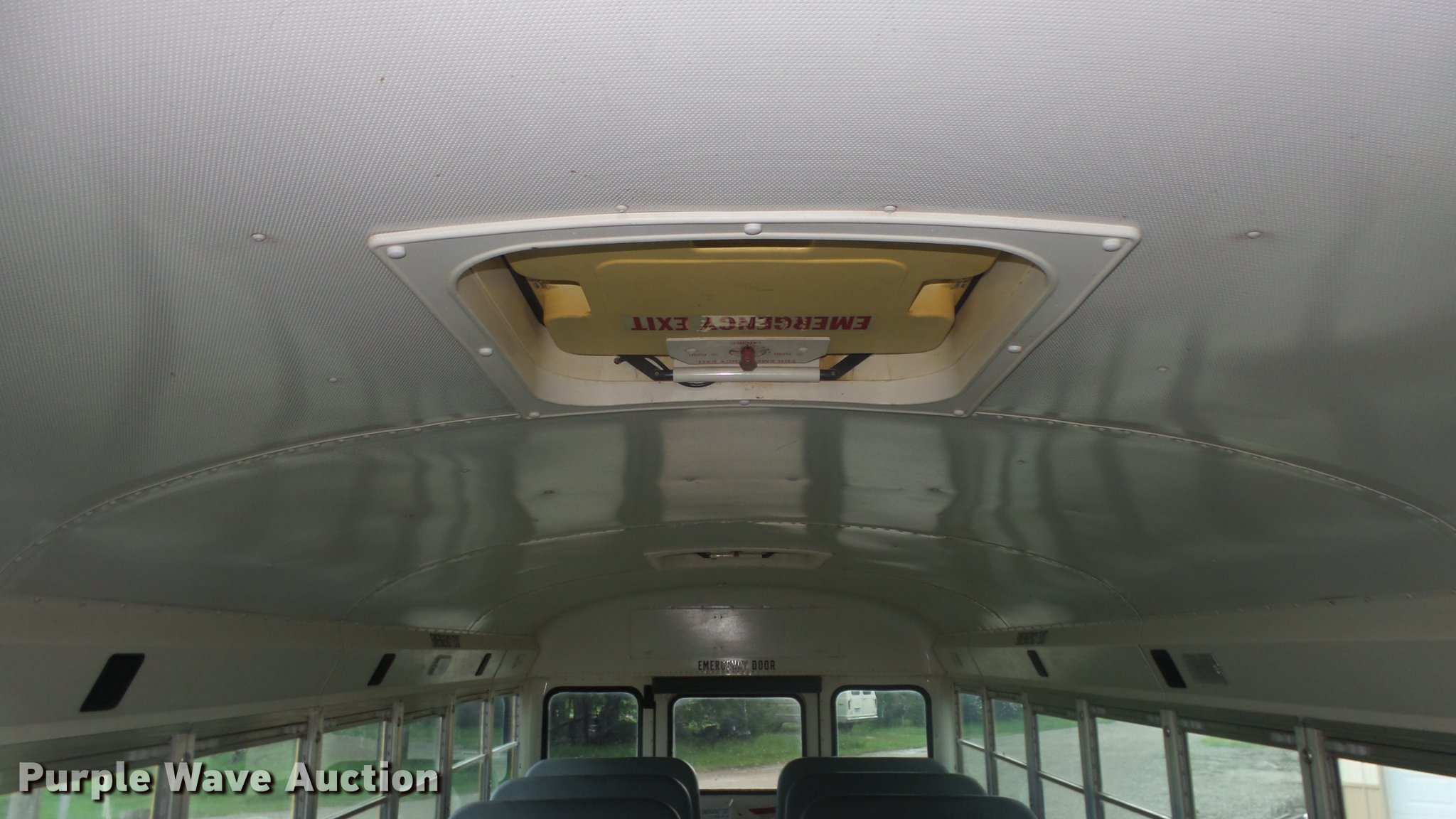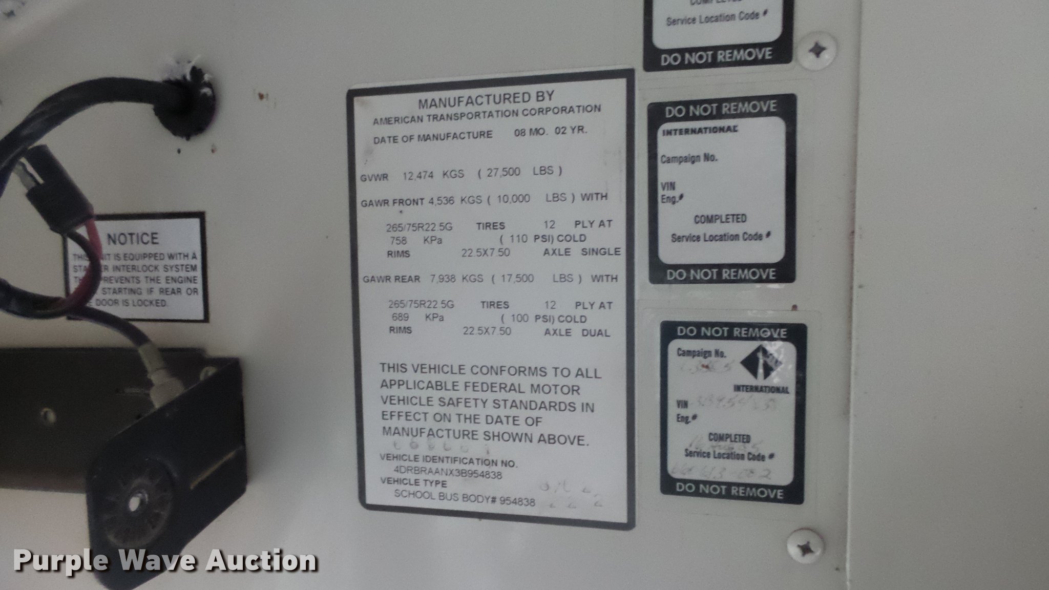 Purple Wave is selling a used Bus in Kansas. This item is a 2003 International CE school bus with the following: 123,729 miles on odometer, 4,556 hours on meter, International DT466 7.6L L6 diesel engine, Automatic transmission, Heat, AM/FM, Vinyl interior, Ceiling, rear, and side emergency exits, Air brakes, 10R22.5 tires