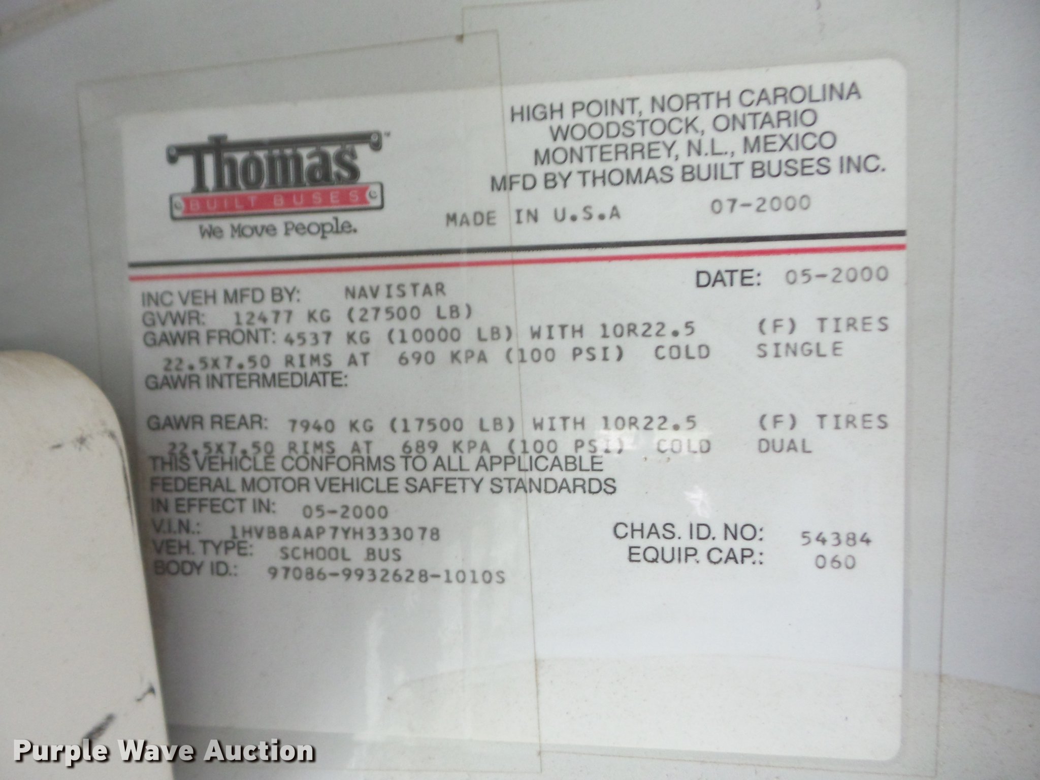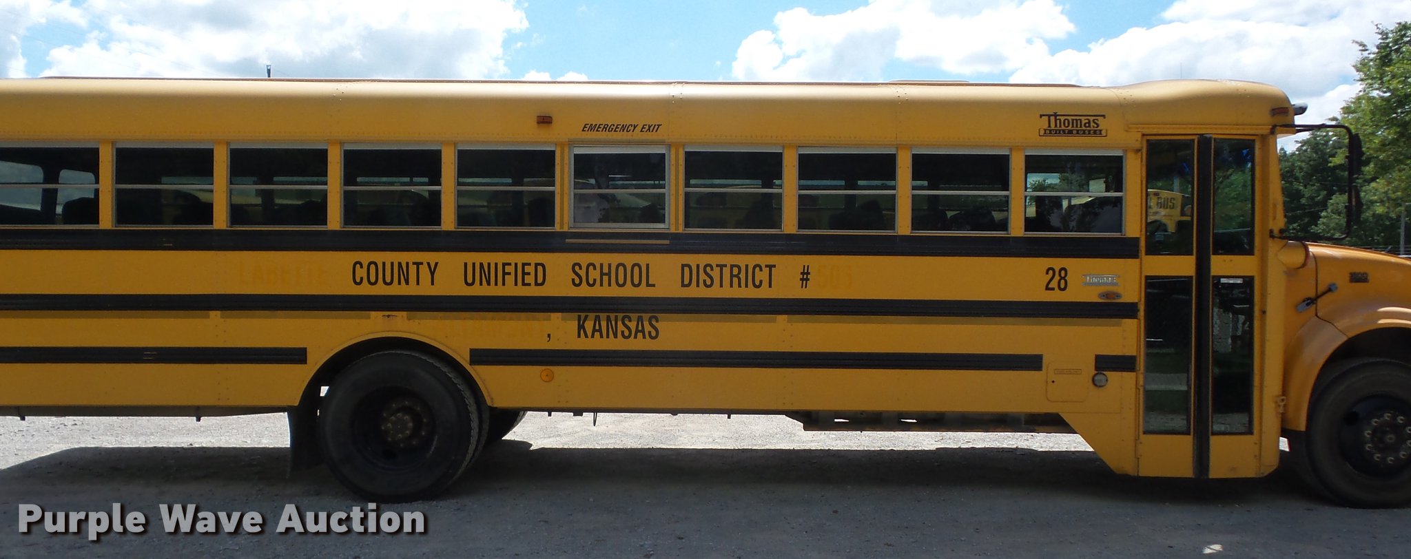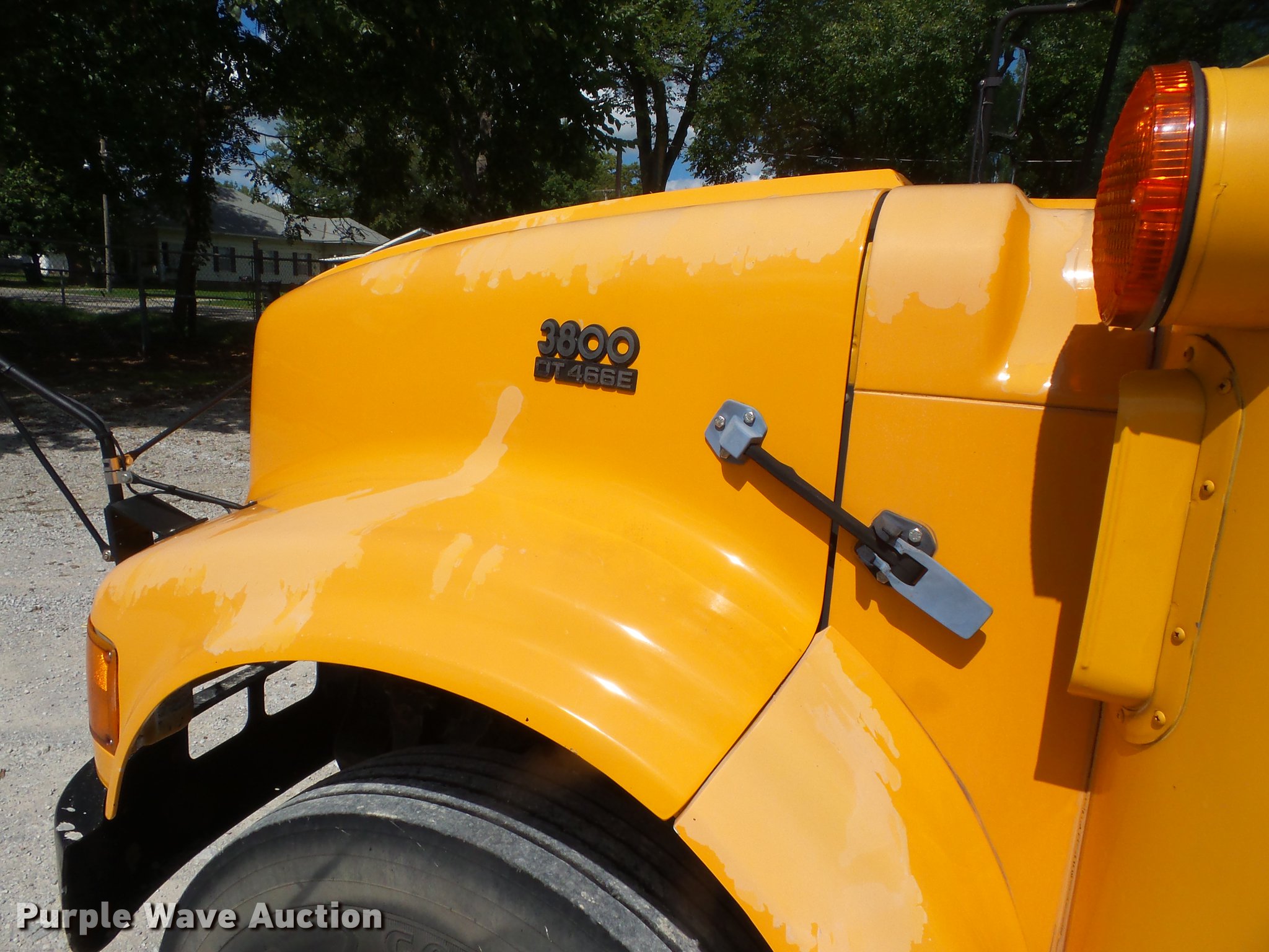 Purple Wave is selling a used Bus in Kansas. This item is a 2000 International 3800 school bus with the following: 202,571 miles on odometer, 6,679 hours on meter, International DT466E 7.6L L6 turbo diesel engine, Automatic transmission, Single axle, Heat, Heated mirrors, Suspension seat, 60 passenger capacity, Ceiling, front, rear, and side emergency exits, Lighted stop sign, Block heater, 10R22.5 tires, GVWR 27,500 lbs, Unit# 28