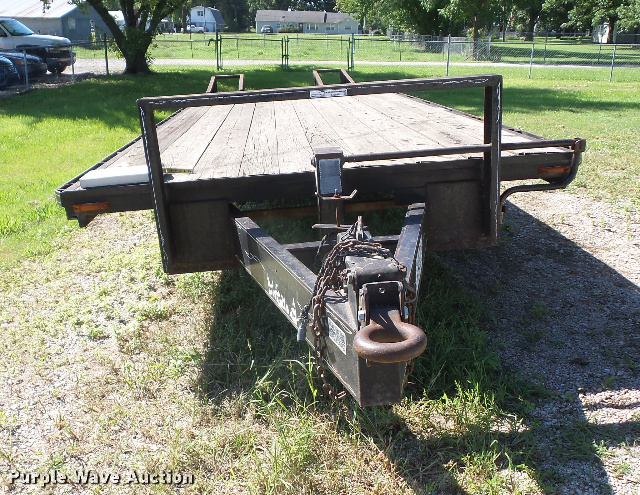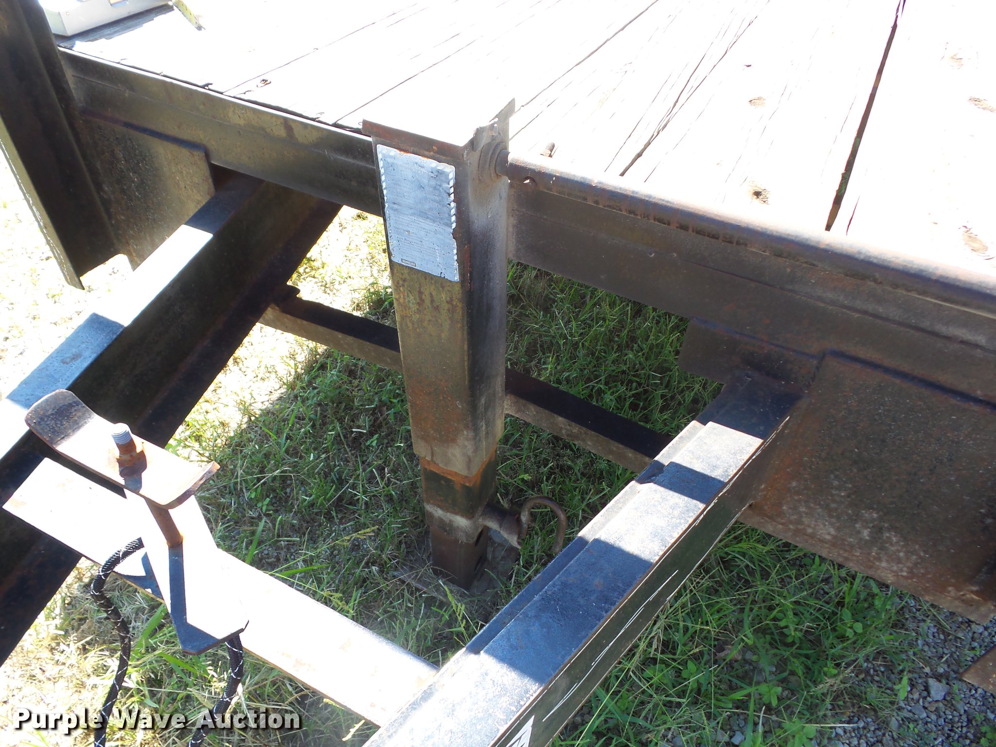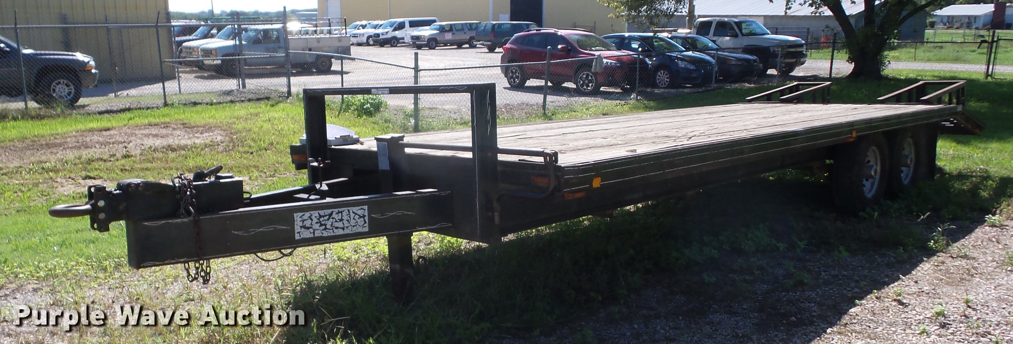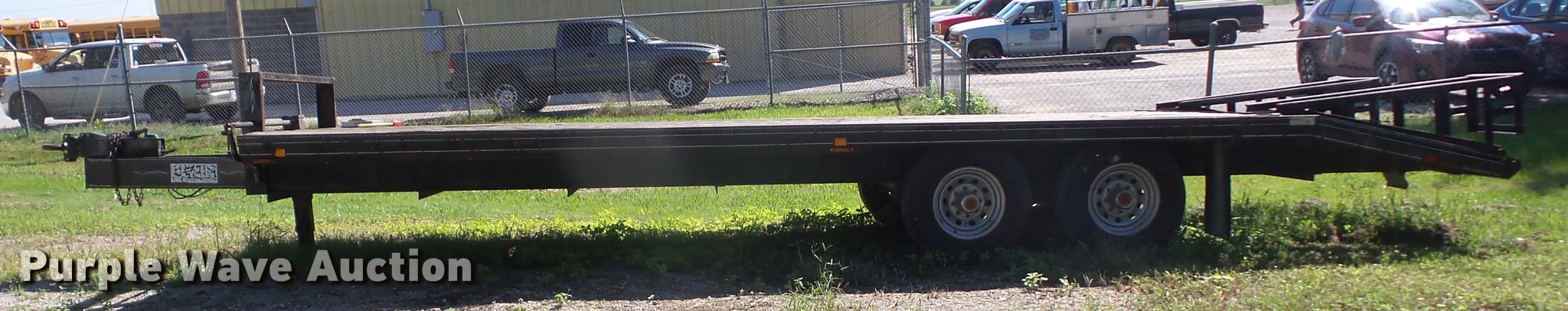 Purple Wave is selling a used Equip. Trailer in Kansas. This item is a 1993 Blair equipment trailer with the following: 24'7" overall length, 20'L x 96"W wood deck, 4'7"L dovetail, 5'L ramps, Stake side pockets, Pintle hitch, Single leg landing gear, Spring suspension, Hydraulic brakes, Tandem axle, Steel wheels, LT235/85R16 tires