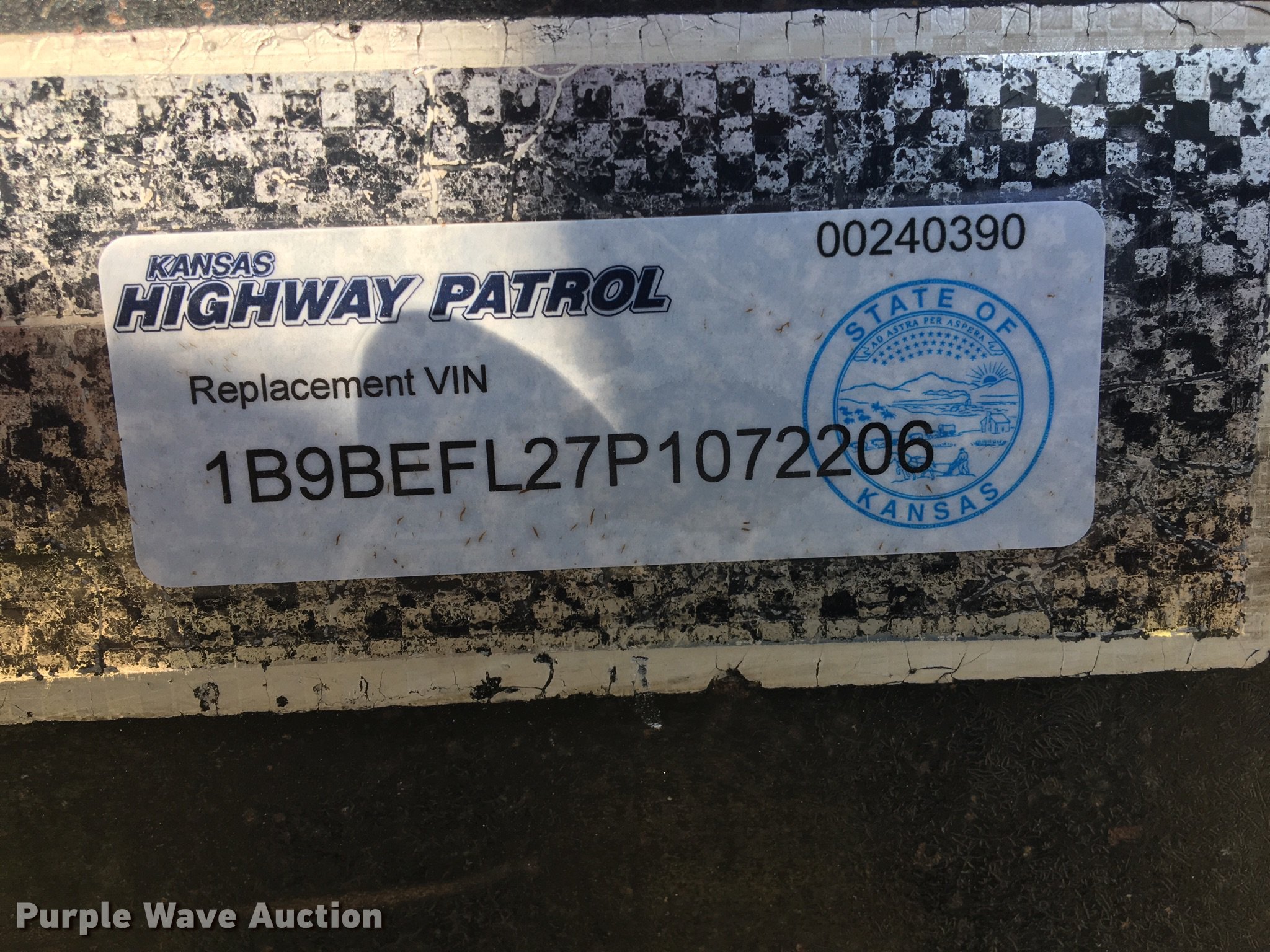1993 Blair equipment trailer. 24'7" overall length, 20'L x 96"W wood deck, 4'7"L dovetail, 5'L ramps, Stake side pockets, Pintle hitch, Single leg landing gear, Spring suspension, Hydraulic brakes, Tandem axle, Steel wheels, LT235/85R16 tires. Kansas title. Title distribution may be delayed up to 14 days from verification of funds. 1B9BEFL27P1072206. USD 506. 1019 E 6th St. Altamont, KS 67330