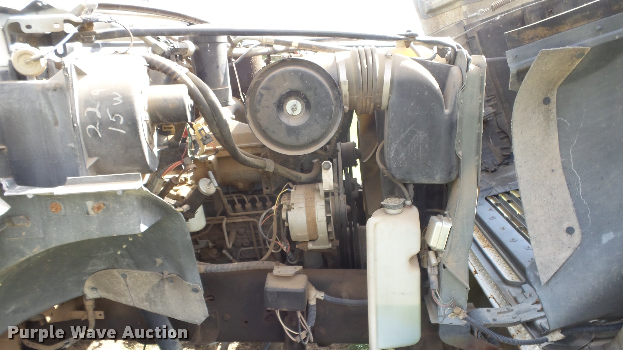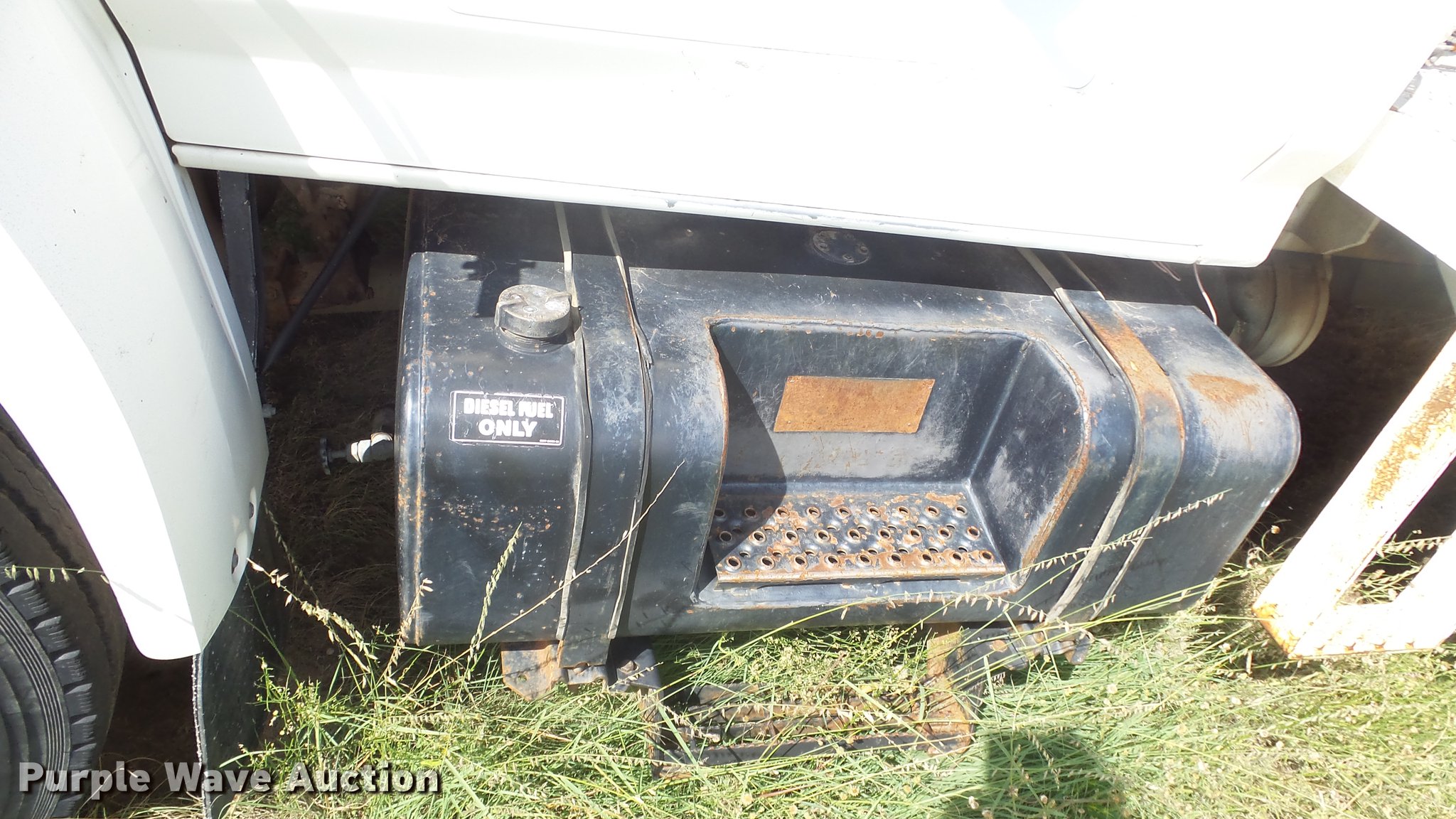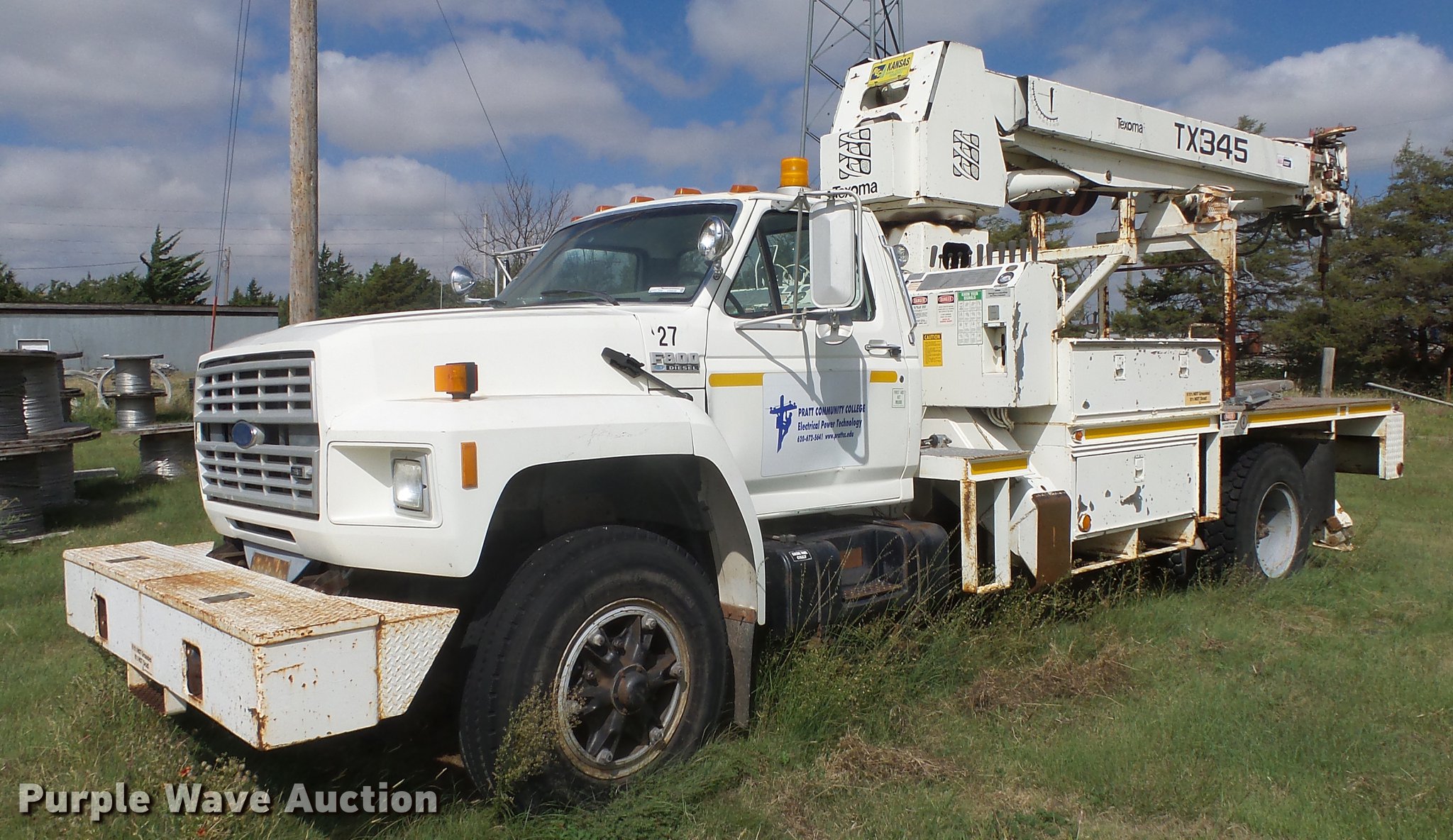 1991 Ford F800 digger derrick truck. 101,225 miles on odometer, 7.8L L6 turbo diesel engine, Automatic transmission, AC and heat, AM/FM, Manual windows and locks, Vinyl interior, Brake controller, Munice PTO, UEC TX344B2 digger derrick bed Approx. 14'L x 8'W, Steel deck, Toolboxes, Hydraulic hose reel, Left and right control stations, Texoma TX345 digger derrick Approx. 8'L x 16" diameter auger, 45' max lift height, 40' max reach length, Rope material handler, Outriggers, Pintle hitch, Trailer wiring, Air brakes, 10.00R20 tires, Dead battery, Hydraulic leak on digger. Kansas title. 1FDPK84A2MVA00368. Pratt Community College. Pratt, KS 67124