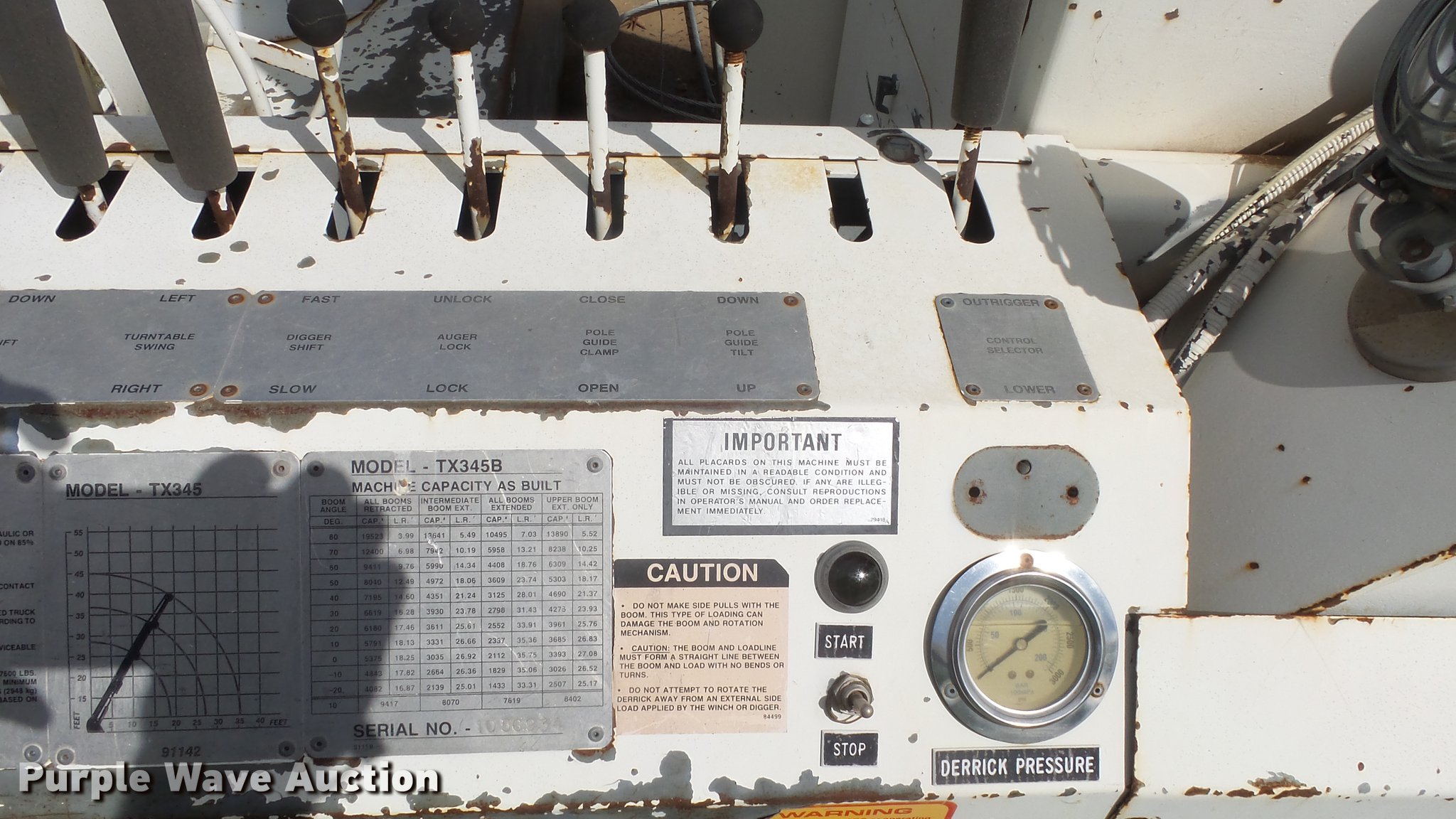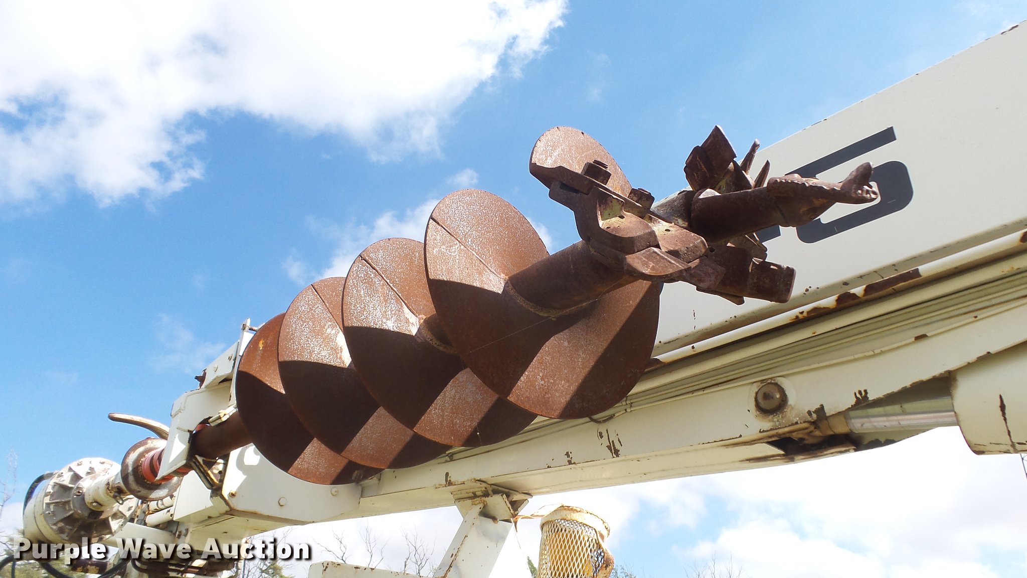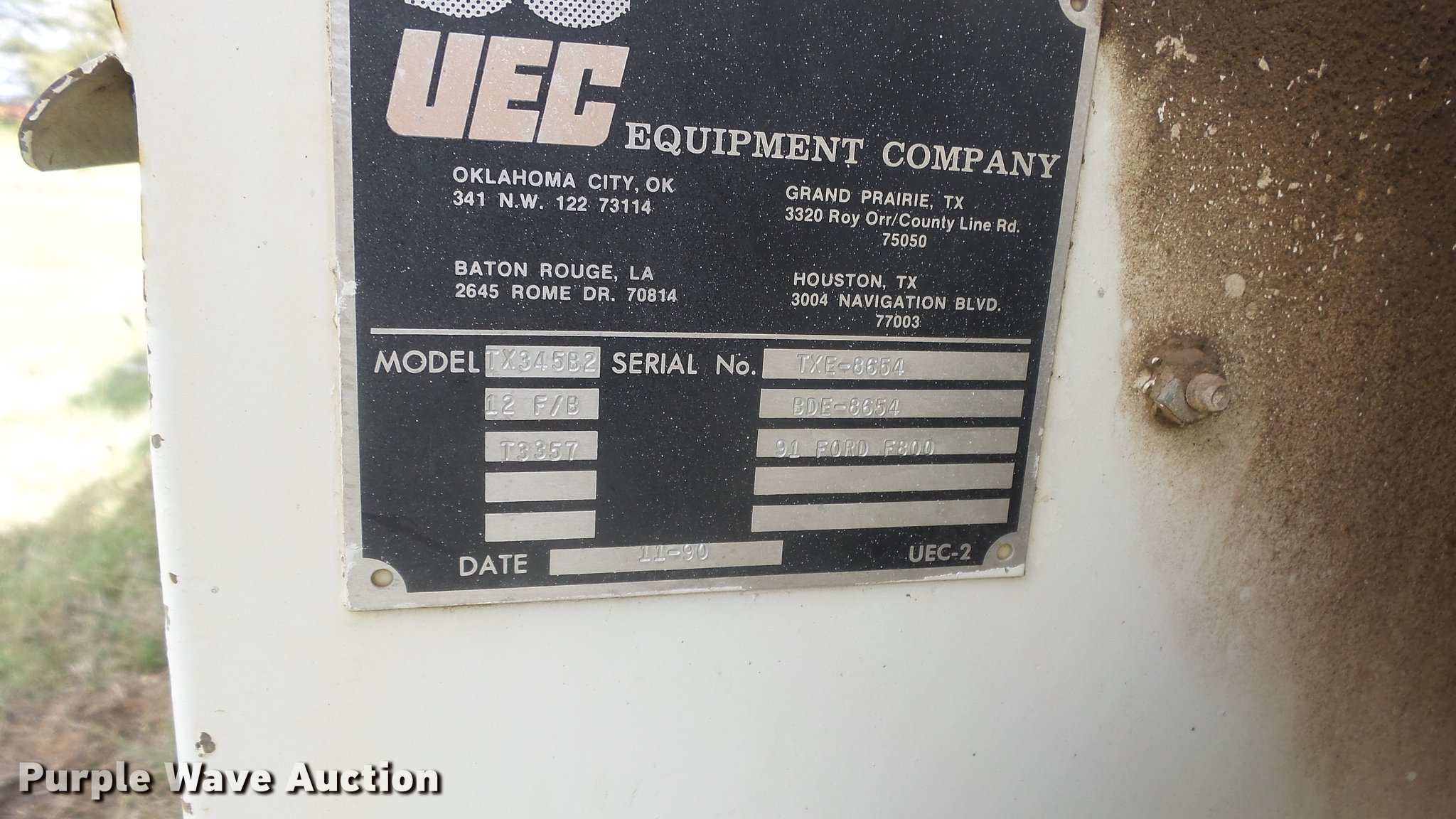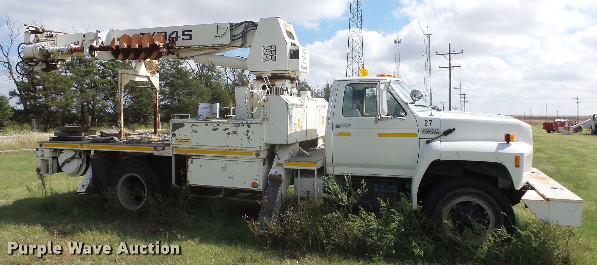 Purple Wave is selling a used Digger Derrick Truck in Kansas. This item is a 1991 Ford F800 digger derrick truck with the following: 101,225 miles on odometer, 7.8L L6 turbo diesel engine, Automatic transmission, AC and heat, AM/FM, Manual windows and locks, Vinyl interior, Brake controller, Munice PTO, UEC TX344B2 digger derrick bed, Approx. 14'L x 8'W, Steel deck, Toolboxes, Hydraulic hose reel, Left and right control stations, Texoma TX345 digger derrick, Approx. 8'L x 16" diameter auger, 45' max lift height, 40' max reach length, Rope material handler, Outriggers, Pintle hitch, Trailer wiring, Air brakes, 10.00R20 tires, Dead battery, Hydraulic leak on digger
