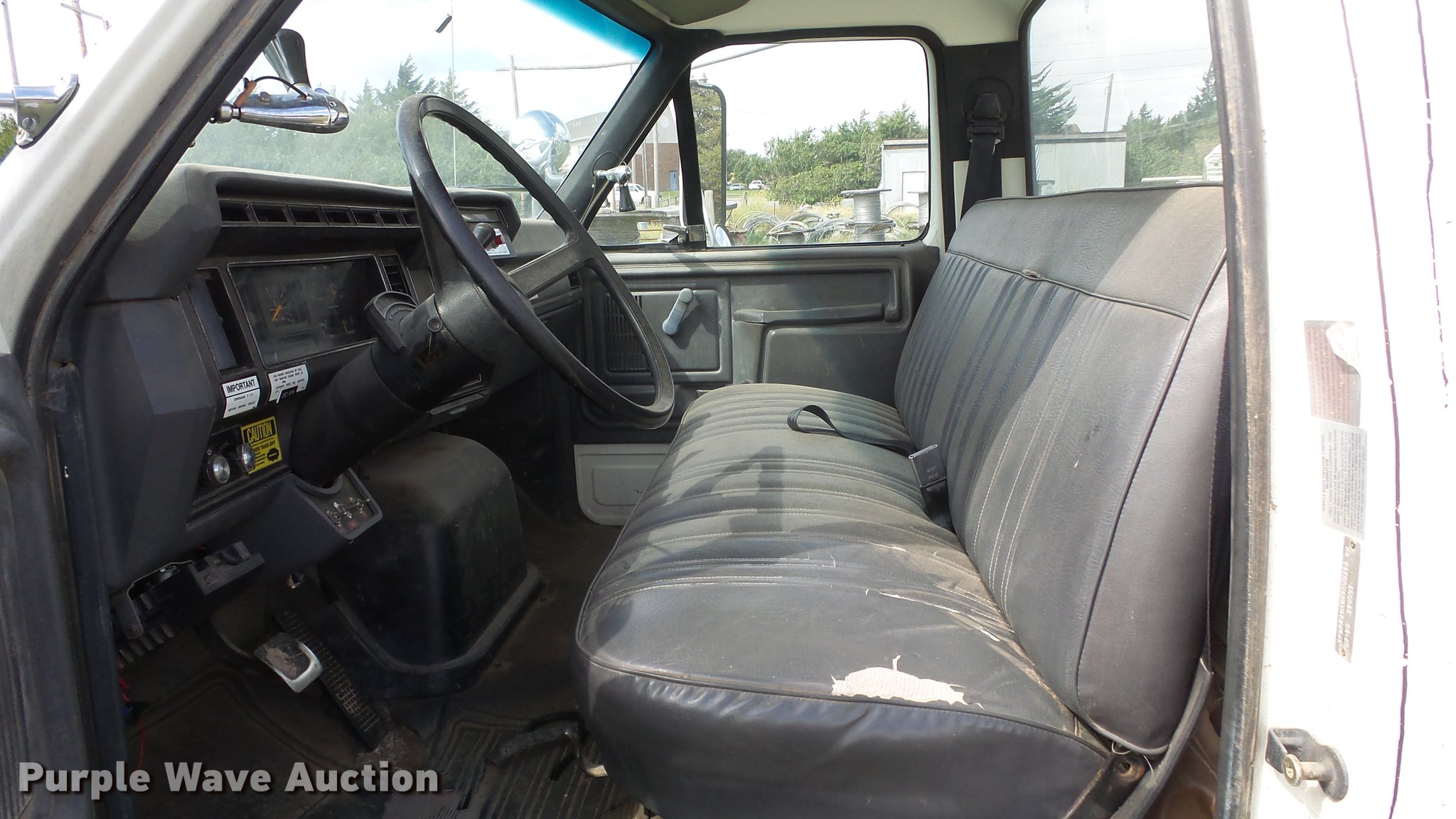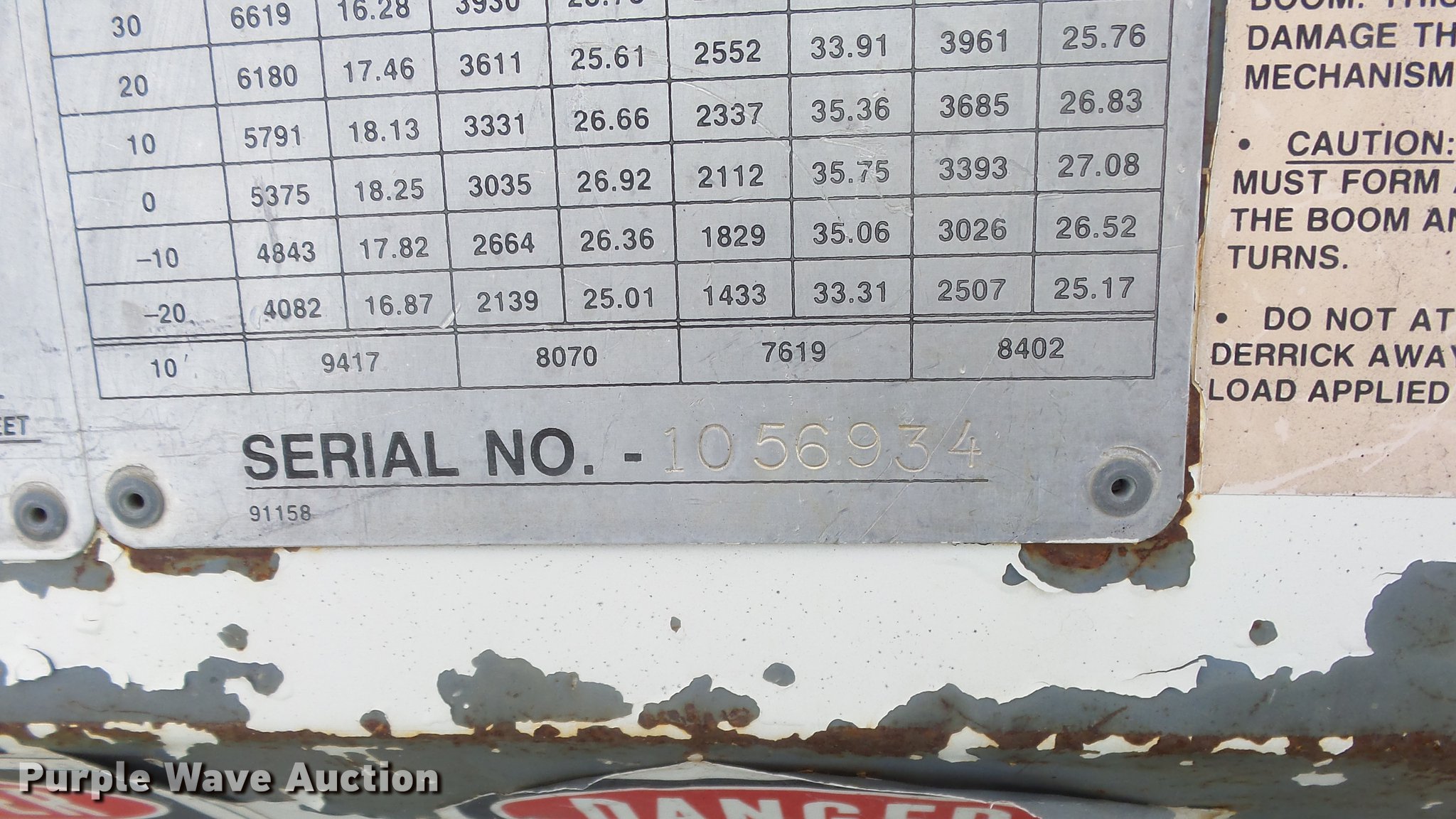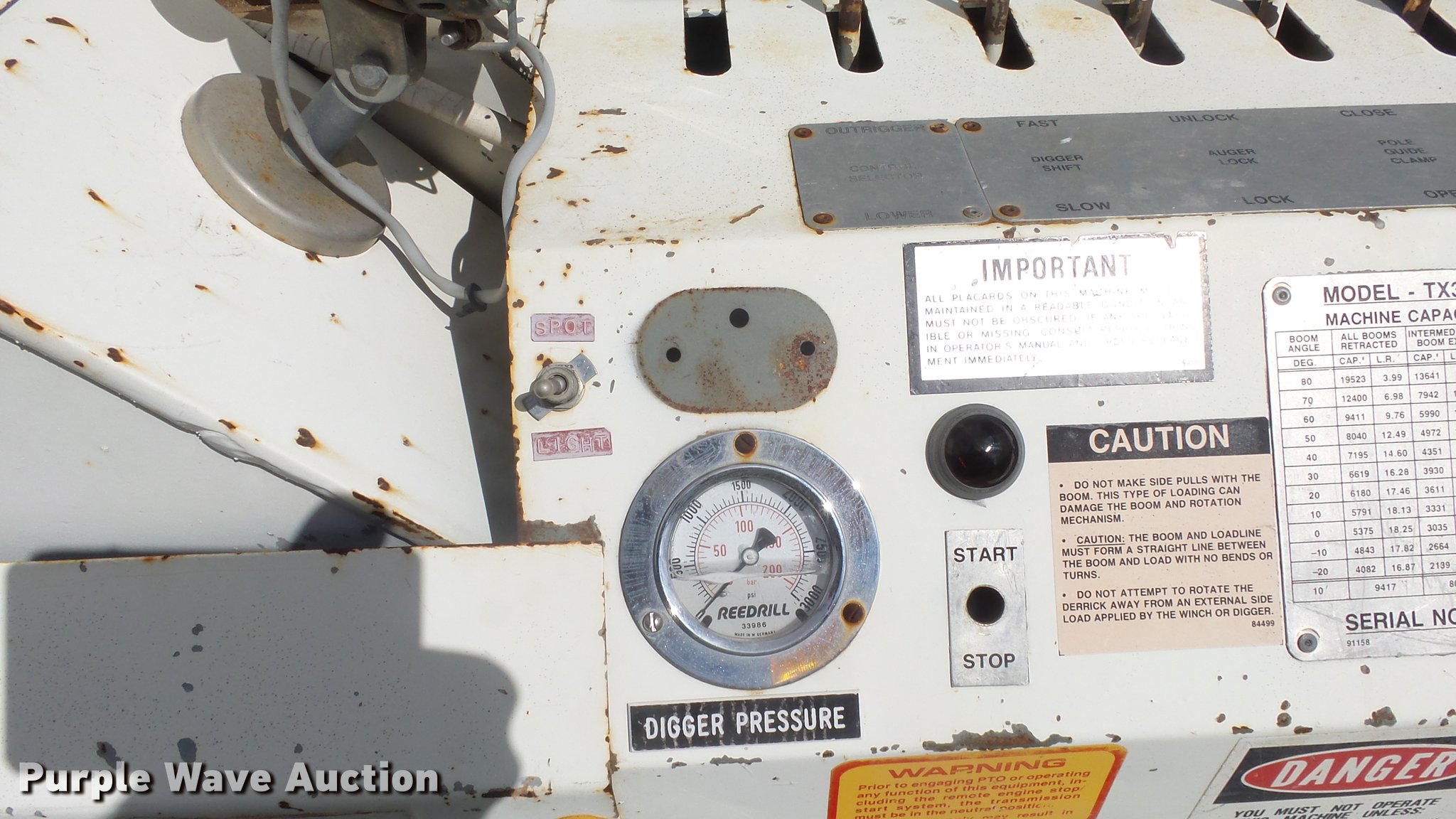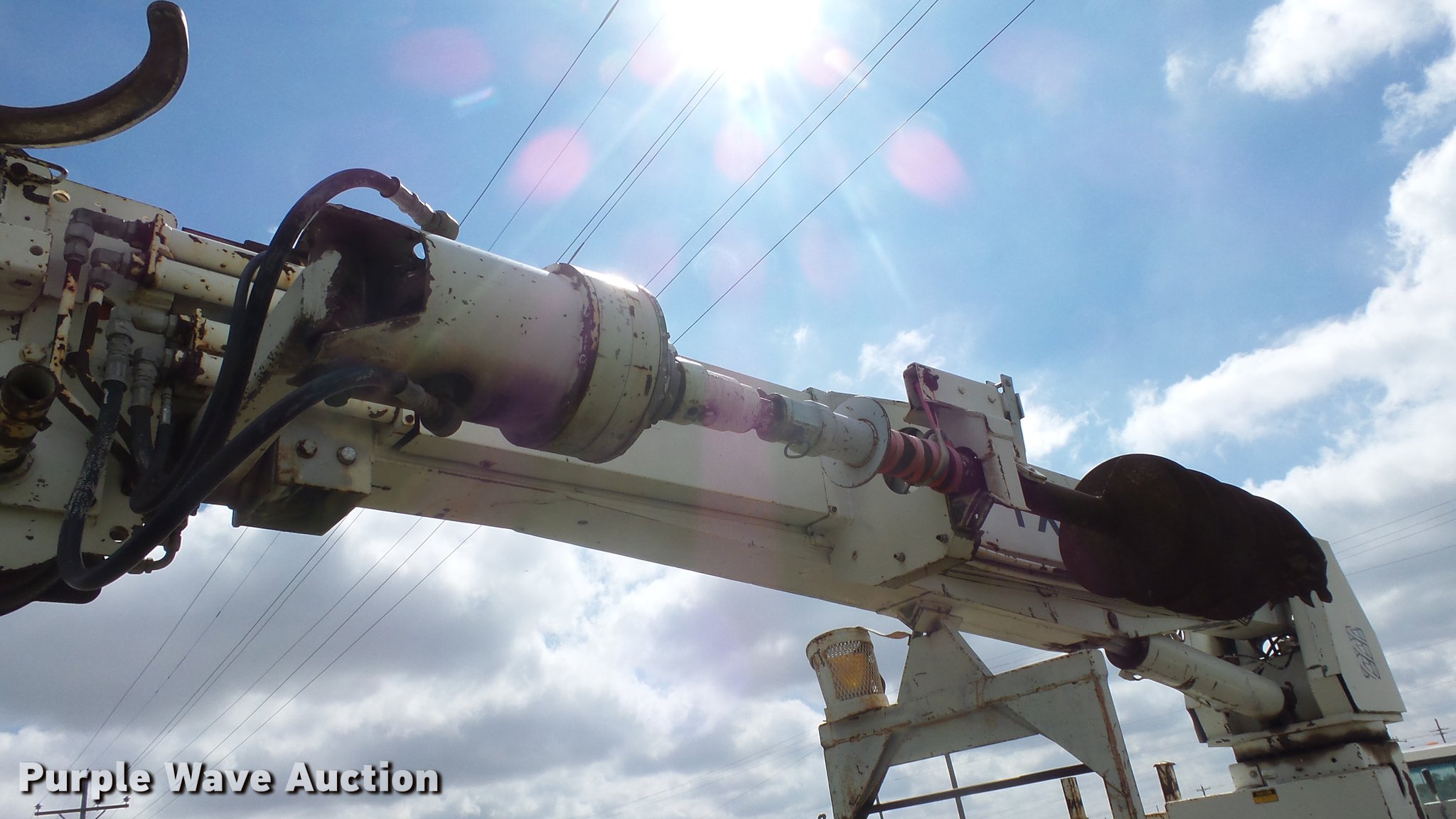 Purple Wave is selling a used Digger Derrick Truck in Kansas. This item is a 1991 Ford F800 digger derrick truck with the following: 101,225 miles on odometer, 7.8L L6 turbo diesel engine, Automatic transmission, AC and heat, AM/FM, Manual windows and locks, Vinyl interior, Brake controller, Munice PTO, UEC TX344B2 digger derrick bed, Approx. 14'L x 8'W, Steel deck, Toolboxes, Hydraulic hose reel, Left and right control stations, Texoma TX345 digger derrick, Approx. 8'L x 16" diameter auger, 45' max lift height, 40' max reach length, Rope material handler, Outriggers, Pintle hitch, Trailer wiring, Air brakes, 10.00R20 tires, Dead battery, Hydraulic leak on digger