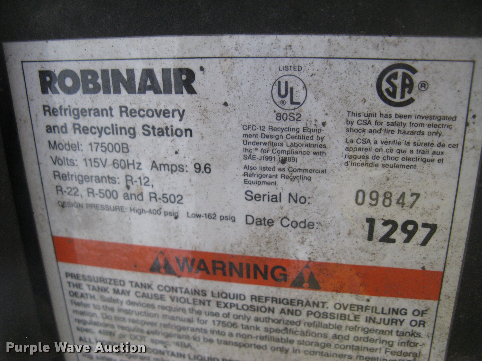 Purple Wave is selling a used Tools in Kansas. This item is a Robinair 17500B refrigerant recovery and recycling system with the following: 115V, Compatible with R-12, R-22, R-500, and R-502 refrigerants, Bottles not included, Serial 09847