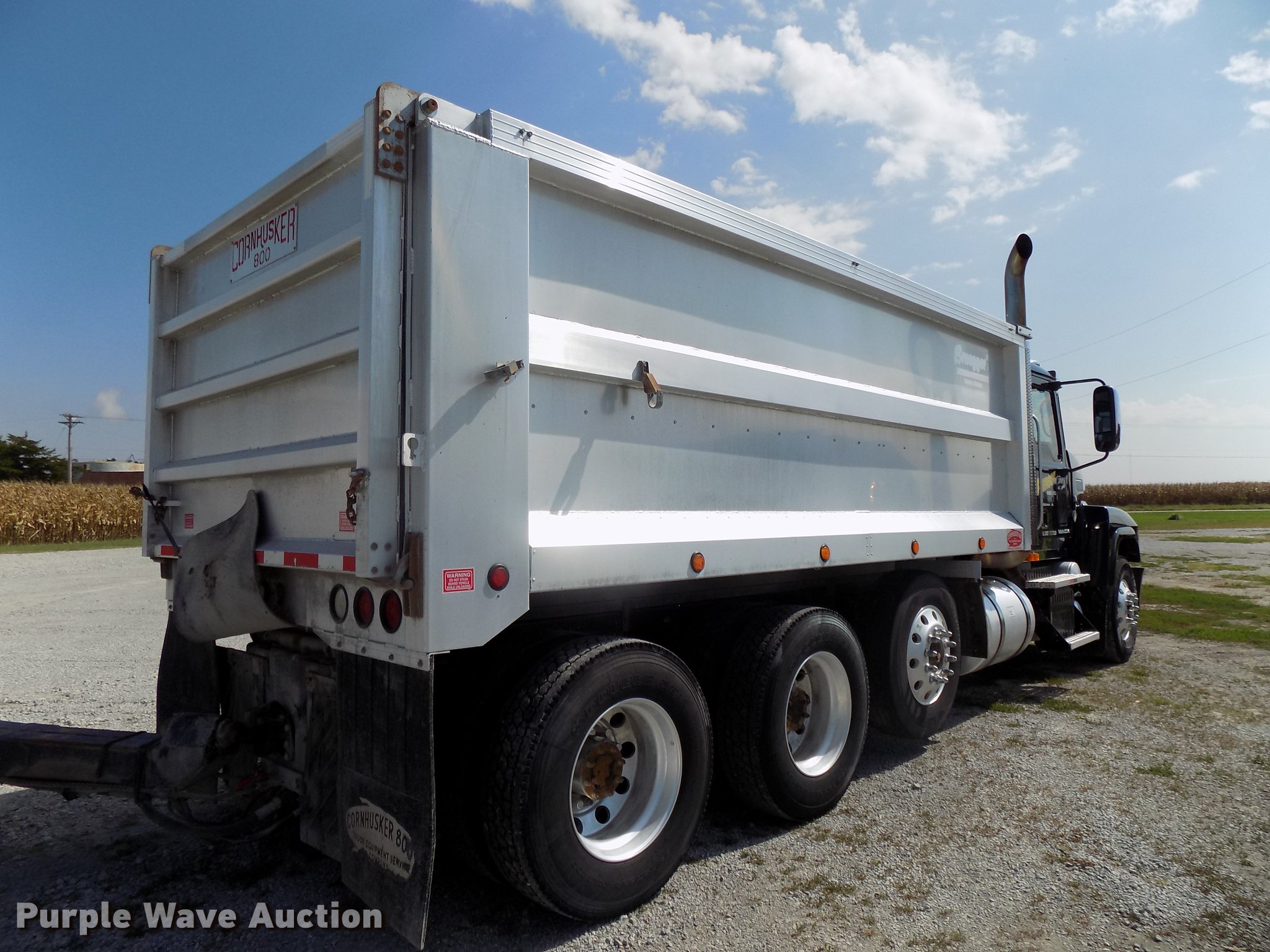 Purple Wave is selling a used Construction Dump Truck in Iowa. This item is a 2008 Mack Pinnacle CHU613 dump truck with the following: 386,371 miles on odometer, 9,999 hours on meter, Mack MP8-485C 12.8L L6 turbo diesel engine, Serial 909611, Eaton Fuller 18 speed manual transmission, Triple axle, Link steerable pusher axle, Part no. 8A000490, Serial 07288003,, Inter-axle differential lock, Full differential lock, AC and heat, Tilt, Telescoping steering wheel, Cruise, AM/FM/CD, Power windows, Power and heated mirrors, Air suspension seat, Air ride cab, Fog lights, Block heater, Backup alarm, Dump valves, Dual rear exhaust stacks, Exterior visor, Chrome bumper, Tow hooks, PTO, 2008 Corn Husker DBA-176060 aluminum dump bed, 17'L x 96"W, 60" side height, 112"H from ground to top of sides, Plastic liner, Single ram hoist, Air operated end gate, Serial 08977, Air, electric, and hydraulic hookups, Dual fuel tanks, Pintle hitch, Trailer wiring, Stainless steel quarter fenders, Mud flaps, Eaton rear end, Air suspension, Air brakes, Approx. 250" wheelbase, Aluminum wheels, 315/80R22.5 front tires, 275/80R22.5 pusher axle tires, 295/75R22.5 rear tires, Annual inspection valid through October 2018, Trailer not included, Unit# 68
