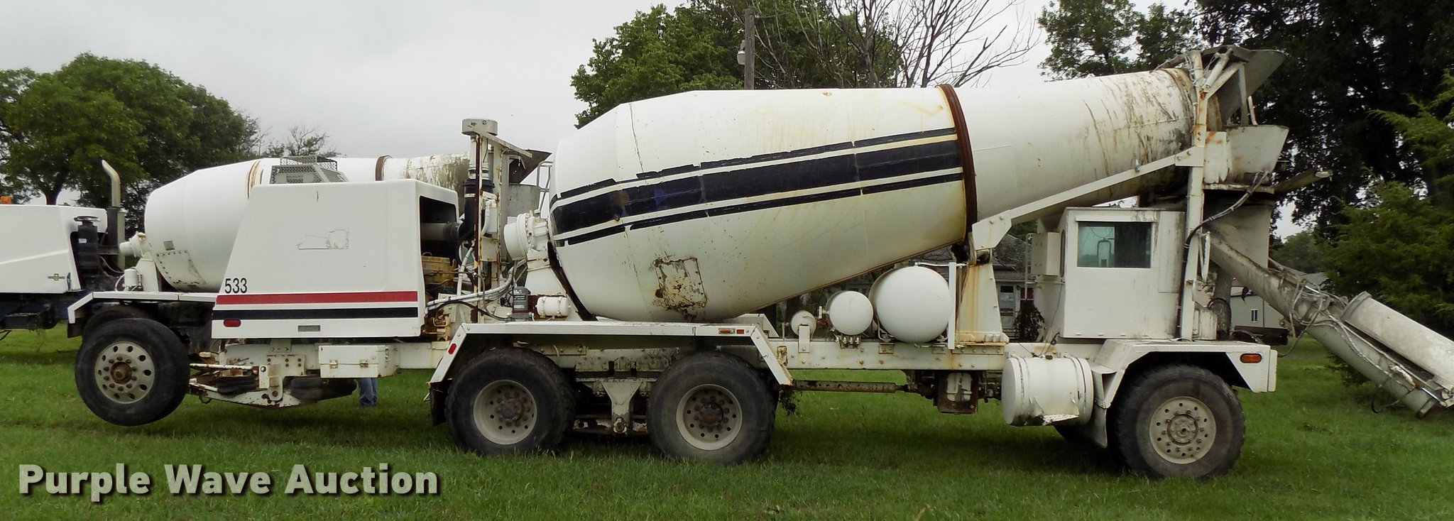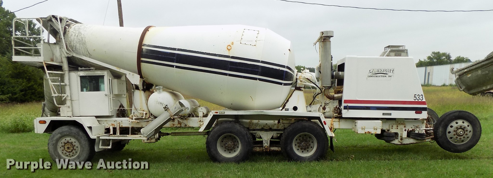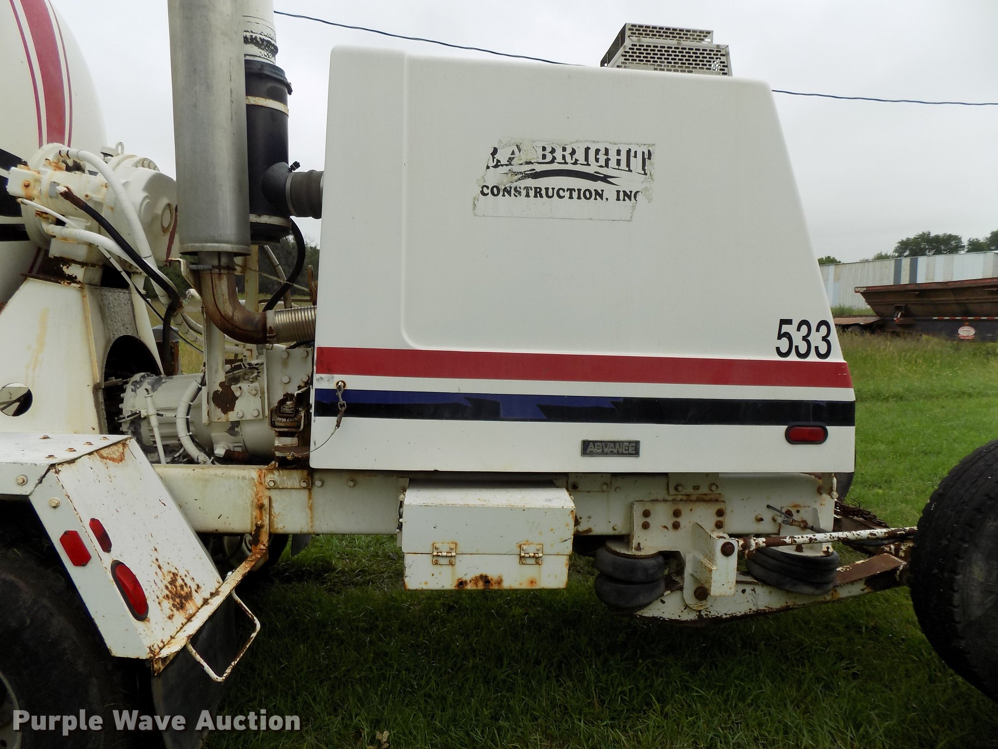 Purple Wave is selling a used Ready Mix or Pump Truck in Nebraska. This item is a 1999 Advance C10350A76811 ready mix truck with the following: 478 hours on meter, Caterpillar C10 six cylinder turbo diesel engine, 350 HP, Serial 8YS06994, Automatic transmission, Full locking differential, Tandem axle, Tag axle, Heat, Suspension seat, PTO, Backup alarm, Advance mixer bed, 11 cu.yd. capacity, Ladder, Chute extension, Front discharge, Front drum controls, Serial 6902299, Walking beam suspension, Air brakes, Engine brake, Aluminum wheels, 445/65R22.5 front tires, 11R22.5 tag axle tires, 445/65R22.5 rear tires, GVWR 79,000 lbs, FAWR 21,000 lbs, IAWR 23,000 lbs, RAWR 23,000 lbs, TAWR 11,000 lbs, Unit# 533