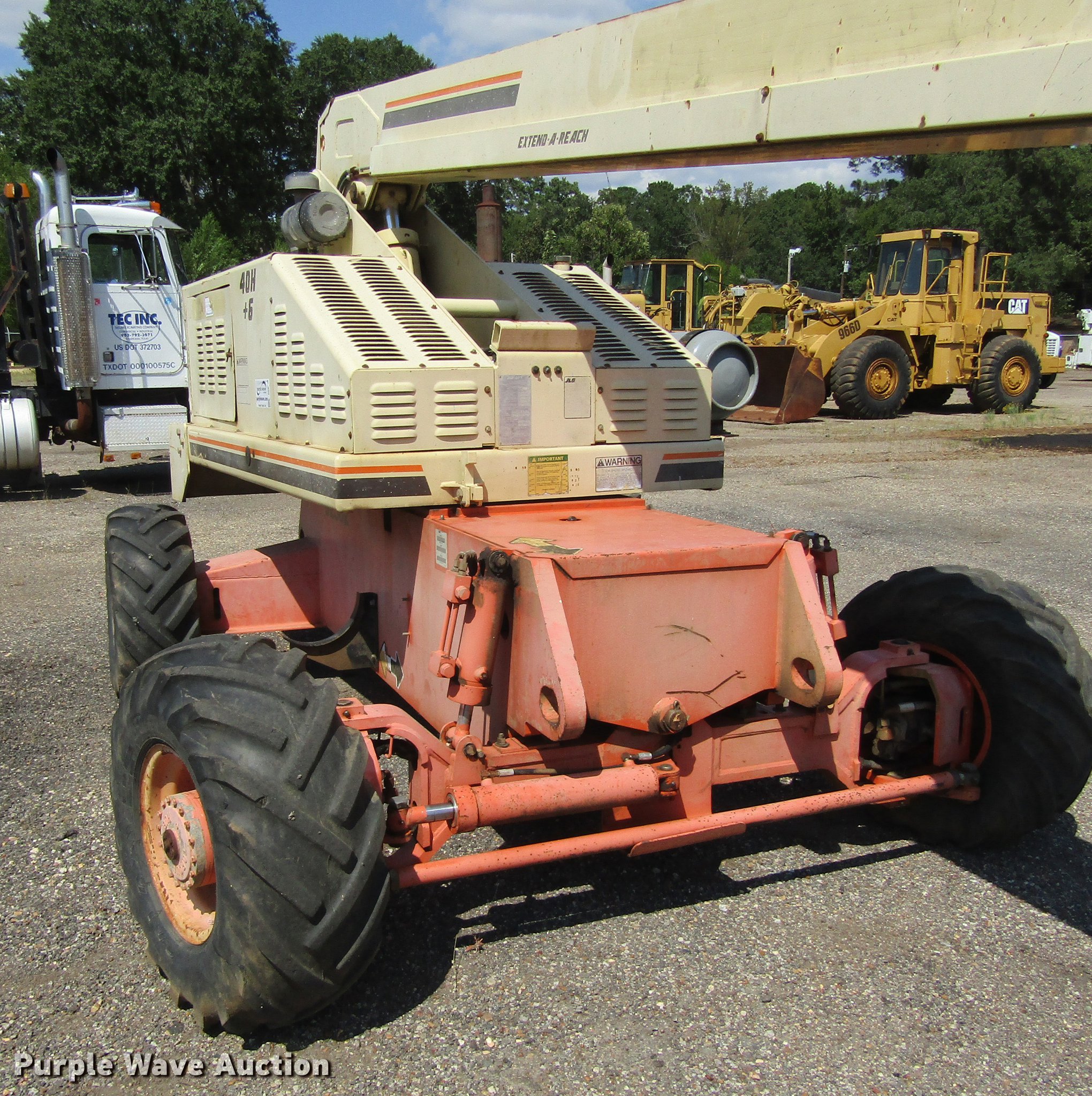 1999 JLG 40H boom lift. 4,469 hours on meter, Ford four cylinder propane engine, Four wheel drive, 500 lbs maximum lift capacity, 39' maximum reach, 46' maximum lift height, 25'L x 8'W platform Platform and ground controls, Hydraulic platform rotation, 12.5L15 pneumatic tires, Serial 0300044176. Tatum Excavating Company. 2416 South Lake Drive. Texarkana, TX 75501