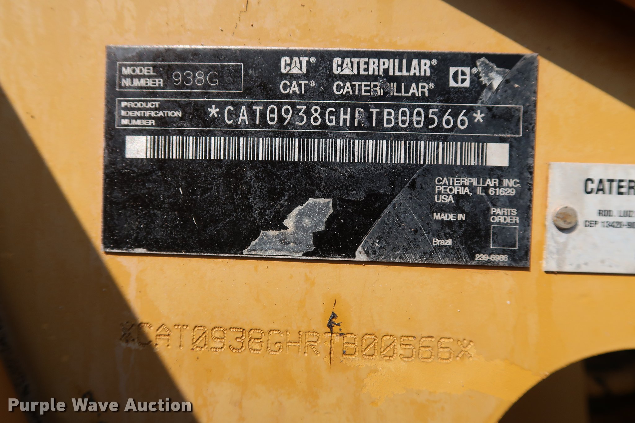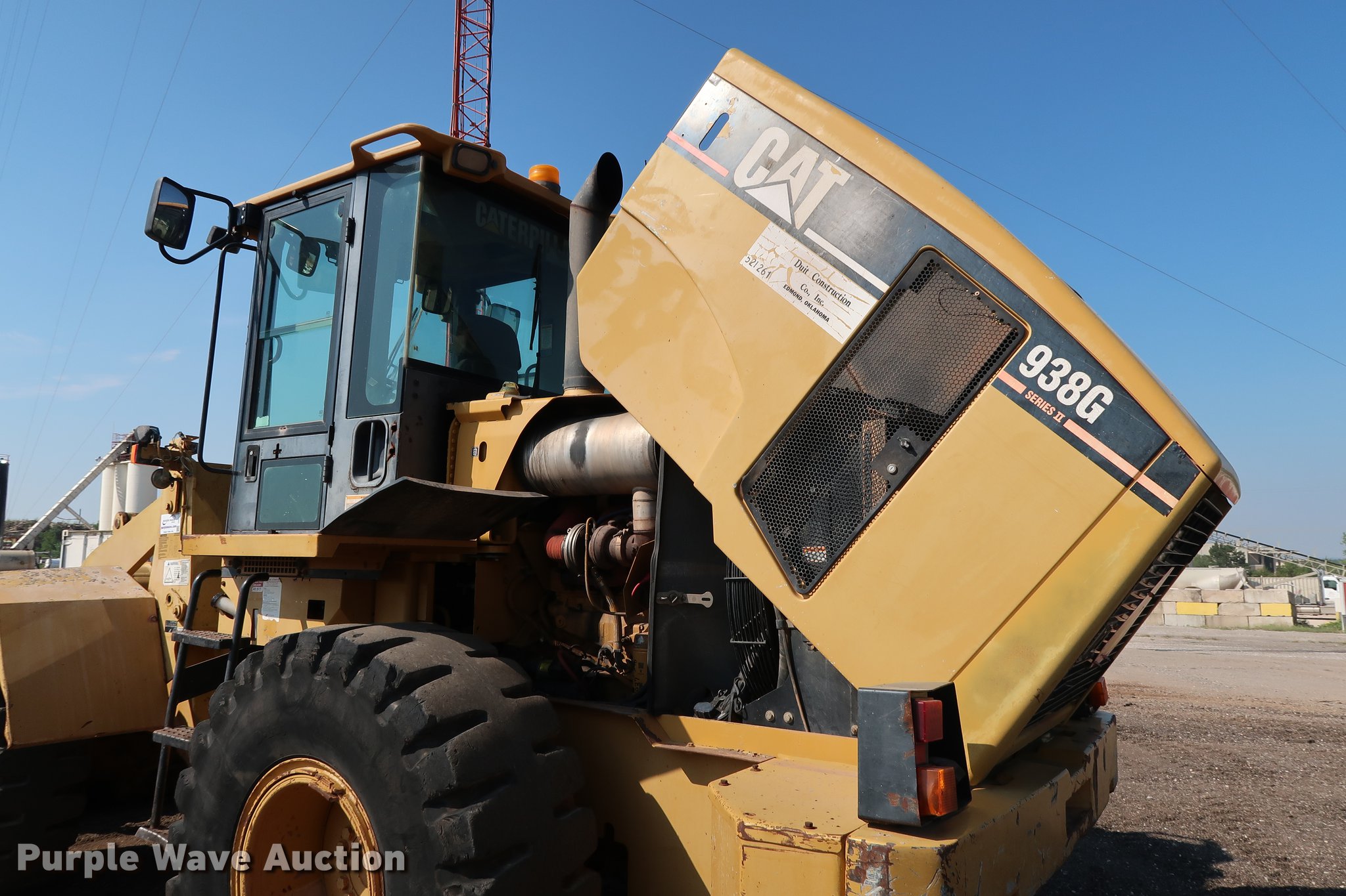 Purple Wave is selling a used Wheel Loader in Oklahoma. This item is a 2004 Caterpillar 938G Series II wheel loader with the following: 14,171 hours on meter, Caterpillar 3126 7.2L six cylinder turbo diesel engine, 260 HP, Serial BMA08499, Powershift transmission, 4F-4R gears, EROPS, AC and heat, Tilt steering wheel, AM/FM, Two-lever bucket controls, Air suspension seat, Front and rear work lights, Wipers, Backup alarm, Caterpillar 106"W bucket, Bolt-on cutting edge, 3.65 cu. yd. capacity, Counterweight, 20.5-25 tires, Forks selling separately as item DD5327, Serial CAT0938GHRTB00566, Unit# 521.261