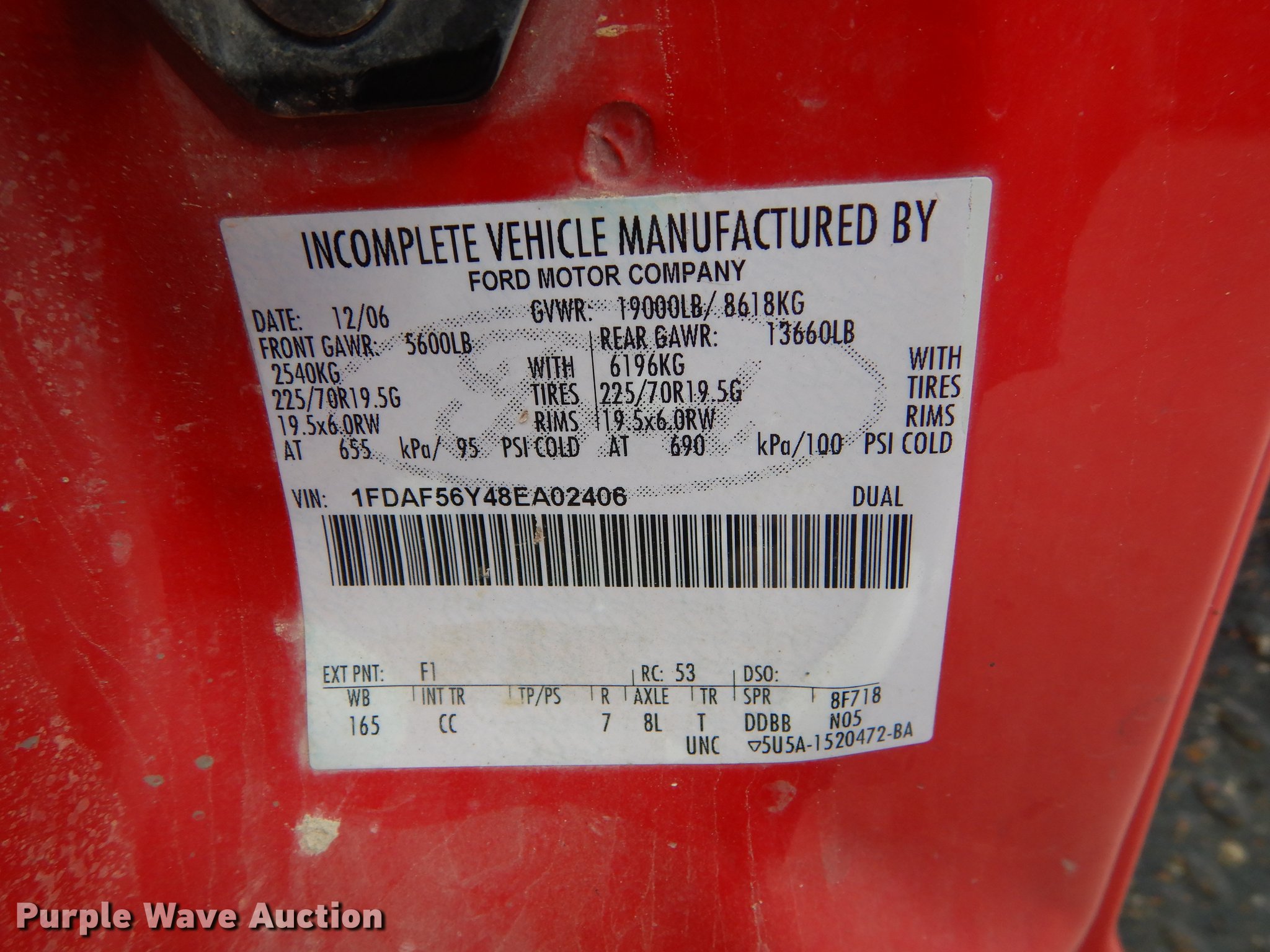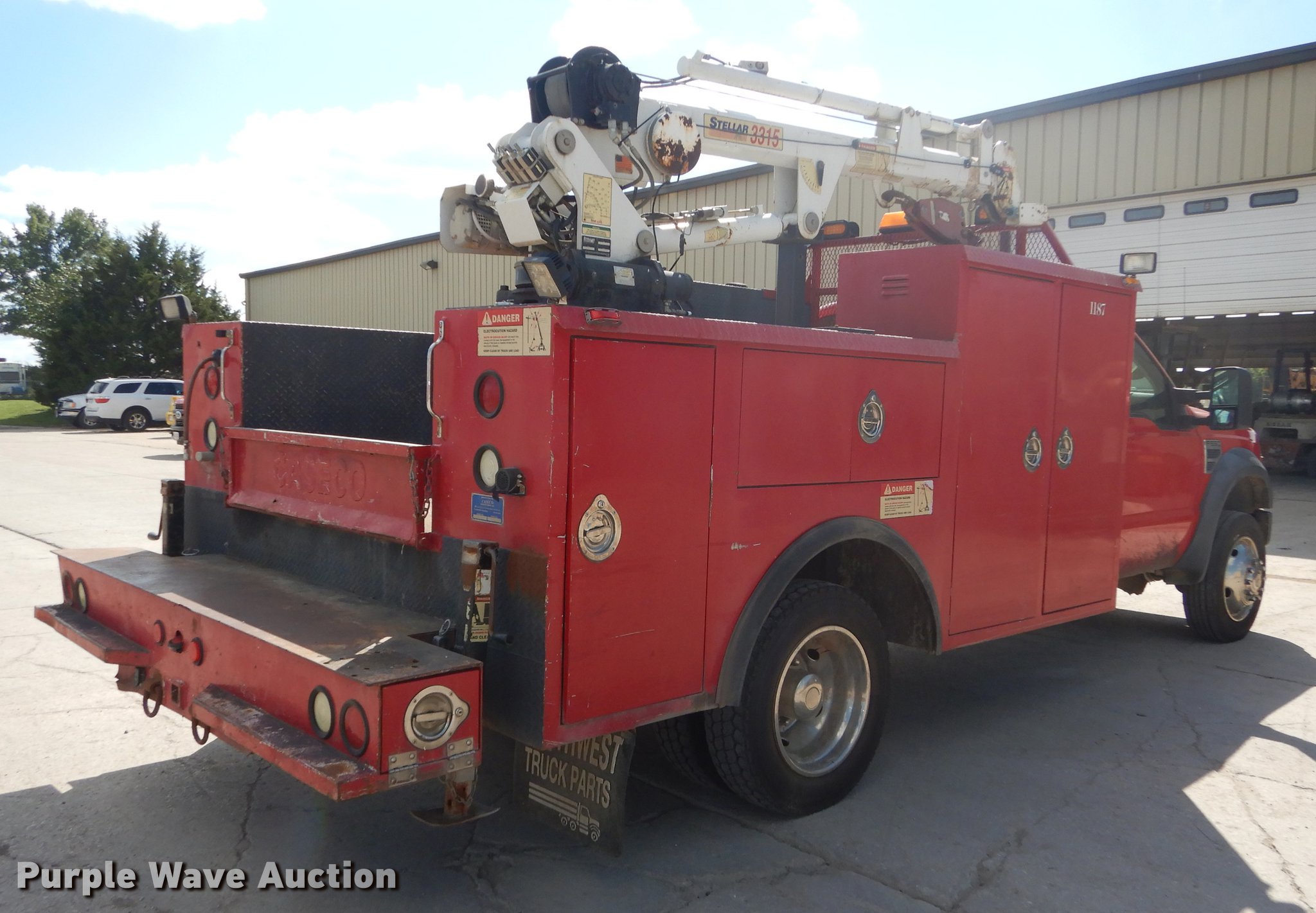 Purple Wave is selling a used Service Truck in Kansas. This item is a 2008 Ford F550 Super Duty XL service truck with crane with the following: 240,487 miles on odometer, 6.8L V10 SOHC 30V gas engine, Automatic transmission, Single axle, AC and heat, Tilt, Cruise, AM/FM, Beacon light, Front tow hooks, Case Co utility bed, 11'L x 8'W, 20" bed extension, Shelving, Slide-out drawers, Compartment lights, Work lights, Hose reel, Air hose,, Stellar 3315 crane, 3,200 lbs maximum lift capacity, 16.9' boom length, Remote control, Outriggers, Serial CCW07617, Single fuel tanks, 162" wheelbase, Spring suspension, Hydraulic brakes, Super Cargo 225/70R19.5 tires, Non-operational AC, Non-operational crane, Unit# 20