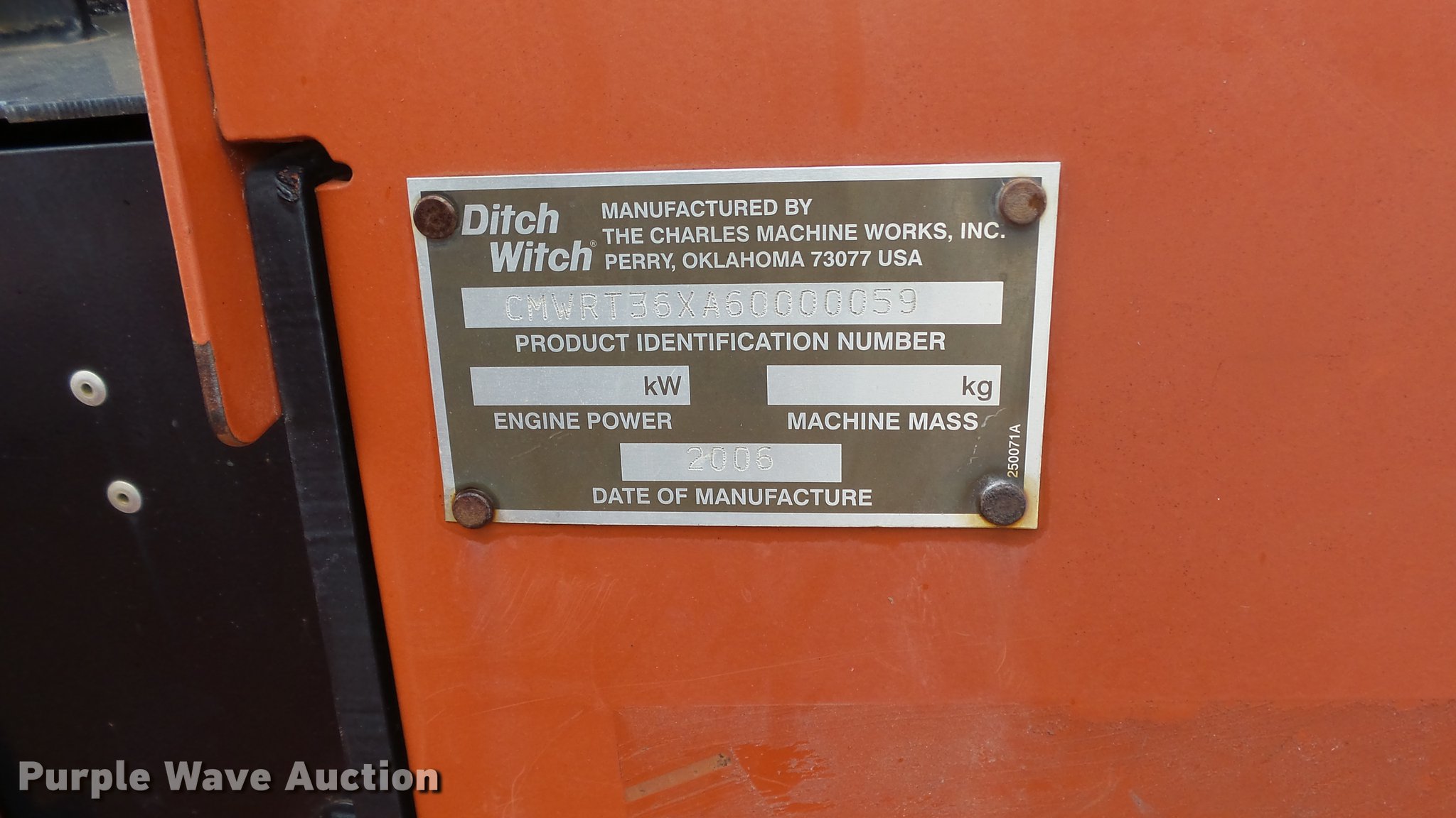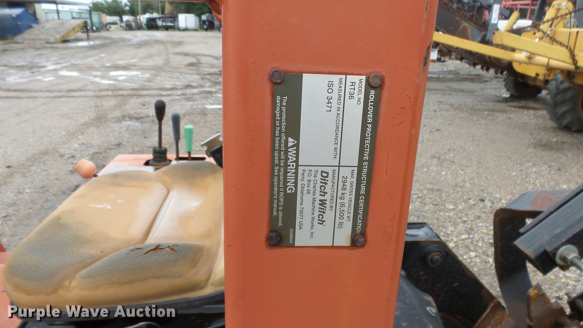 Purple Wave is selling a used Trencher or Rock Saw in Kansas. This item is a 2006 Ditch Witch RT36 trencher with the following: 219 hours on meter, Deutz three cylinder diesel engine, Manual transmission, 3F-1R gears, OROPS, 6'L trenching boom, 6" cutting width, 64"W backfill blade, 26 x 12.00-12 tires, Serial CMWRT36XA60000059