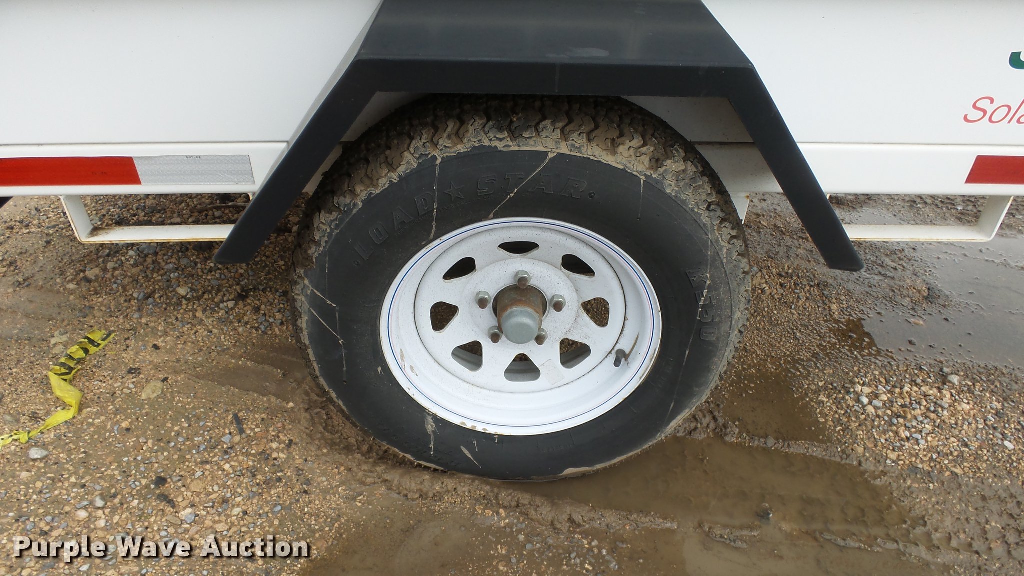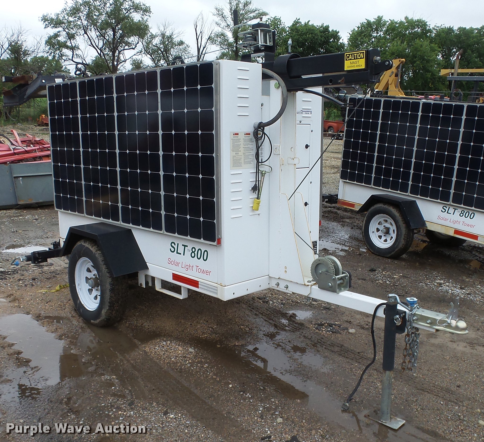 2011 Progress Solar SLT800 light plant. (4) bulbs 24V, 70 watt, (2) 84" x 41" solar panels, Sun Saver controller, Outriggers, Ball hitch, 205/75D14 tires. This is worksite support equipment and will not come with a title. Transfer of ownership documentation will be a bill of sale. 1P9B71319BG661220. Mid America Equipment Inc. 301 West 53rd St N. Park City, KS 67204