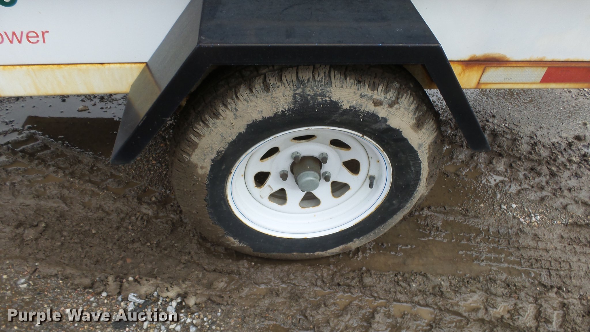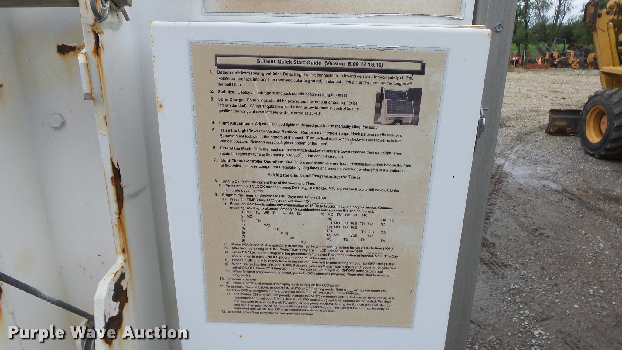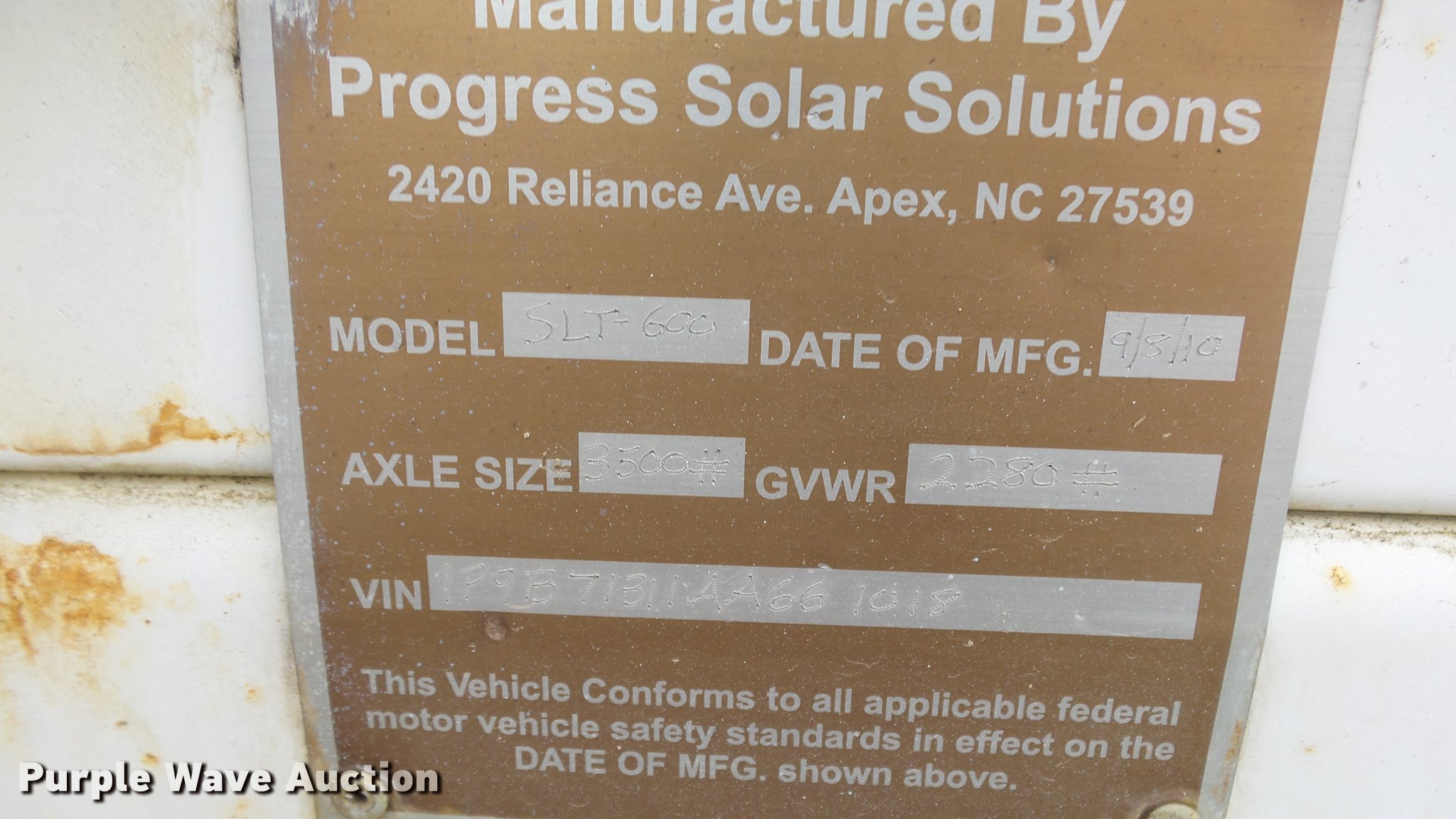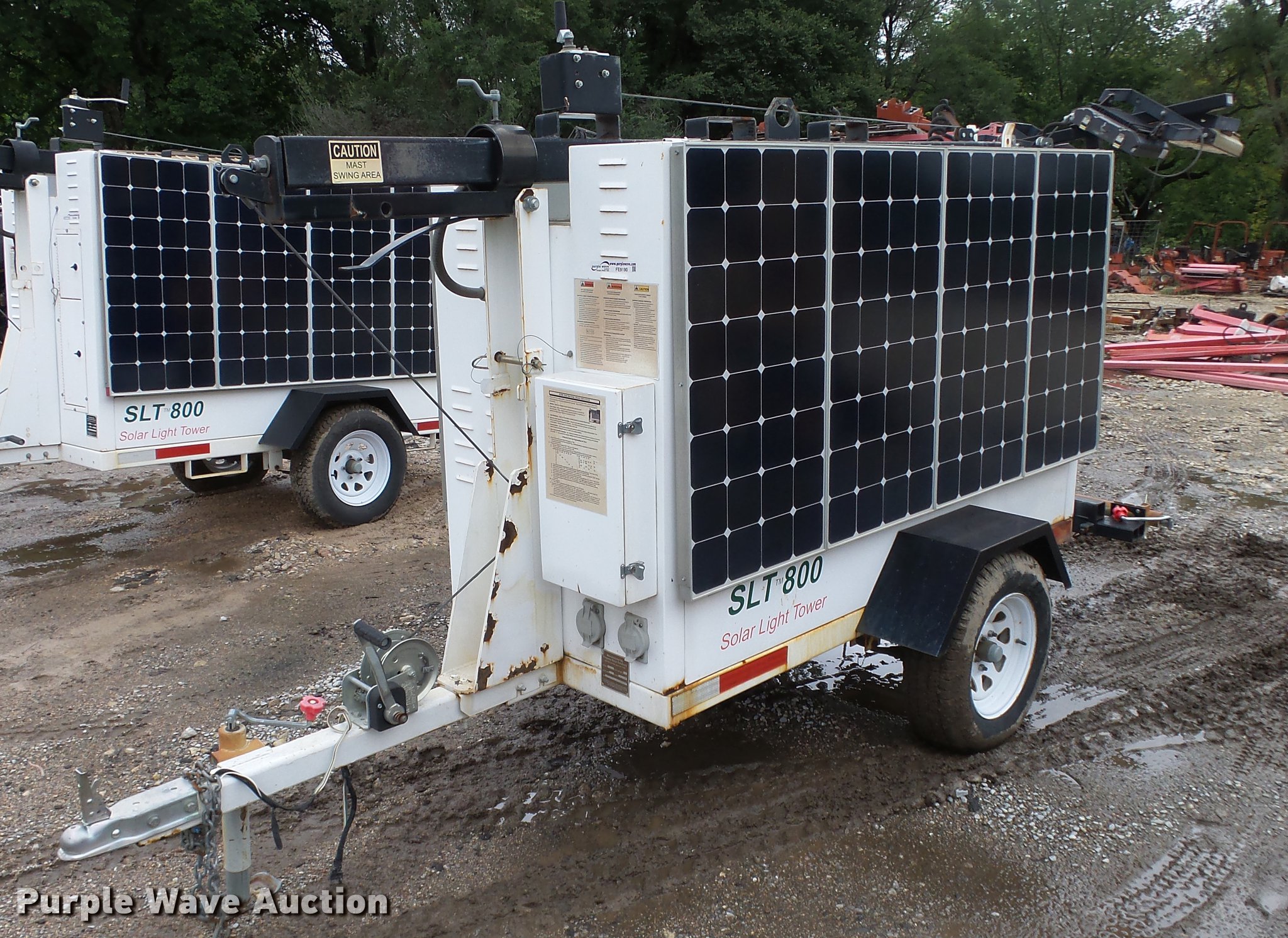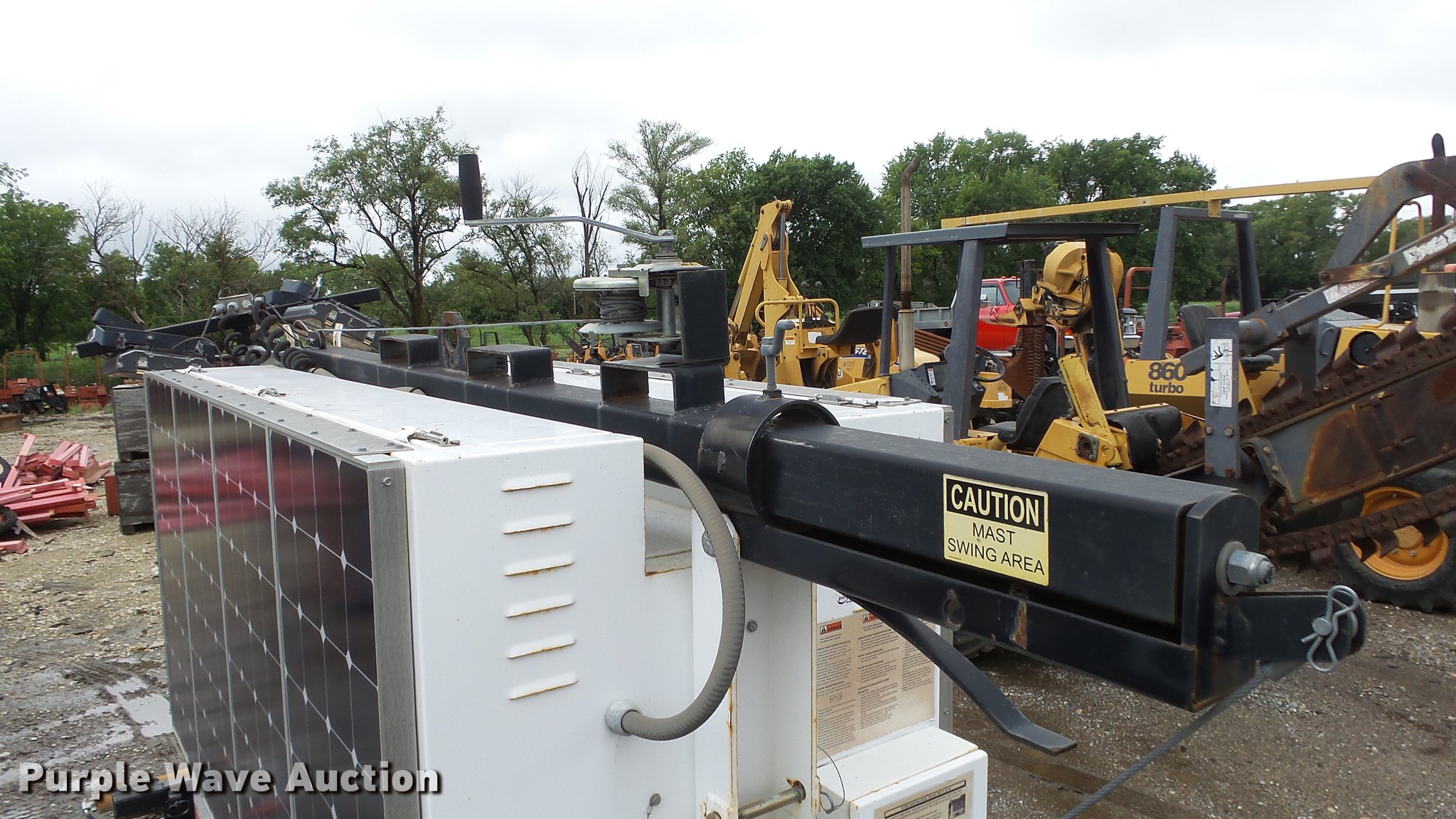 2010 Progress SLT800 light plant. (4) bulbs 24V , 70 watt, (2) 84" x 41" solar panels, Sun Saver controller, Manual hoist, Outriggers, Ball hitch, 205/75D14 tires. This is worksite support equipment and will not come with a title. Transfer of ownership documentation will be a bill of sale. 1P9B71311AA661018. Mid America Equipment Inc. 301 West 53rd St N. Park City, KS 67204
