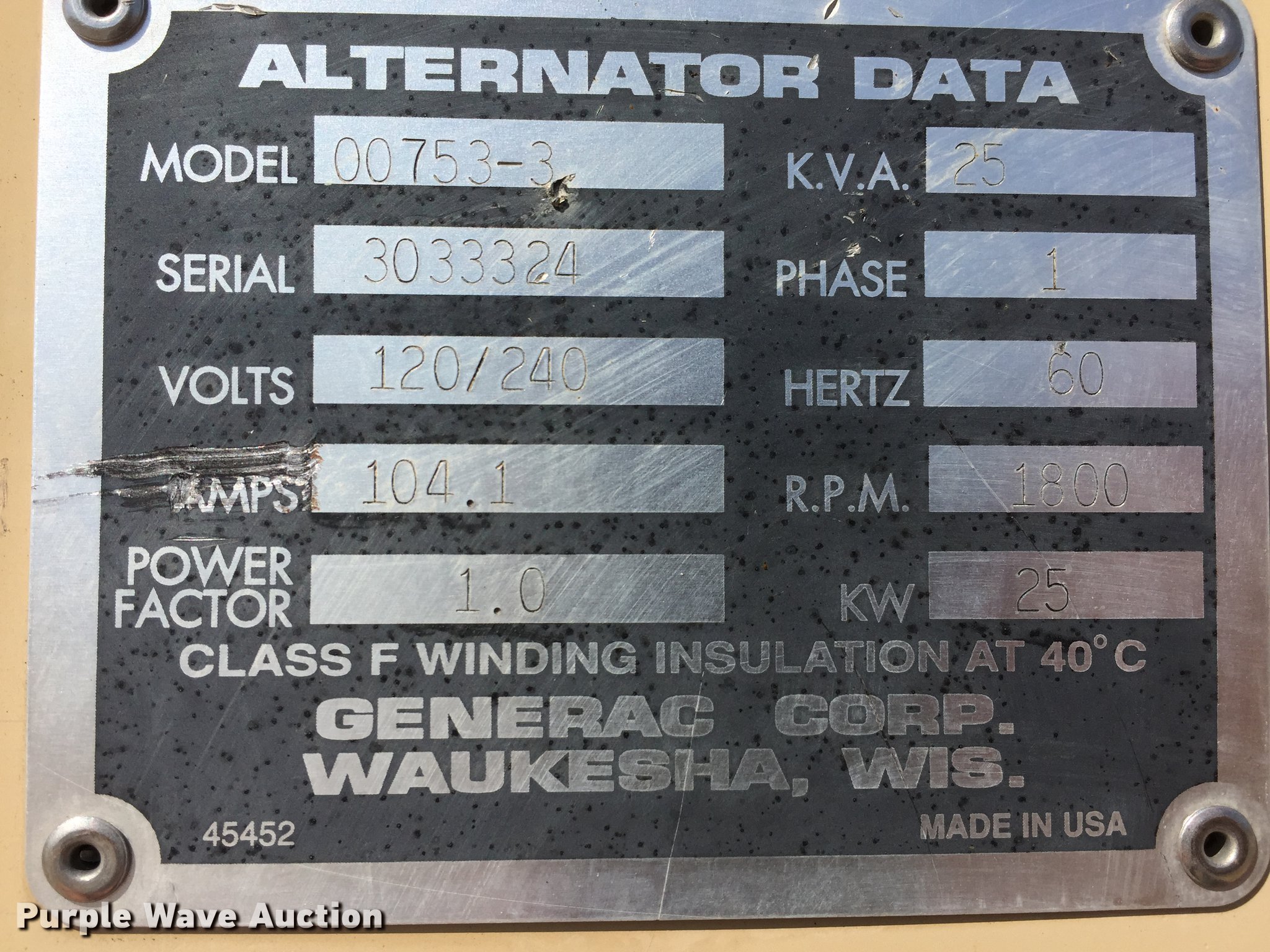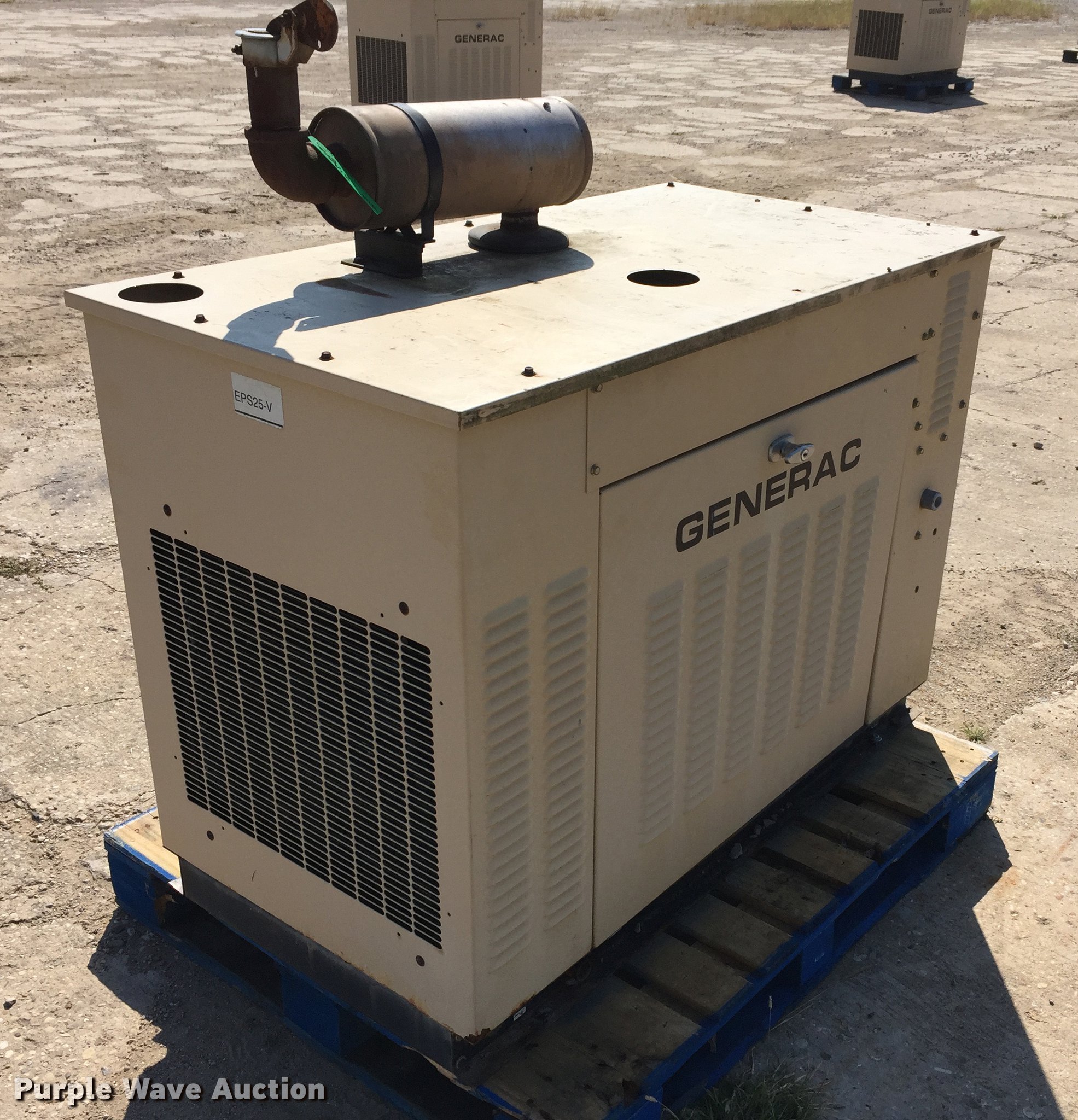Purple Wave is selling a used Generator Set in Illinois. This item is a Generac generator with the following: 22 hours on meter, Fiat propane engine, Single phase, 120/240V, 25 kW, 25 kVA, 60 Hz, 140 amps at 240V, 3,600 RPM, 25 kVA standby power rating, 200 amp automatic transfer switch, 50"L x 40"W x 56"H, 850 lbs, Serial 3033324