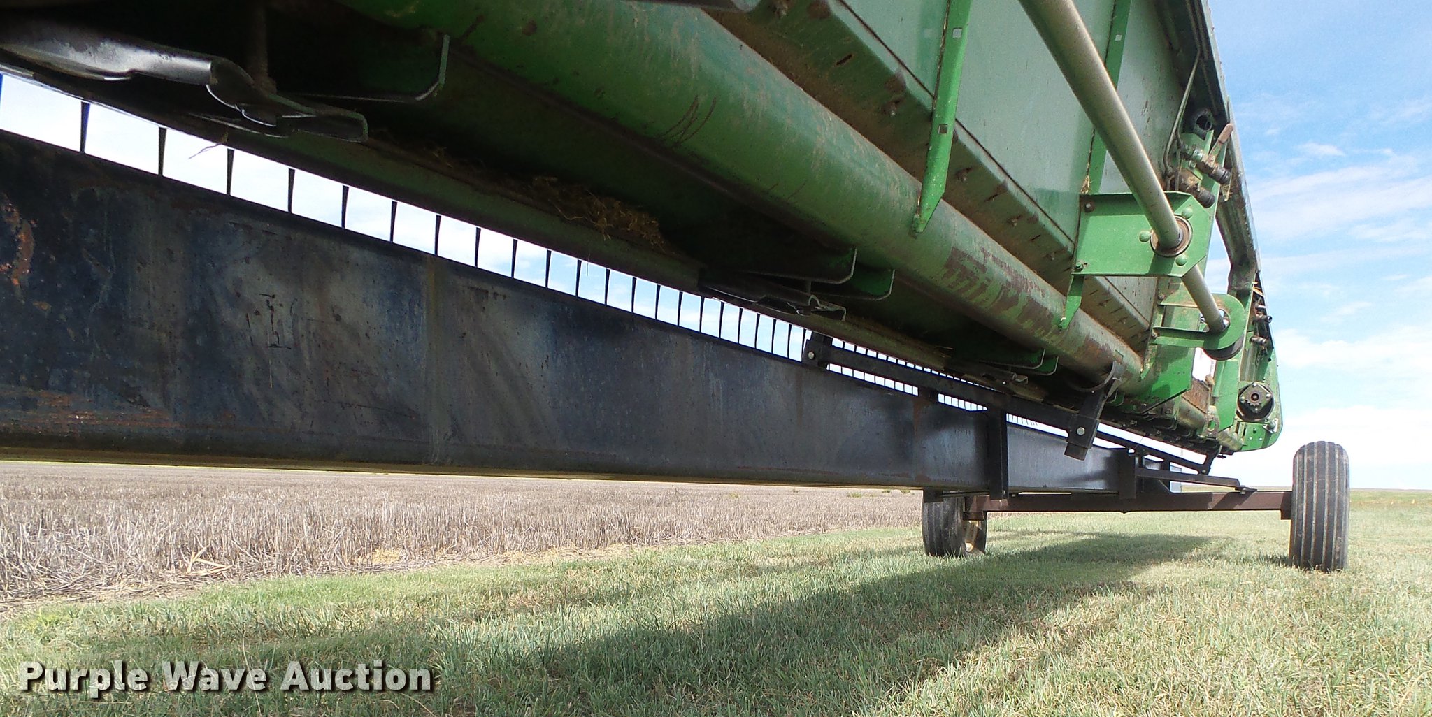 1992 John Deere 930 platform head. 30'W, Finger reel, Hydraulic fore/aft, Hydraulic reel height control, Steel skid plates, Dual drivelines, Transport lights, Ag Industries header trailer 30'L, Ball hitch, Single axle, 9.5L-15 tires Weathered, Serial H00930P646343. Transfer of ownership documentation will be a bill of sale. 12449 Jewell Rd. Spearville, KS 67876