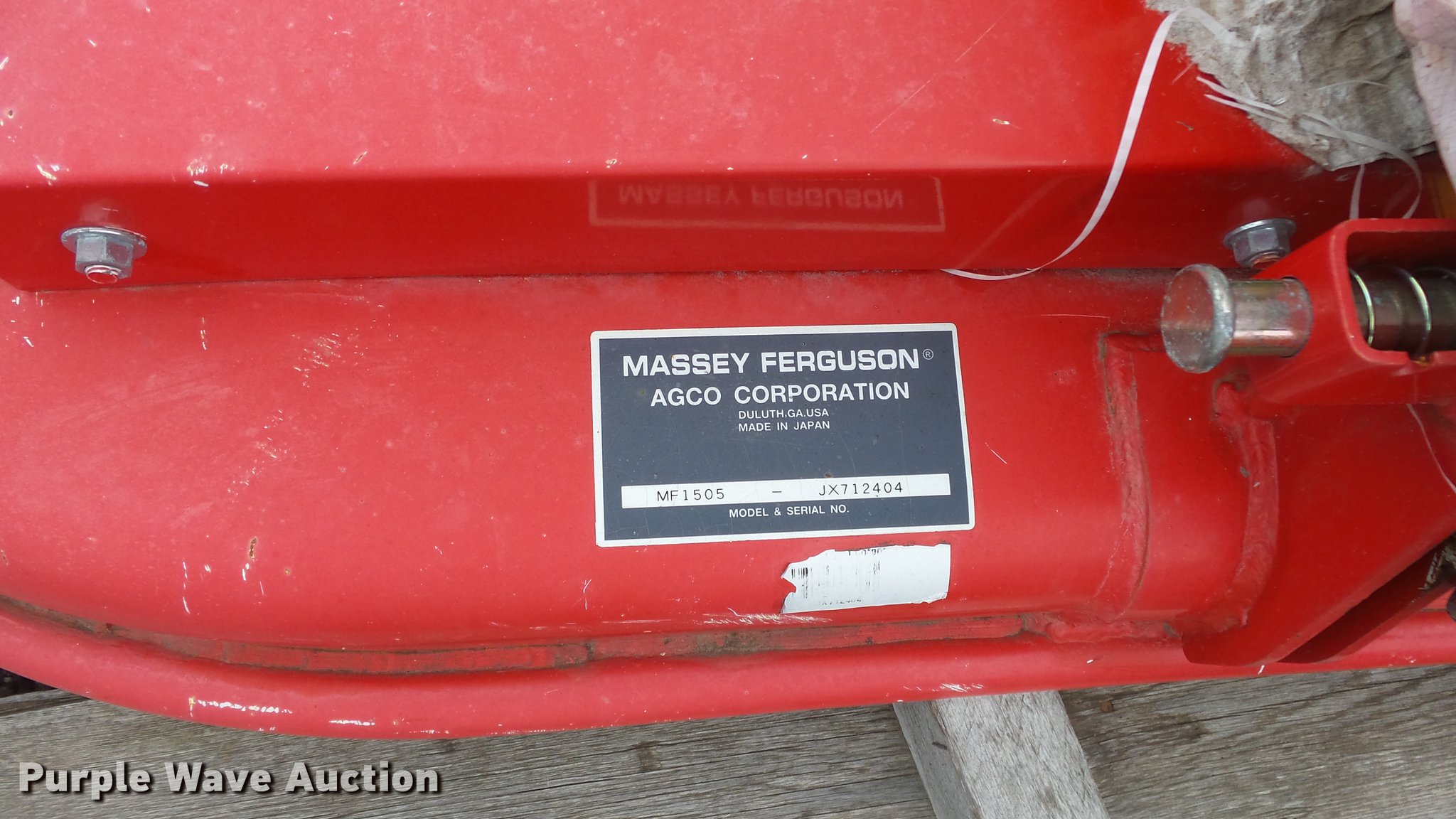 Purple Wave is selling a used Mower, Cutter, Shredder in Kansas. This item is a Massey-Ferguson MF1505 mower with the following: 72"W, Side discharge, Shaft drive, Serial JX712404