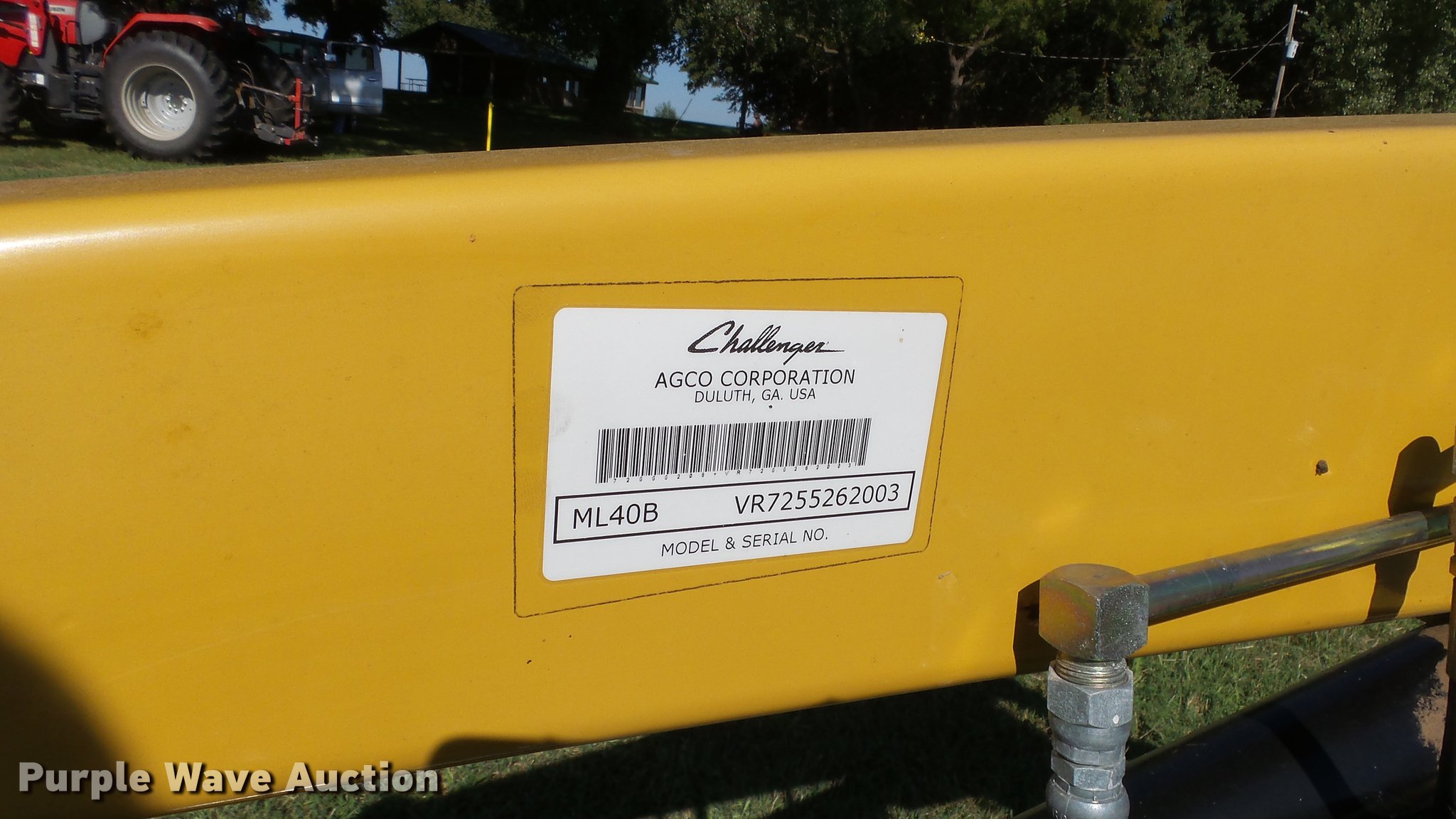 Challenger ML40B loader. 72"W bucket, Hydraulics, Mounting accessories, Serial VR7255262003. 3611 W Fountain Green Rd. Pretty Prairie, KS 67570