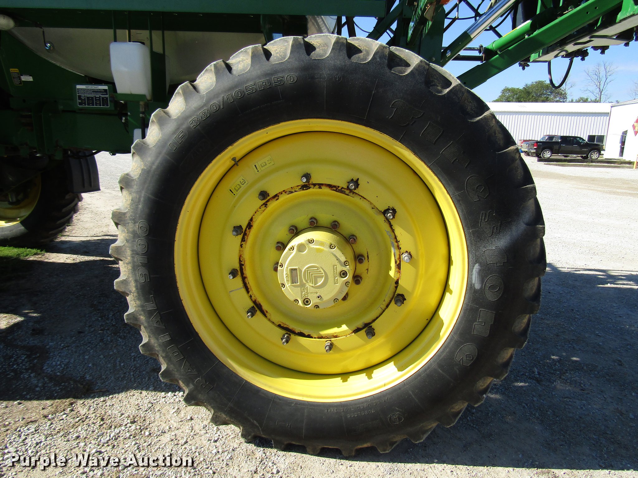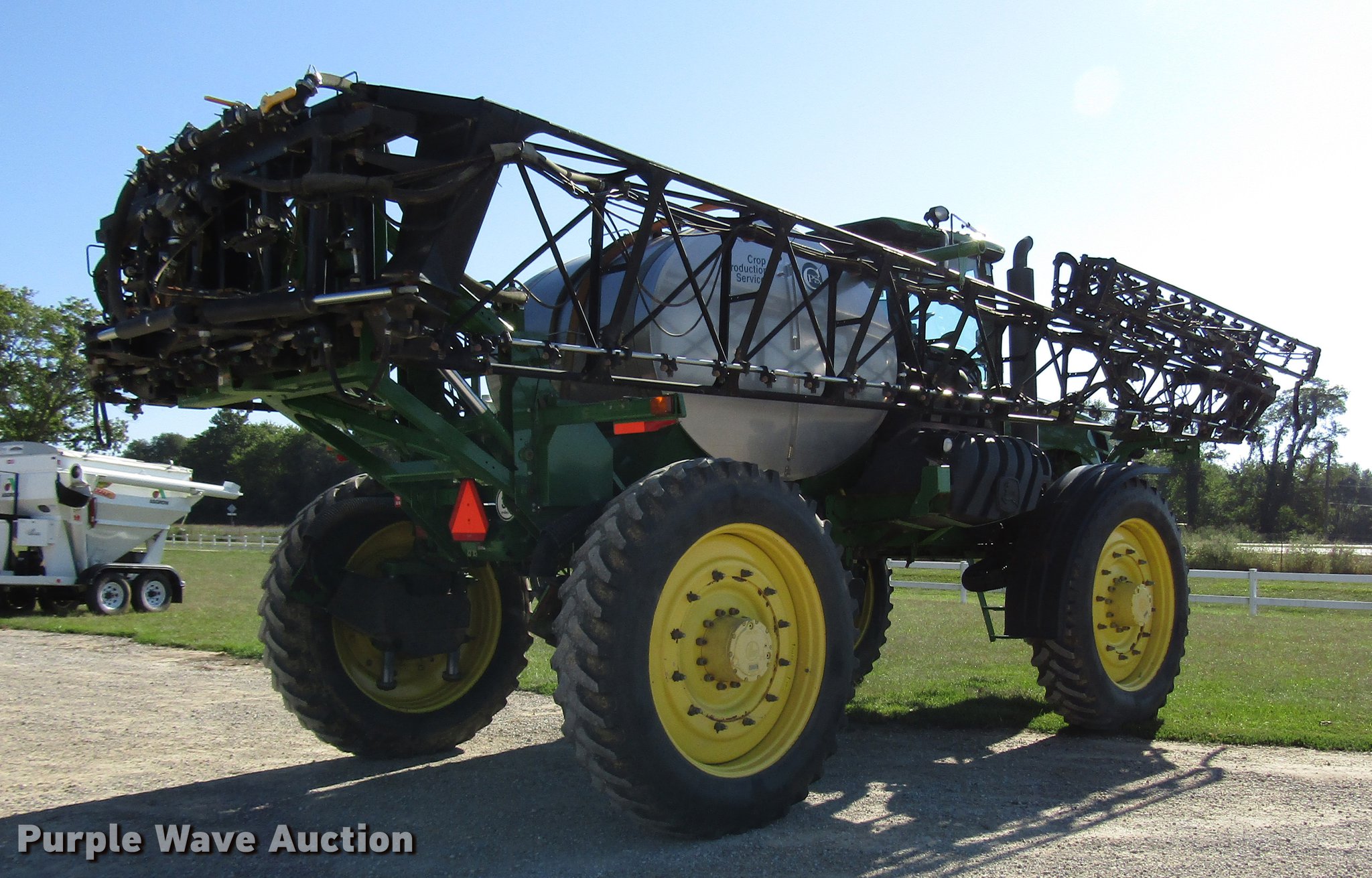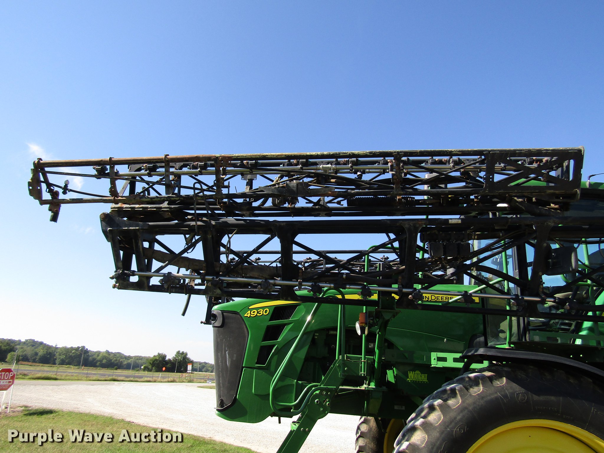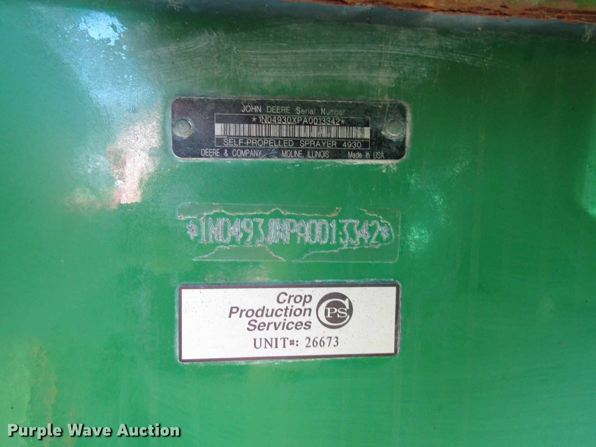 Purple Wave is selling a used Applicator Self Propelled in Indiana. This item is a 2011 John Deere 4930 sprayer with the following: 5,078 engine hours on meter, John Deere six cylinder turbo diesel engine, Serial RG6090L096334, Hydrostatic transmission, Four wheel drive, 1,200 gallon stainless steel solution tank, Rinse tank, Foam marker tank, Clean water tank, 120'W boom, Seven boom sections, Break-away boom, Hydraulic boom fold, Automatic height control, 15" nozzle spacing, Five way nozzle bodies, Fence row nozzles, AC and heat, AM/FM, Air suspension seat, Work lights, John Deere 2600 GPS monitor, John Deere StarFire 3000 GPS receiver, John Deere 2600 spray controls, Auto steer, Block heater, Hydraulic ladder, Belly shield, Fenders, Hydraulic axle width adjust, 380/105R60 row crop tires, Additional 620/70R46 flotation tires and fenders, Hydrostatic pumps, hydraulic drive motors, auxiliary hydraulic pump, and oil cooler replaced 06/2016, Serial 1N04930XPA0013342, Unit# 26673