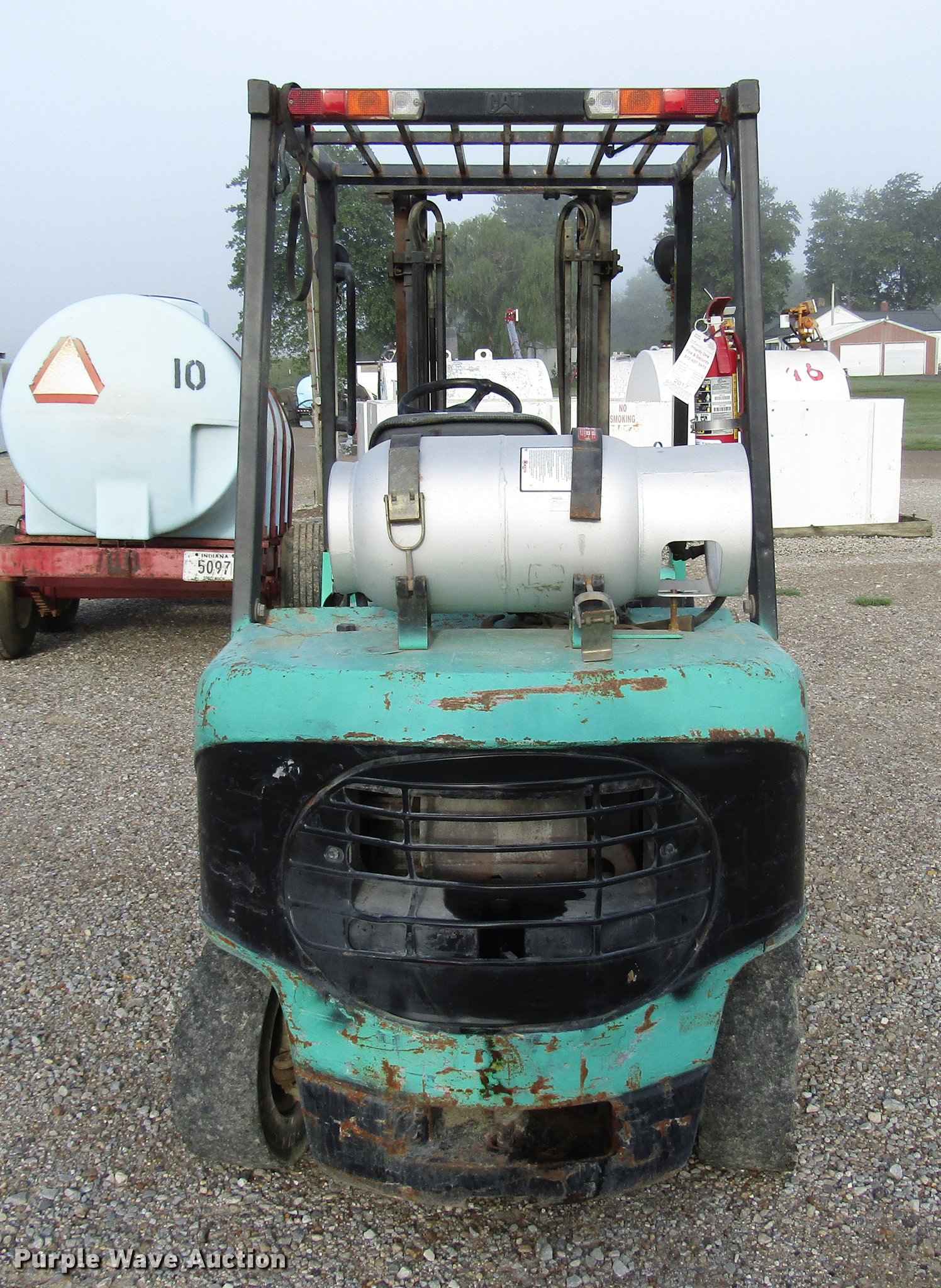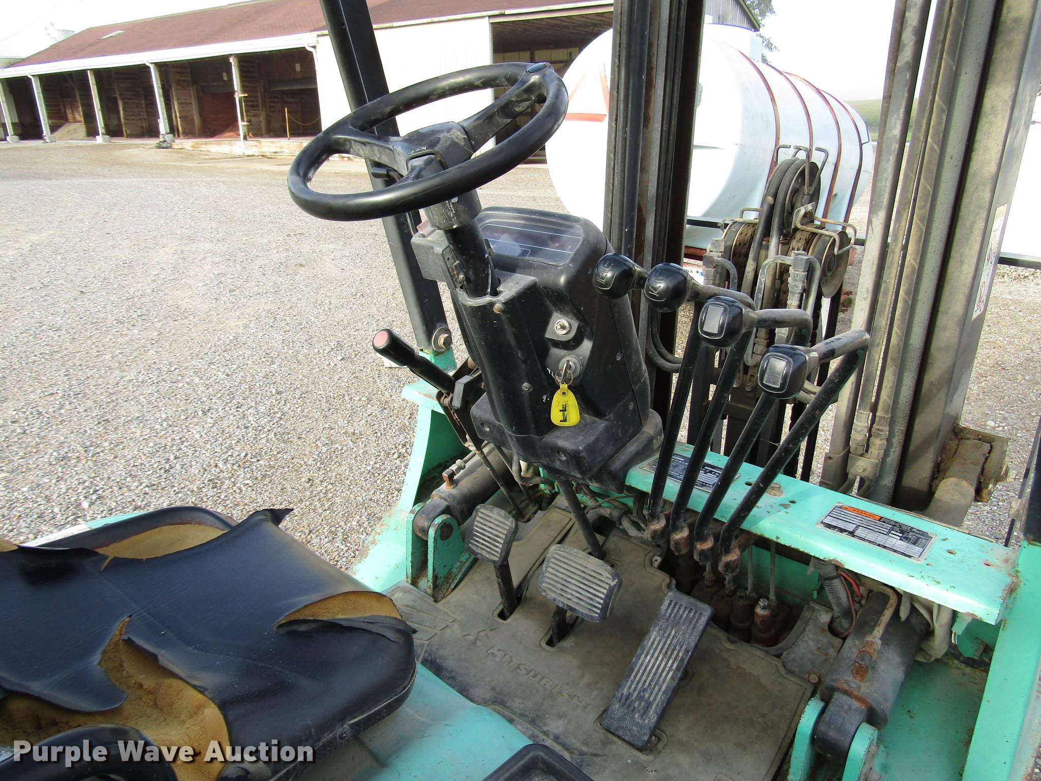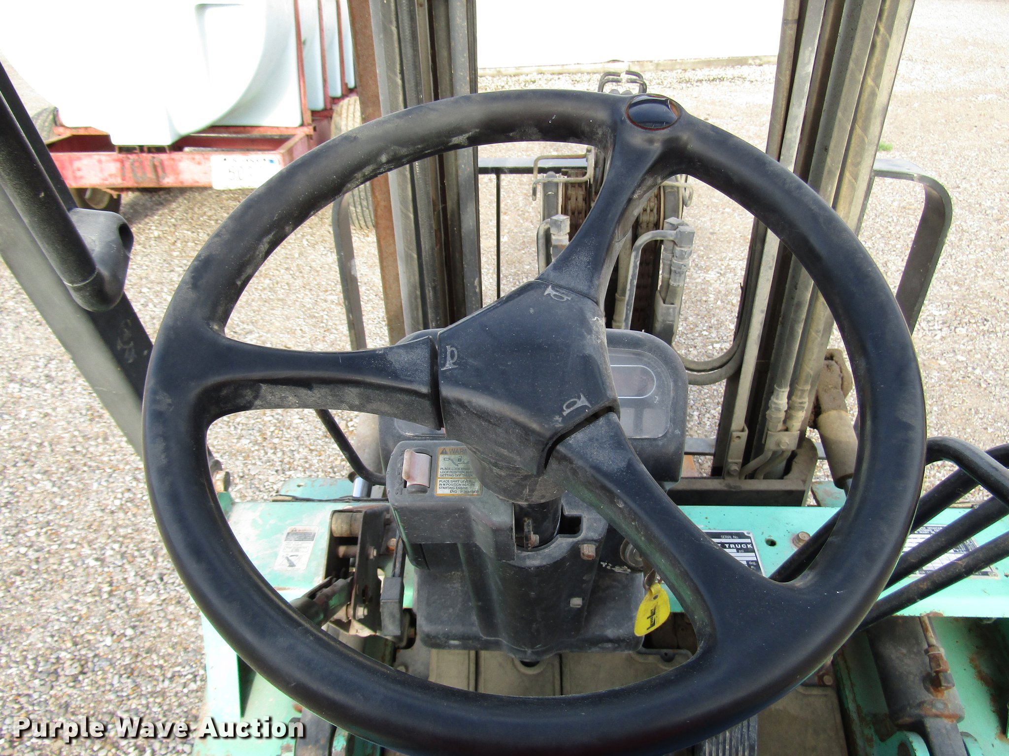 Purple Wave is selling a used Warehouse Forklift in Indiana. This item is a 2001 Mitsubishi FG25K forklift with the following: 5,026 hours on meter, Propane engine, 3,000 lbs max lift capacity, 13' max lift height, Side shift, Mast tilt, 42" fork length, Propane bottle included, 7.00/12R5.0 front tires, 6.00/9R4 rear tires, Serial AF17C00114