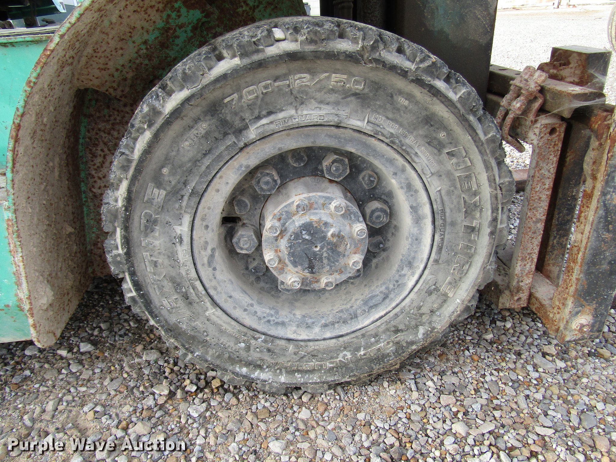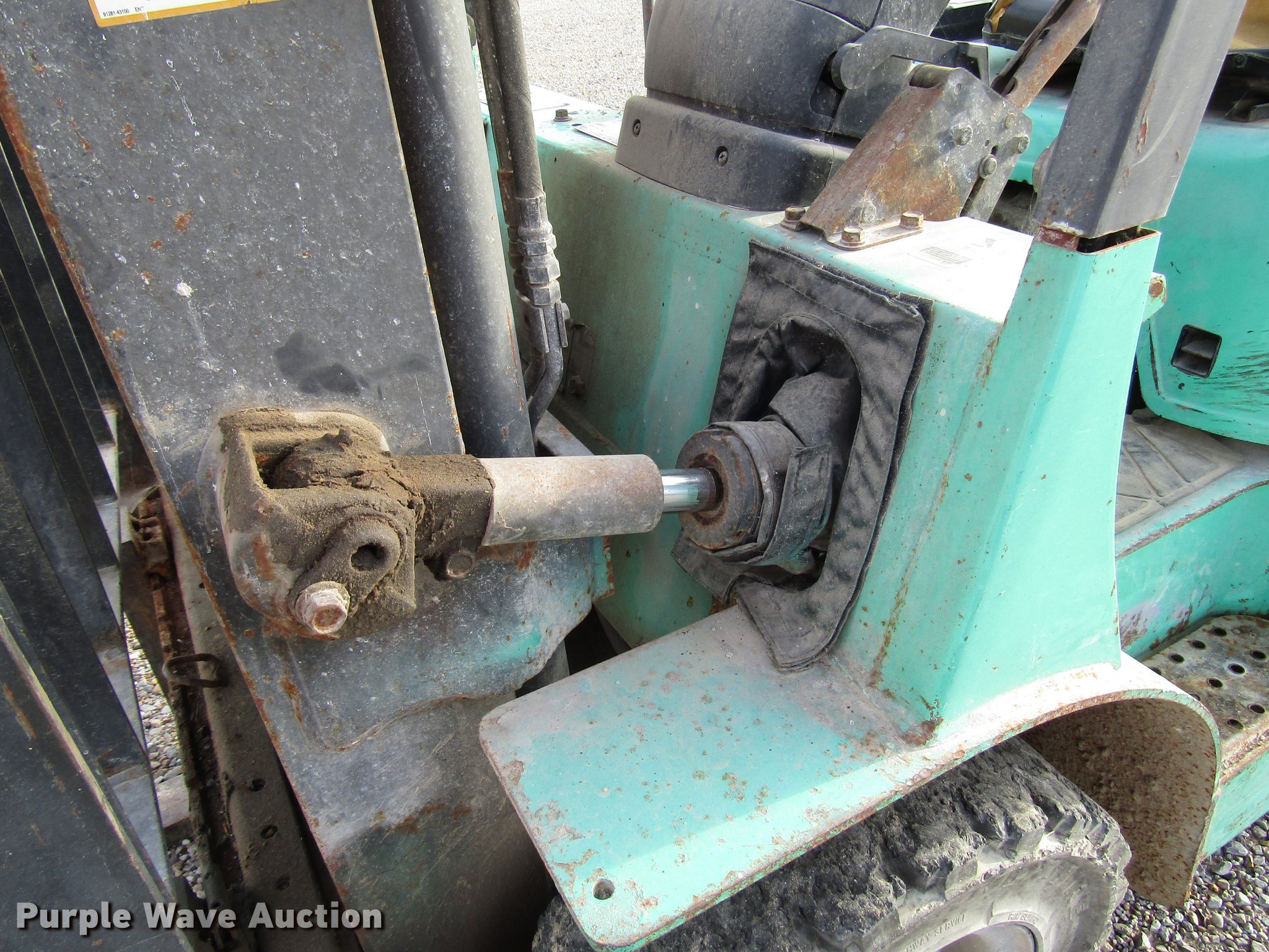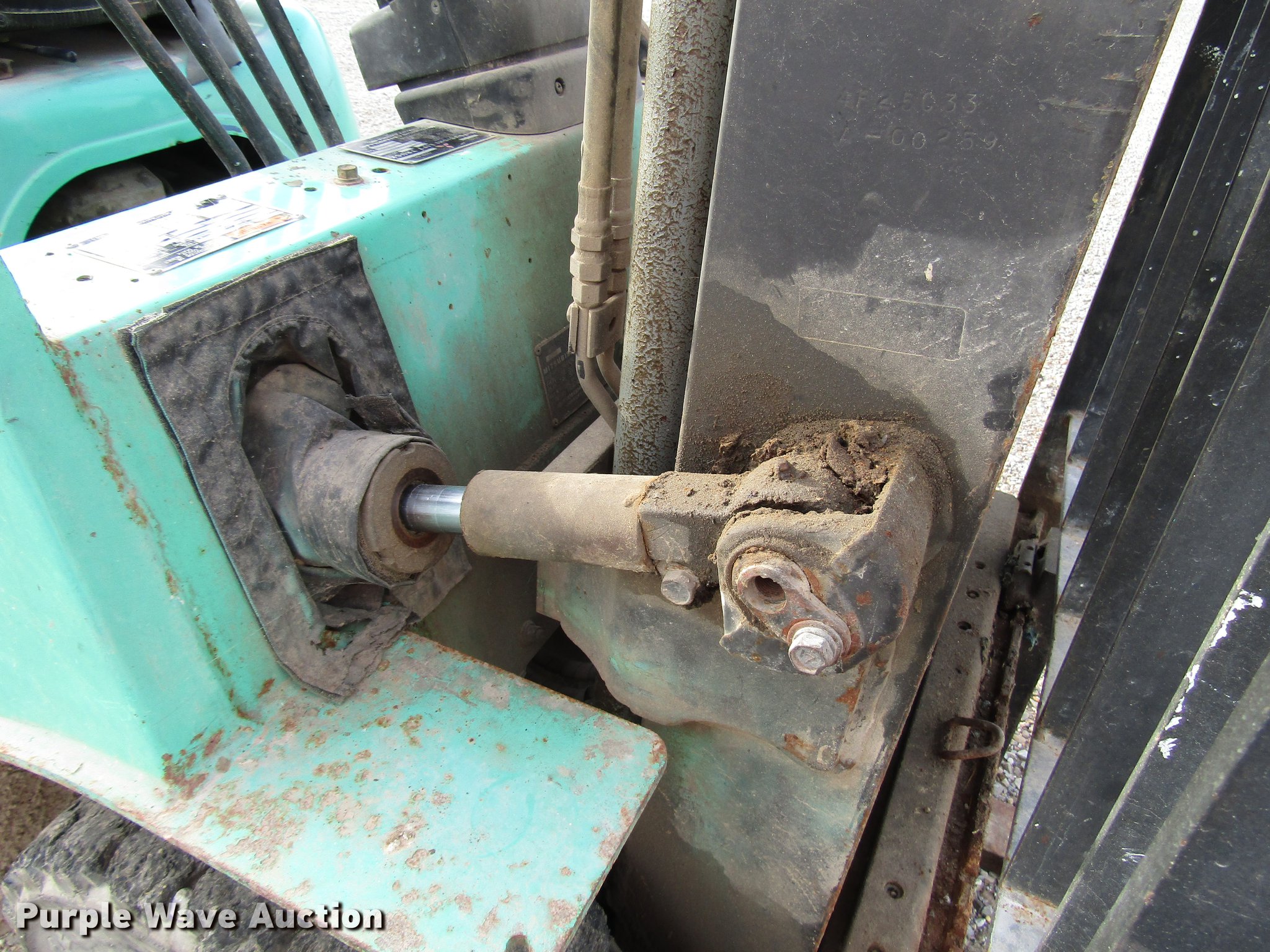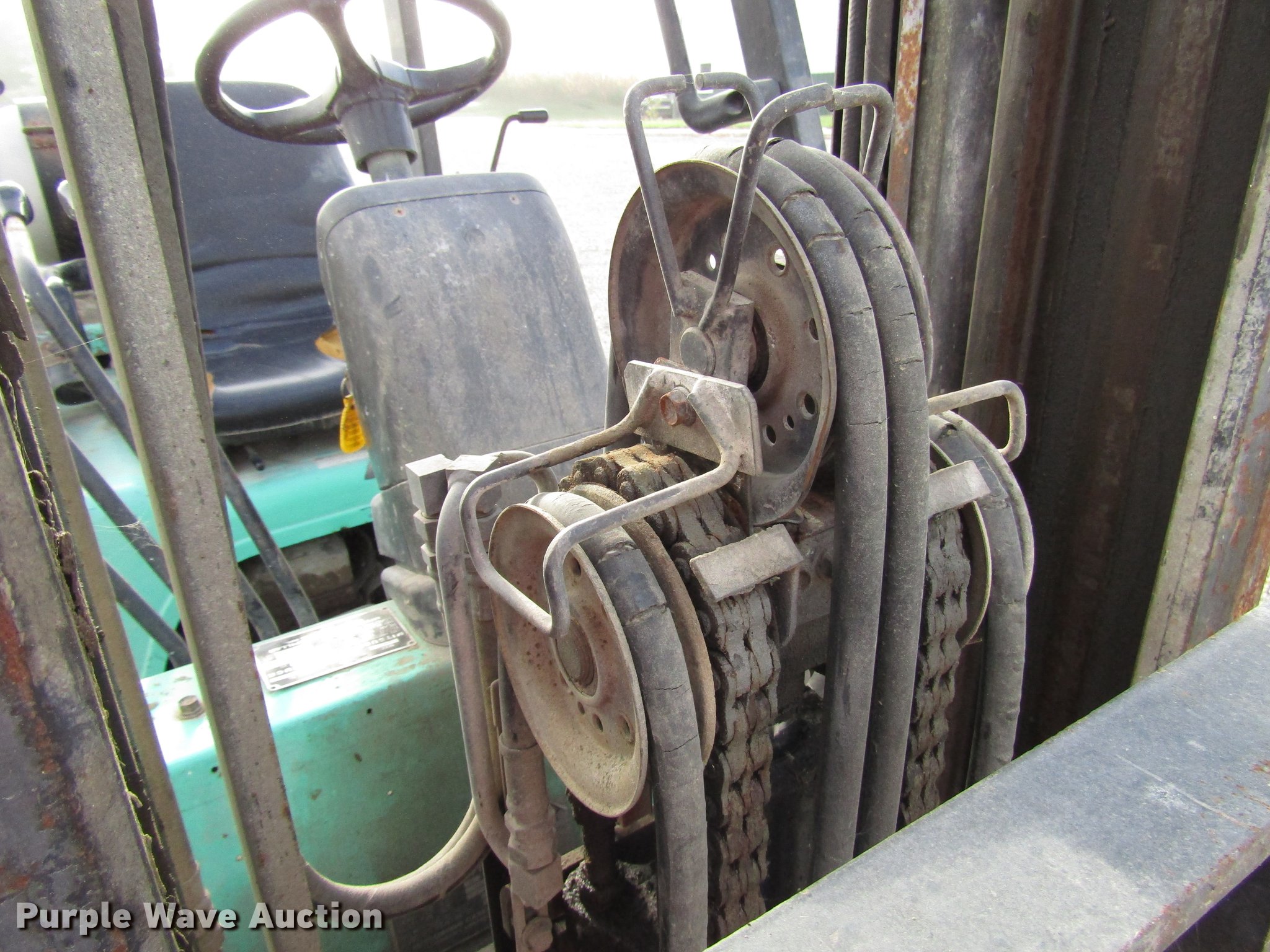 Purple Wave is selling a used Warehouse Forklift in Indiana. This item is a 2001 Mitsubishi FG25K forklift with the following: 5,026 hours on meter, Propane engine, 3,000 lbs max lift capacity, 13' max lift height, Side shift, Mast tilt, 42" fork length, Propane bottle included, 7.00/12R5.0 front tires, 6.00/9R4 rear tires, Serial AF17C00114