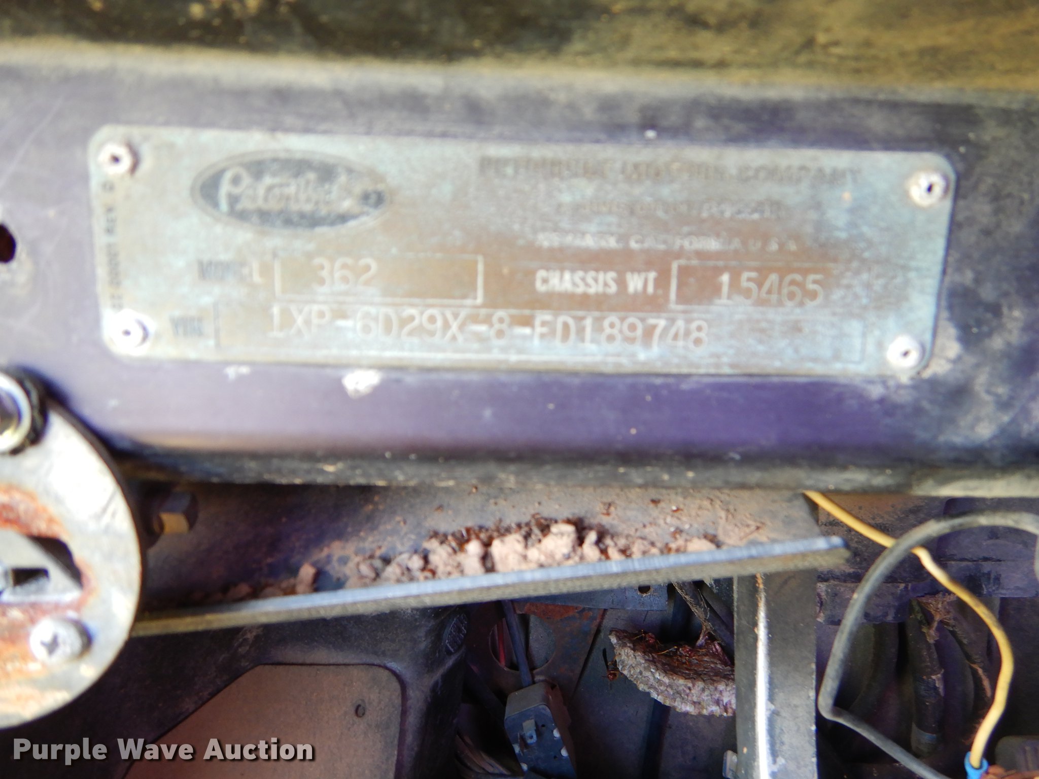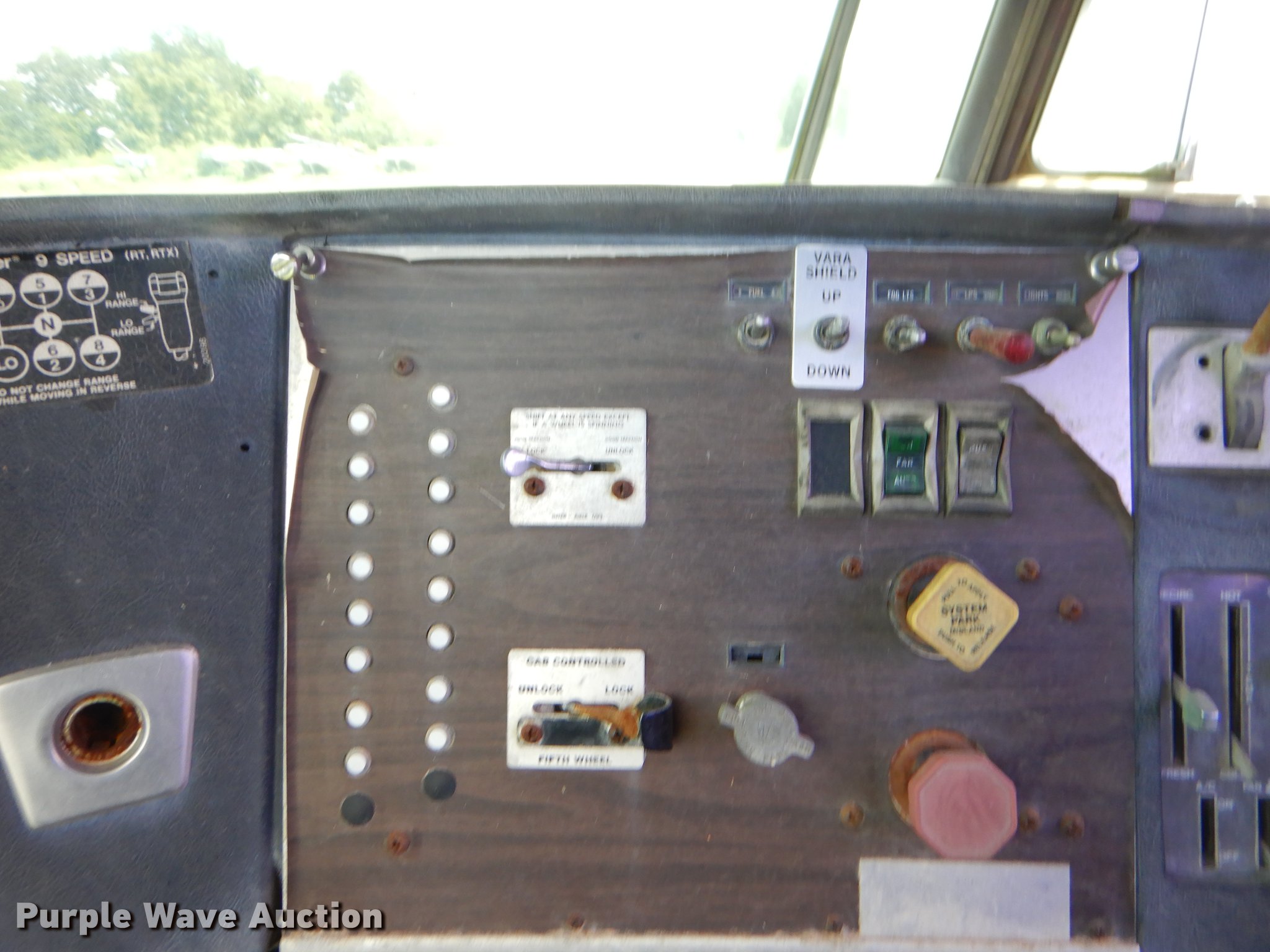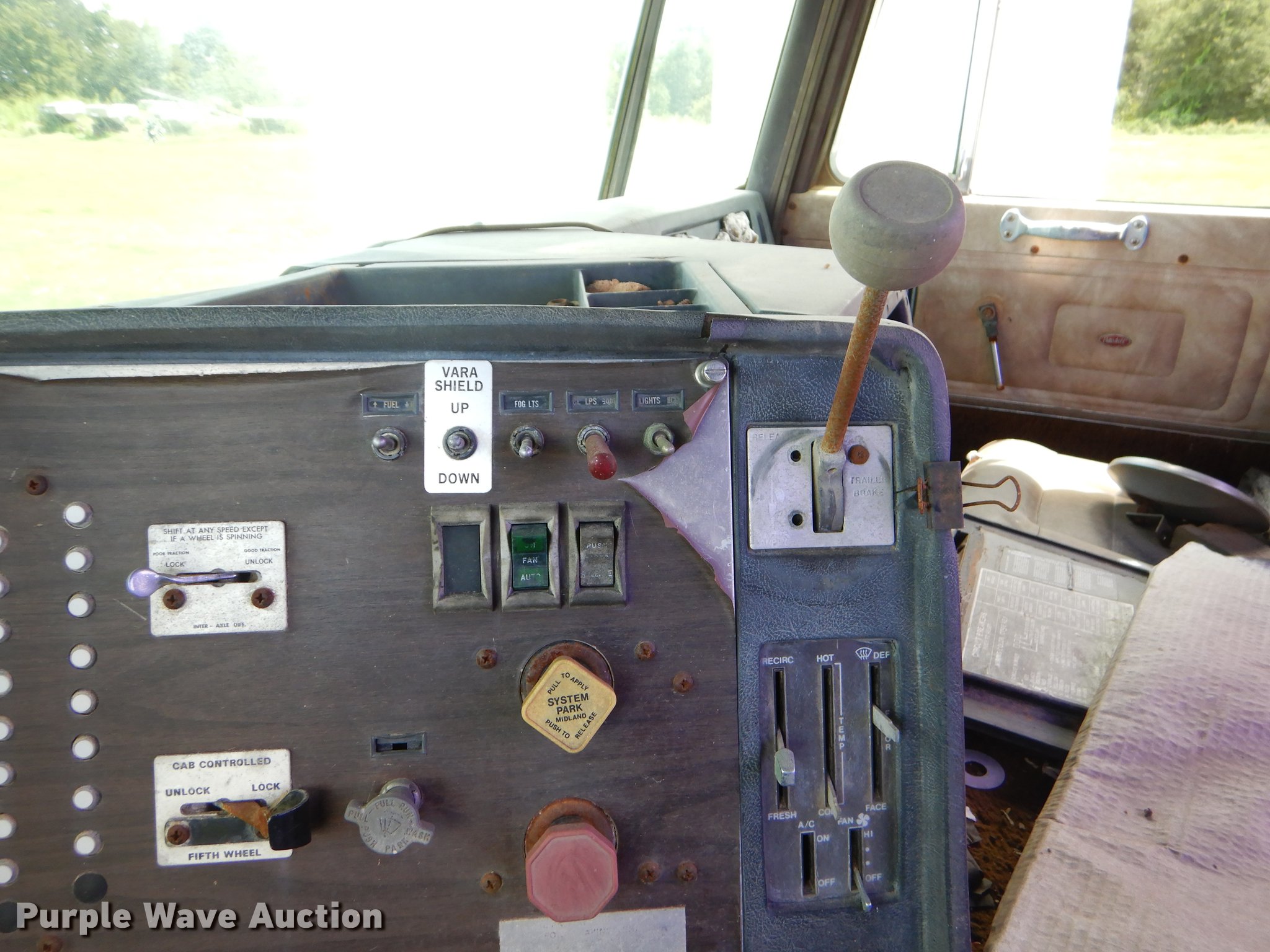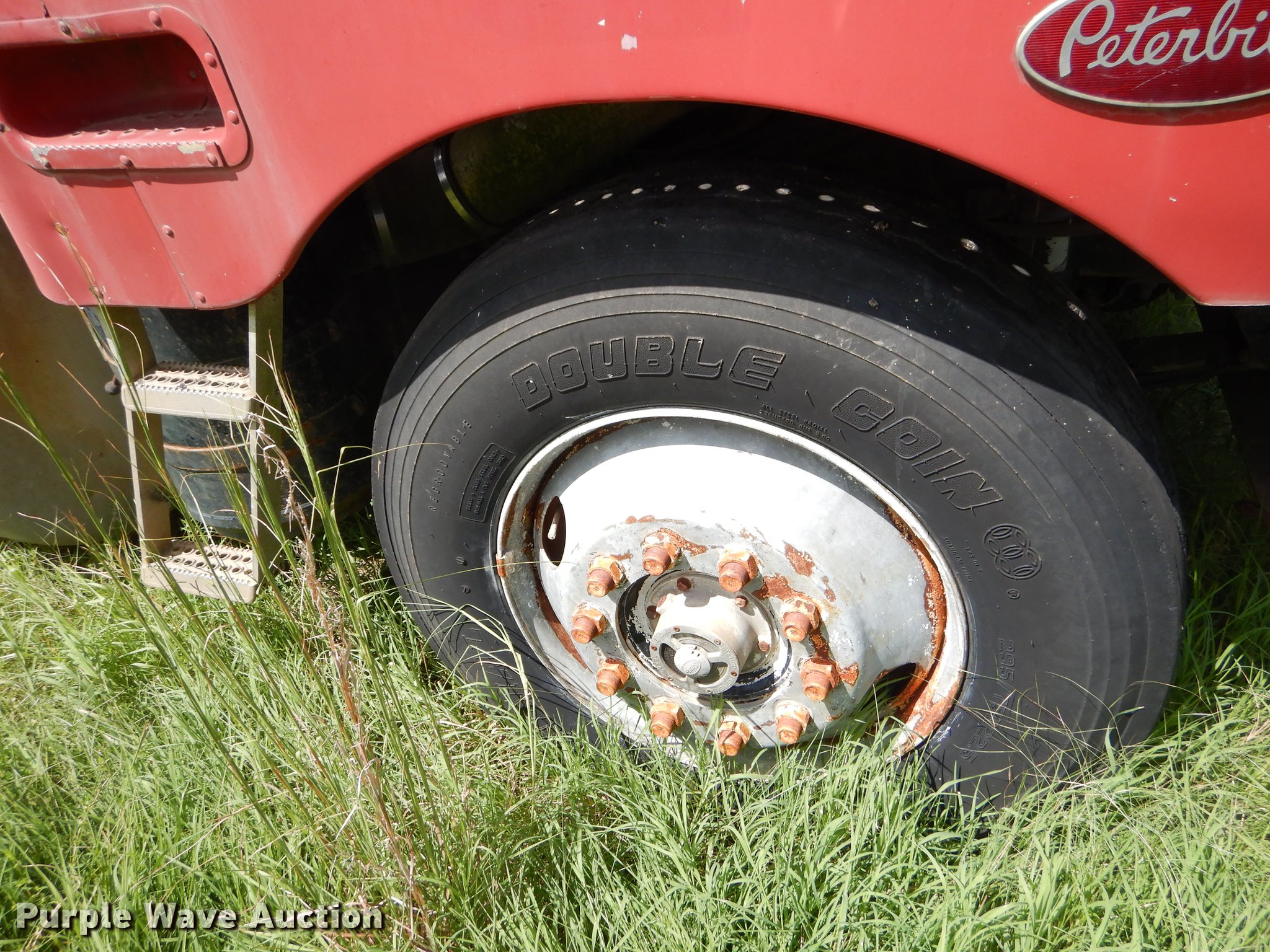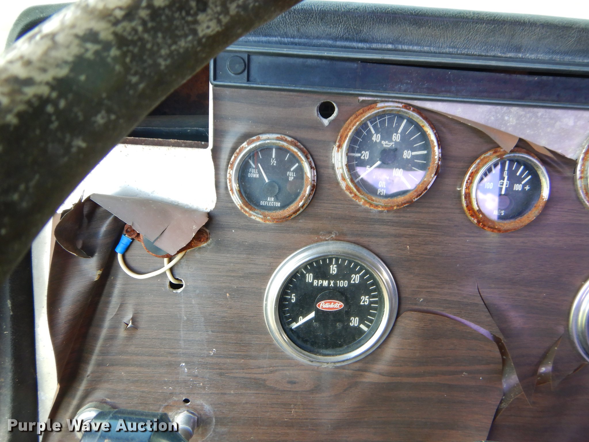 Purple Wave is selling a used Truck Tractor in Arkansas. This item is a 1985 Peterbilt 362 semi truck with the following: 790,610 miles on odometer, Six cylinder turbo diesel engine, Eaton Fuller eight speed manual transmission, Tandem axle, AC and heat, Air suspension seat, PTO, Exterior visor, Front tow hooks, Single rear exhaust stack, Air operated sliding fifth wheel plate, Dual fuel tanks, Mud flaps, Air brakes, Air suspension, 246" wheelbase, 295/75R22.5 tires, Broken windshield, Unknown operating condition, Unit did not pass DOT inspection