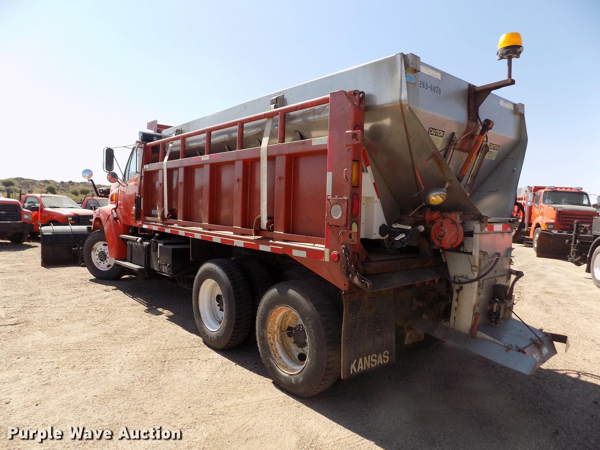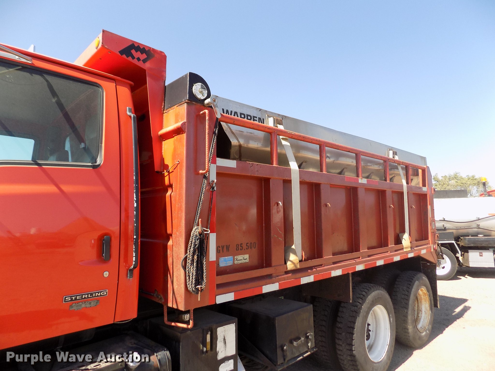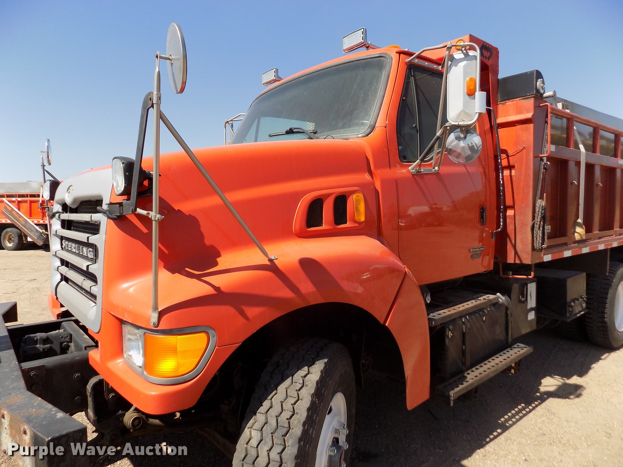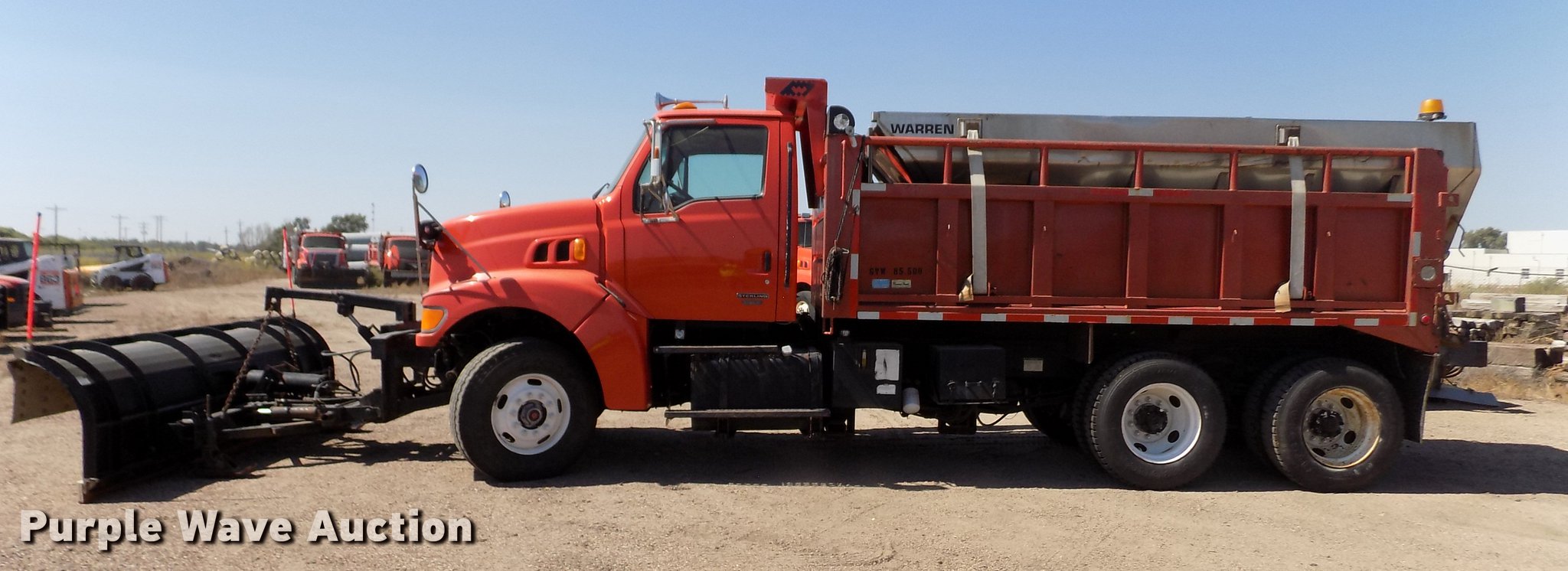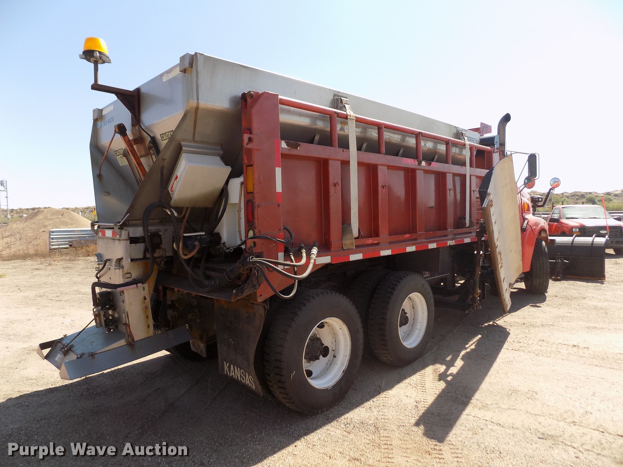 Purple Wave is selling a used Construction Dump Truck in Kansas. This item is a 2001 Sterling LT9511 dump truck with the following: 181,364 miles on odometer, 6,934 hours on meter, Caterpillar C10 10.3L L6 turbo diesel engine, Serial 3CS18934, Eaton Fuller Road Ranger eight speed manual transmission, Tandem axle, Inter-axle differential lock, AC and heat, Cruise, AM/FM, Heated mirrors, Air suspension seat, Block heater, PTO, Warren L650 steel dump bed, 15'L x 96"W, 36" side height, Single ram hoist, Manual operated end gate, Roll tarp, Toolboxes, Flink 12PA44KS00B snow plow, 12'W, 8'W wing snow plow, Warren AC2420A spreader, Nine cu.yd. capacity, Force spreader controls, Single fuel tank, Pintle hitch, Trailer wiring, Camelback suspension, Air brakes, 315/80R22.5 front tires, 295/75R22.5 rear tires, GVWR 58,000 lbs, FAWR 18,000 lbs, IAWR 20,000 lbs, RAWR 20,000 lbs, KDOT ID 263-6070