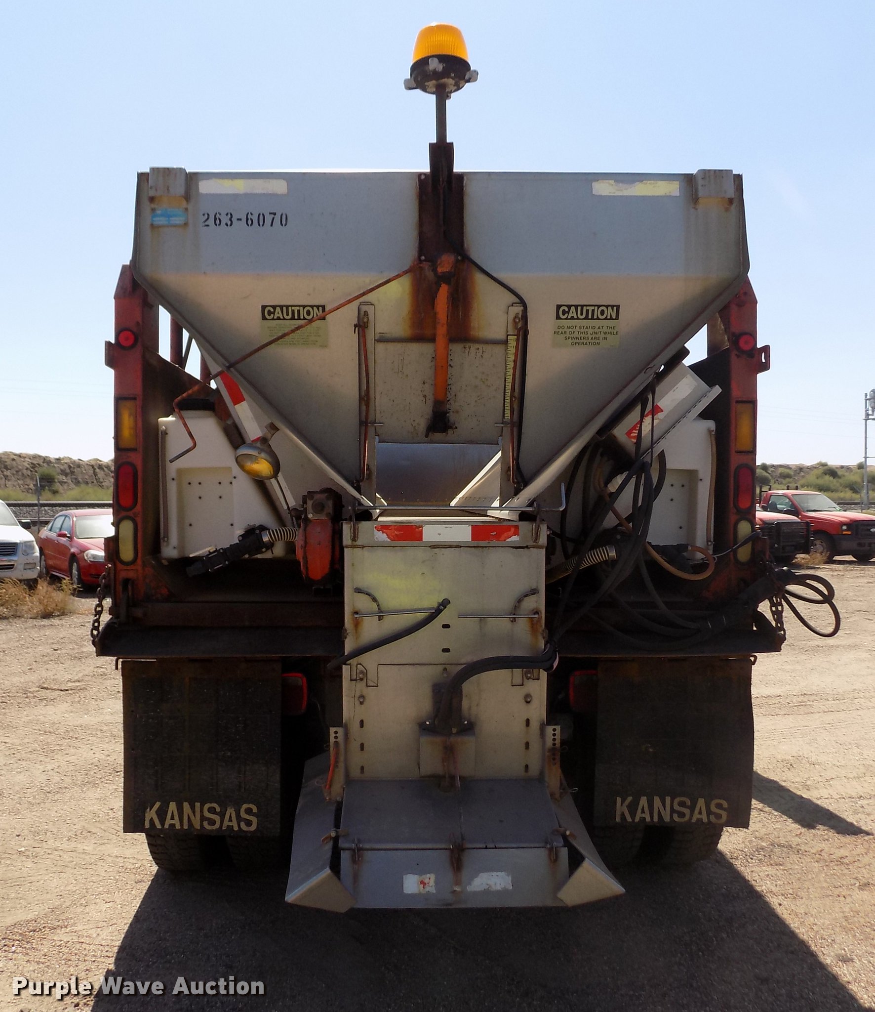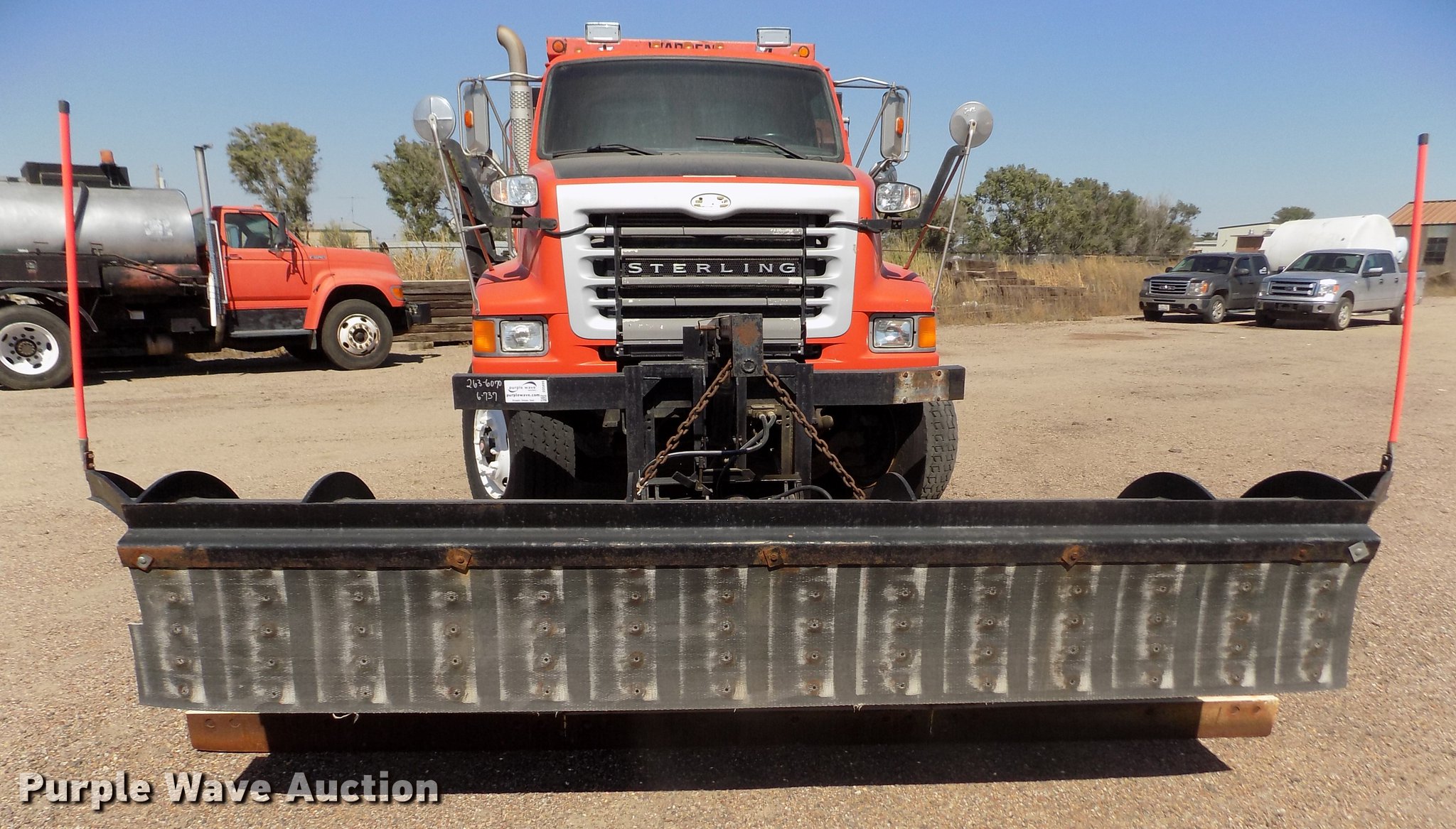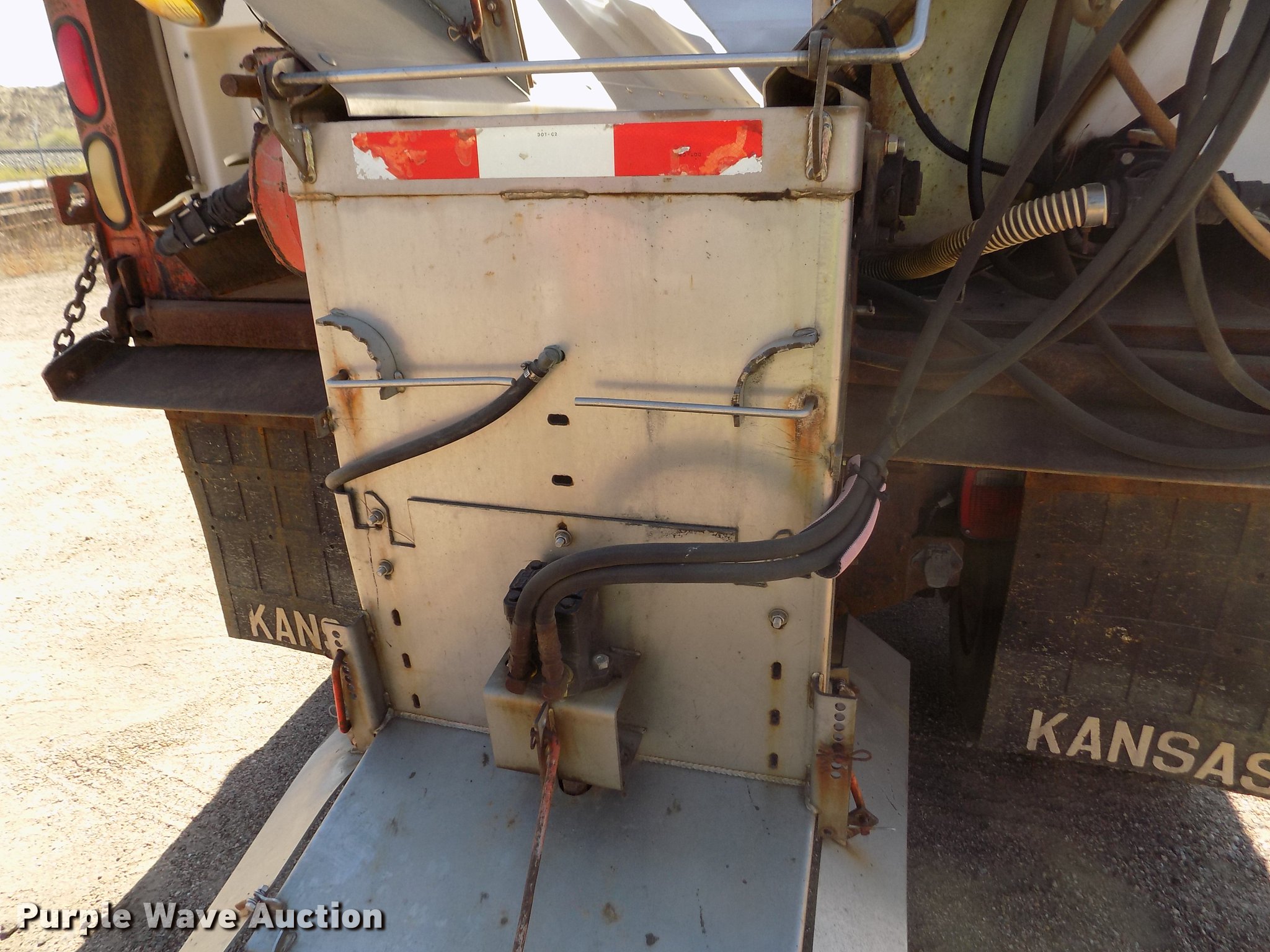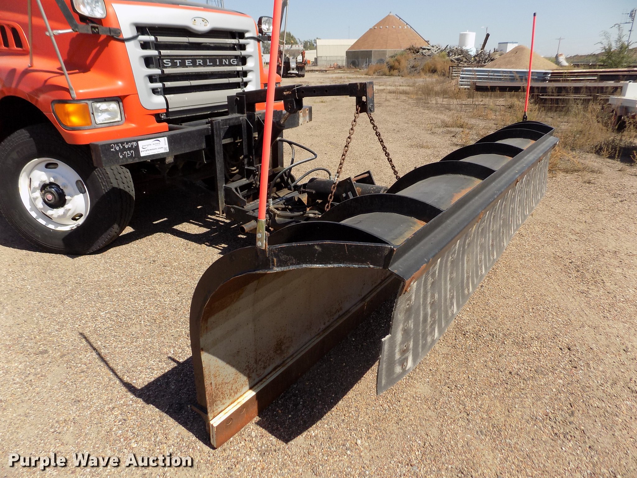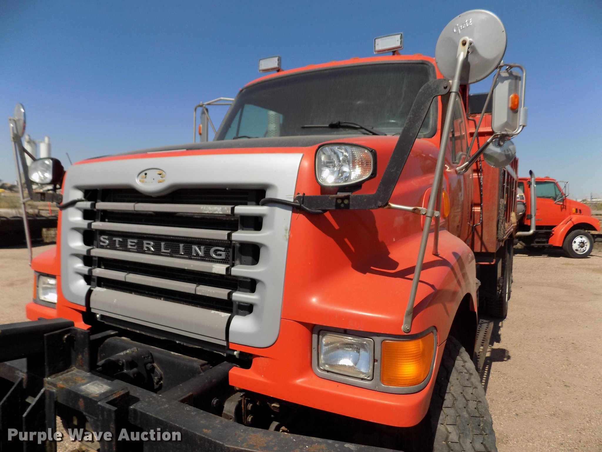 Purple Wave is selling a used Construction Dump Truck in Kansas. This item is a 2001 Sterling LT9511 dump truck with the following: 181,364 miles on odometer, 6,934 hours on meter, Caterpillar C10 10.3L L6 turbo diesel engine, Serial 3CS18934, Eaton Fuller Road Ranger eight speed manual transmission, Tandem axle, Inter-axle differential lock, AC and heat, Cruise, AM/FM, Heated mirrors, Air suspension seat, Block heater, PTO, Warren L650 steel dump bed, 15'L x 96"W, 36" side height, Single ram hoist, Manual operated end gate, Roll tarp, Toolboxes, Flink 12PA44KS00B snow plow, 12'W, 8'W wing snow plow, Warren AC2420A spreader, Nine cu.yd. capacity, Force spreader controls, Single fuel tank, Pintle hitch, Trailer wiring, Camelback suspension, Air brakes, 315/80R22.5 front tires, 295/75R22.5 rear tires, GVWR 58,000 lbs, FAWR 18,000 lbs, IAWR 20,000 lbs, RAWR 20,000 lbs, KDOT ID 263-6070
