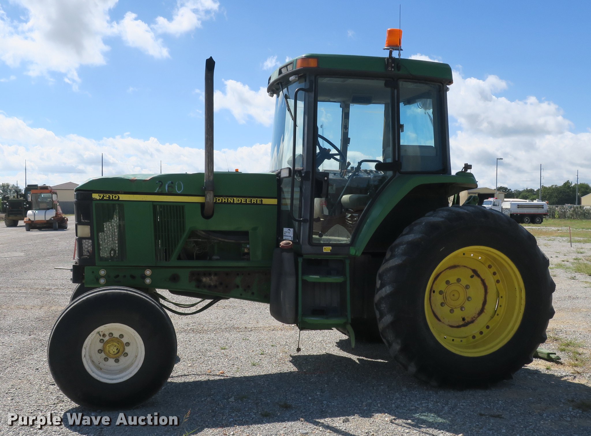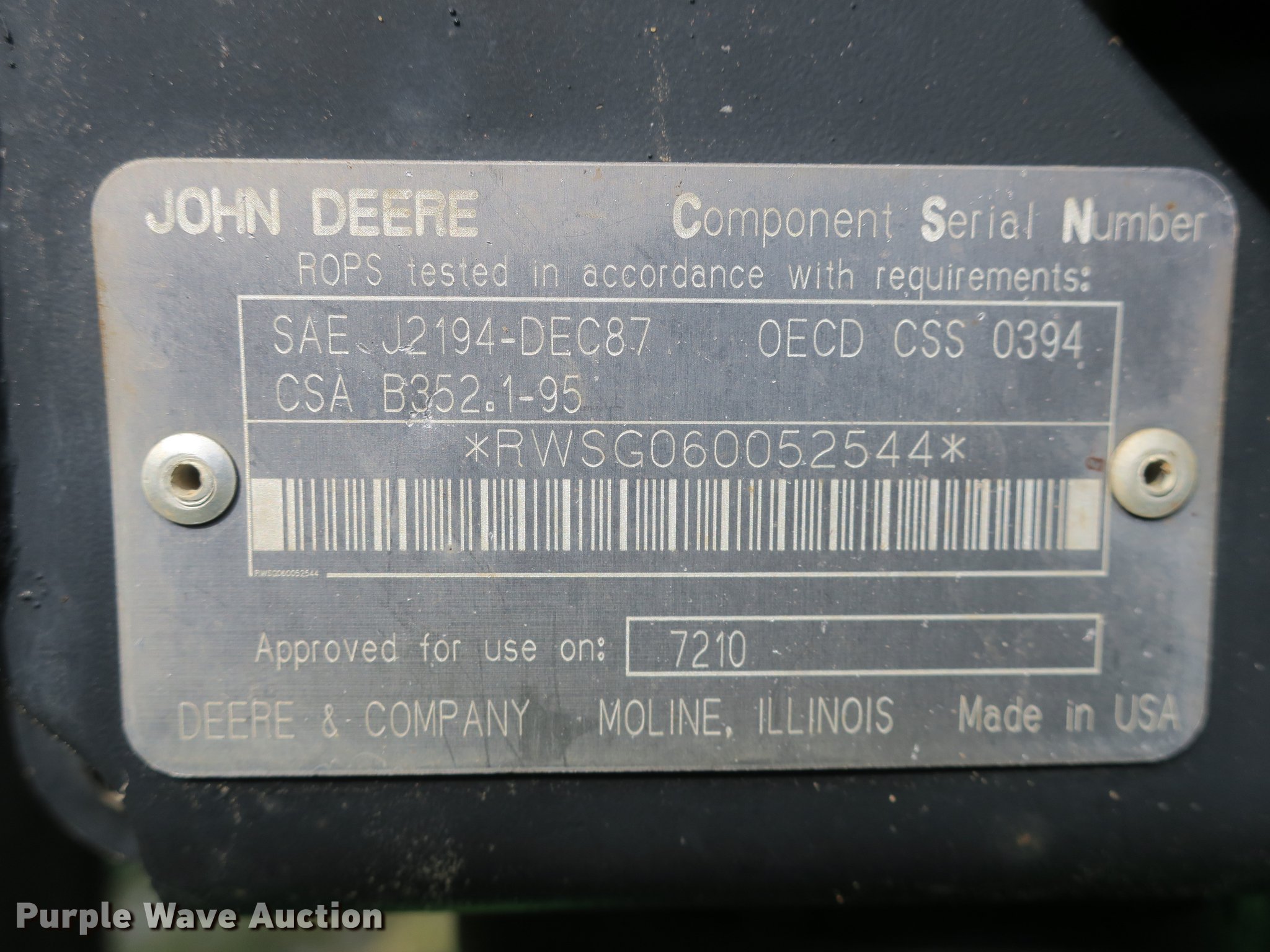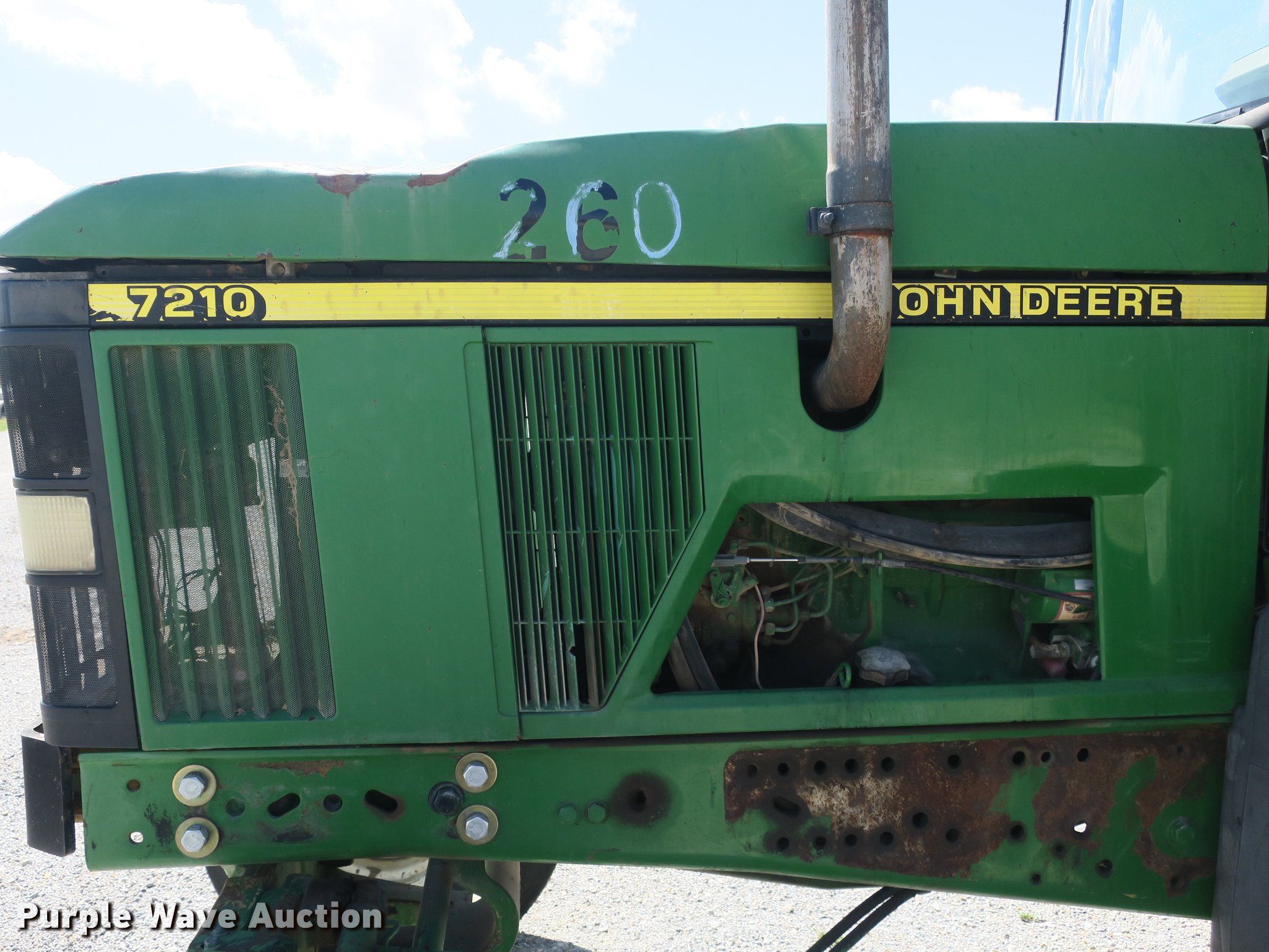 Purple Wave is selling a used Tractor in Arkansas. This item is a John Deere 7210 tractor with the following: 1,046 hours on meter, John Deere six cylinder turbo diesel engine, Quad-Range transmission, 12F-4R gears, AC and heat, AM/FM, Spring suspension seat, Three point, Unattached, 540 PTO, Seven pin outlet, Rear hydraulic remote sets, 11.00-16 front tires, 480/70R34 rear tires, Maintenance and service records available upon request, Serial BW7210R055650