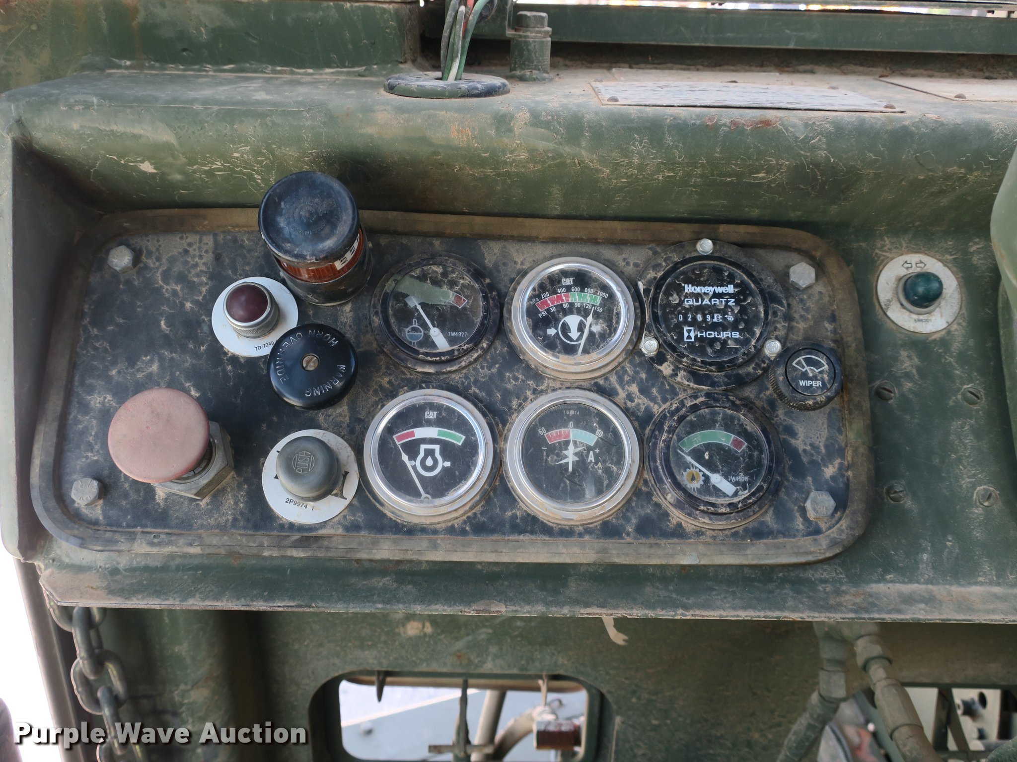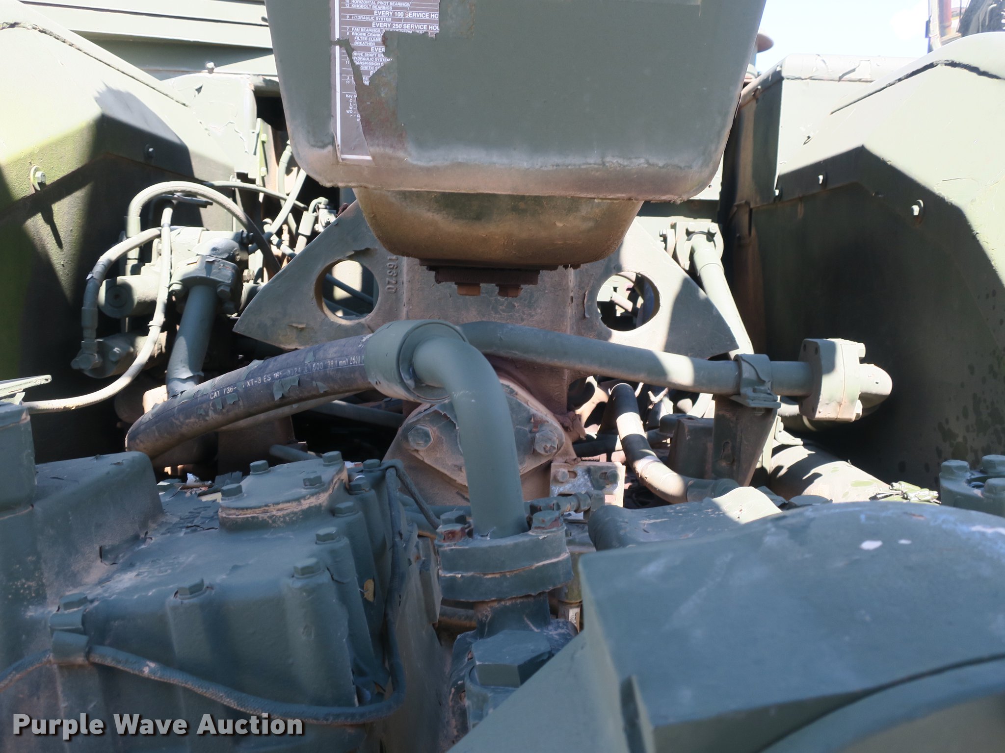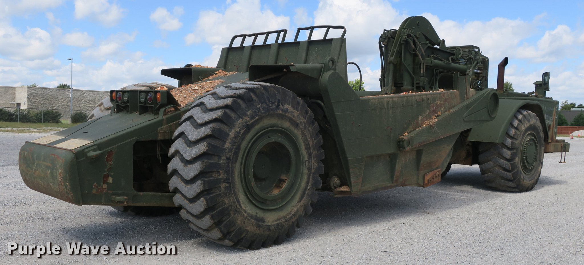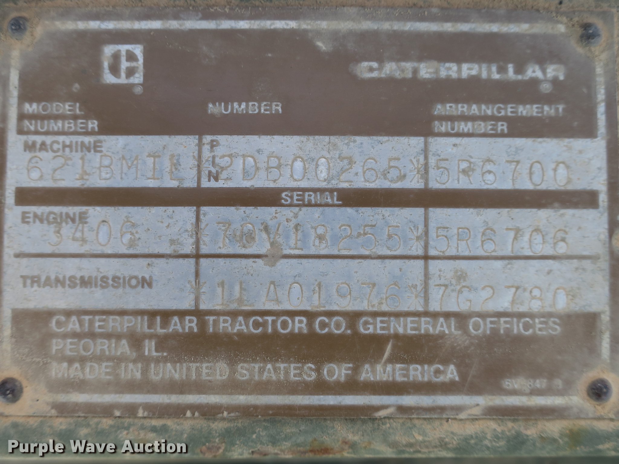 Purple Wave is selling a used Conventional Scraper in Arkansas. This item is a 1985 Caterpillar 621B MIL conventional scraper with the following: 210 hours on meter, Caterpillar 3406 six cylinder turbo diesel engine, Powershift transmission, 8F-1R gears, EROPS, Heat, Suspension seat, Backup alarm, Wipers, 14 to 18 cu.yd. bowl capacity, Reversible cutting edge, Hydraulic lift, Three lever scraper controls, Front work lights, Air brakes, 29.5-29 tires, Maintenance and service records available upon request, Serial 2DB00265