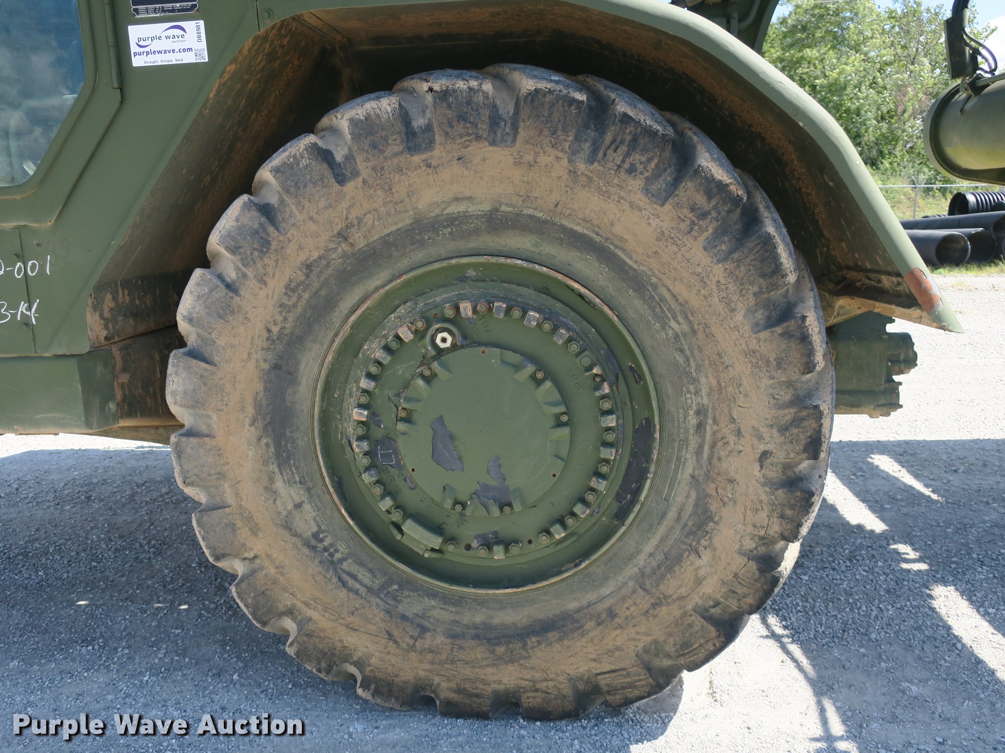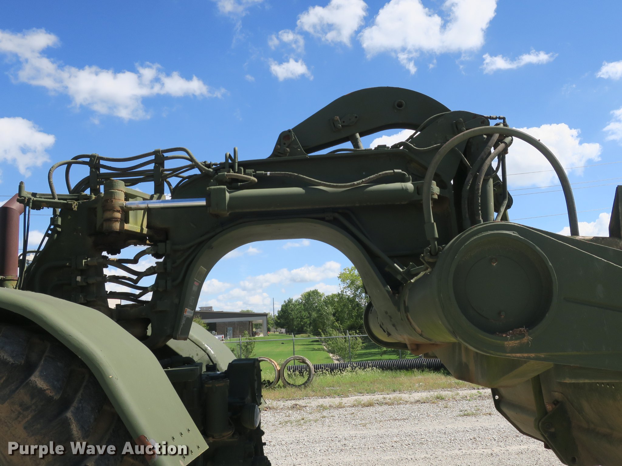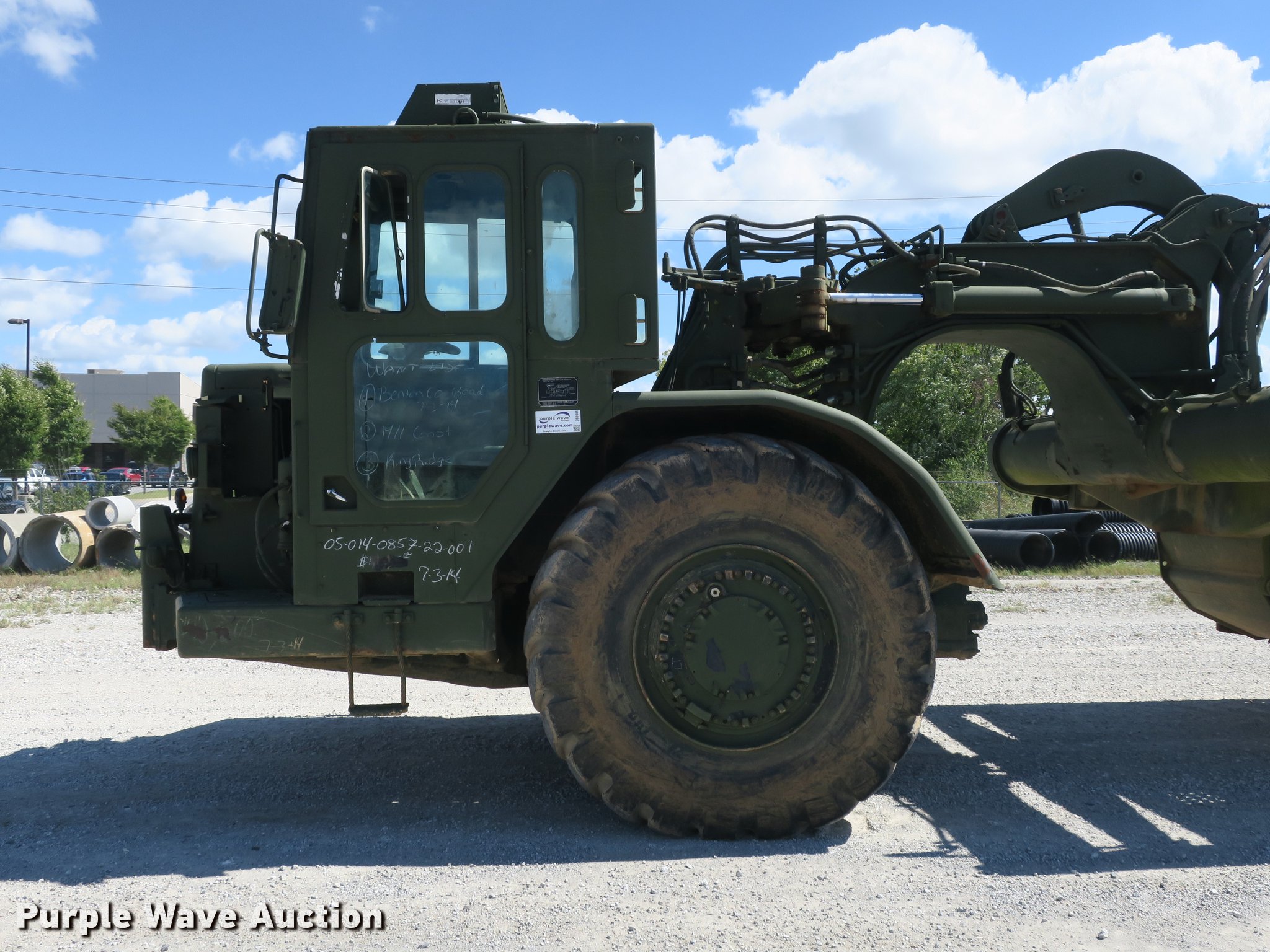 1985 Caterpillar 621B MIL conventional scraper. 210 hours on meter, Caterpillar 3406 six cylinder turbo diesel engine, Powershift transmission 8F-1R gears, EROPS Heat, Suspension seat, Backup alarm, Wipers, 14 to 18 cu.yd. bowl capacity, Reversible cutting edge, Hydraulic lift, Three lever scraper controls, Front work lights, Air brakes, 29.5-29 tires, Maintenance and service records available upon request, Serial 2DB00265. Benton County - Open inspection Oct. 16. 1208 SW 14th St. Bentonville, AR 72712