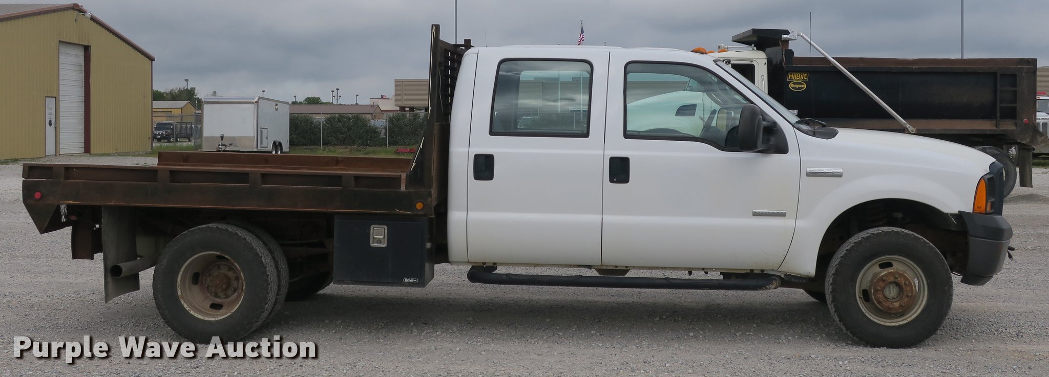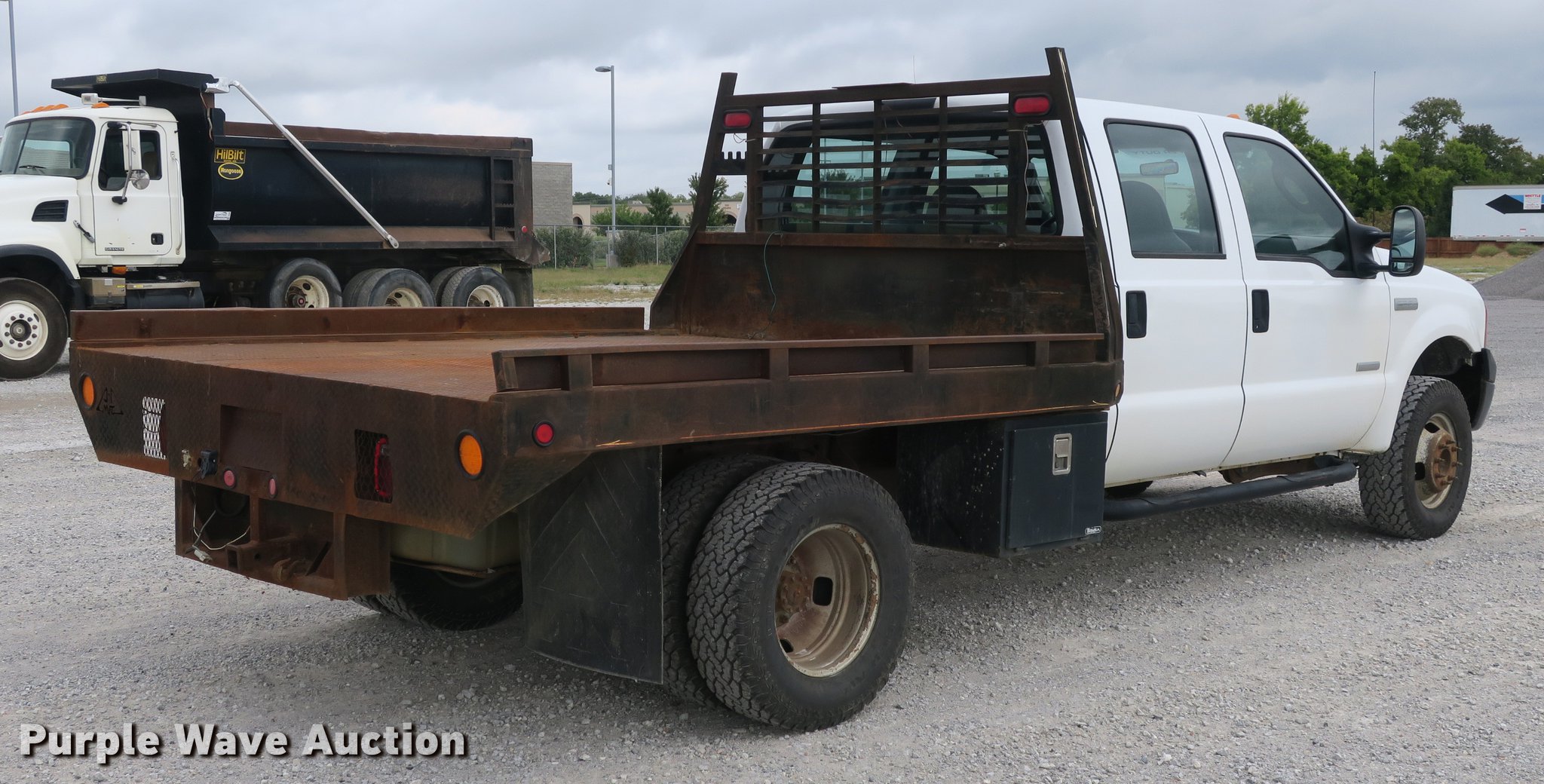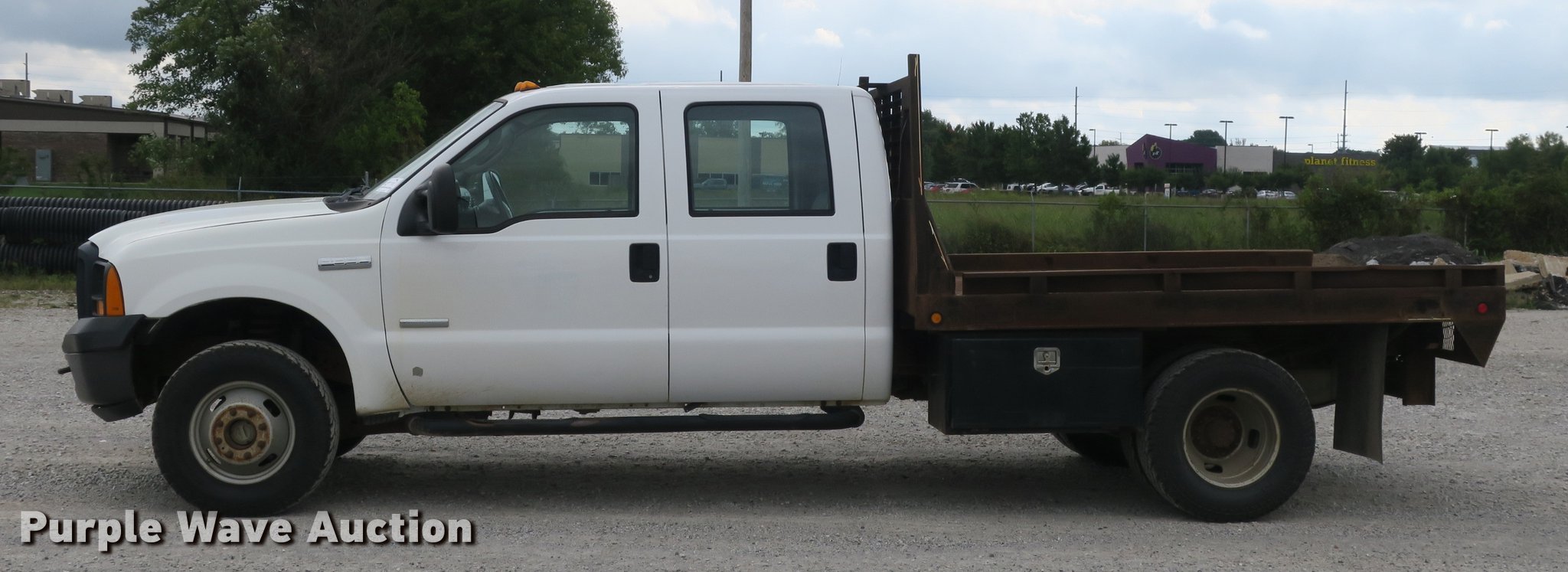 This 2006 Ford F350 Super Duty Crew Cab flatbed pickup truck will sell to the highest bidder regardless of price.