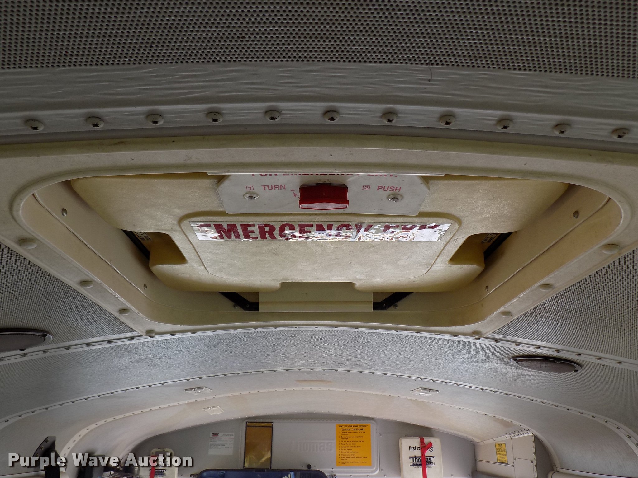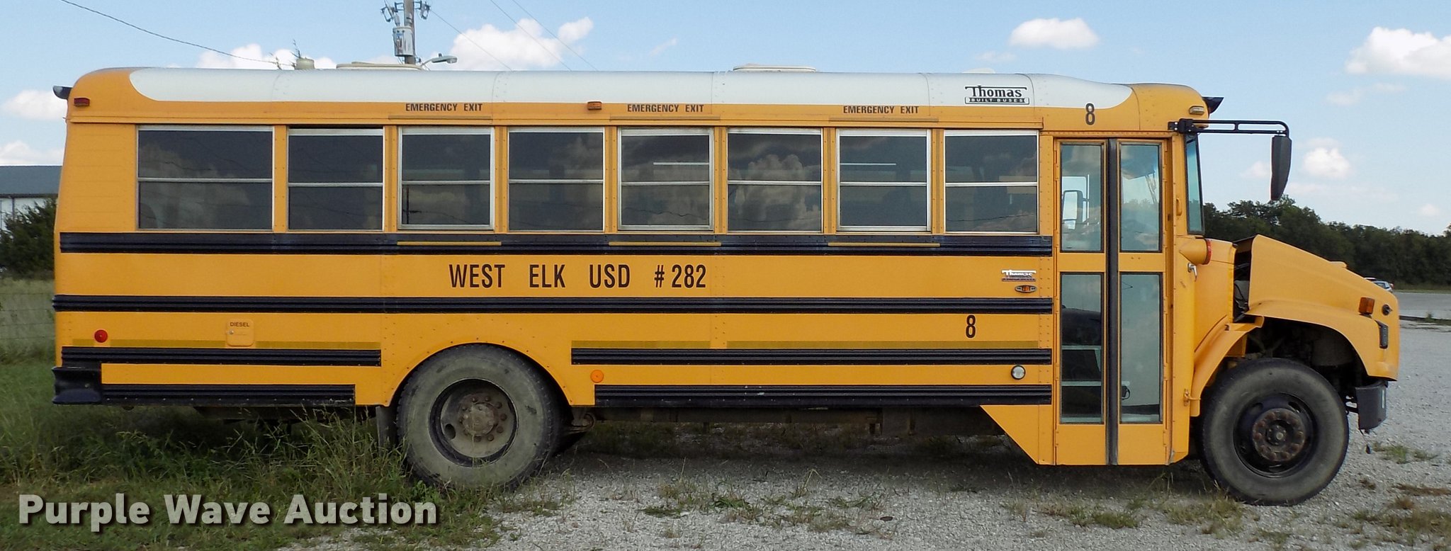 Purple Wave is selling a used Bus in Kansas. This item is a 2004 Freightliner FS65 Thomas school bus with the following: Unknown miles on odometer, Caterpillar C7 7.2L L6 diesel engine, Five speed manual transmission, Heat, AM/FM/cassette, (12) adult seats, (4) child safety seats, Ceiling, rear, and side emergency exits, Beacon light, Stop sign, 11R22.5 tires, GVWR 27,500 lbs, Hood latch broken, hood will not open, Unknown operating condition