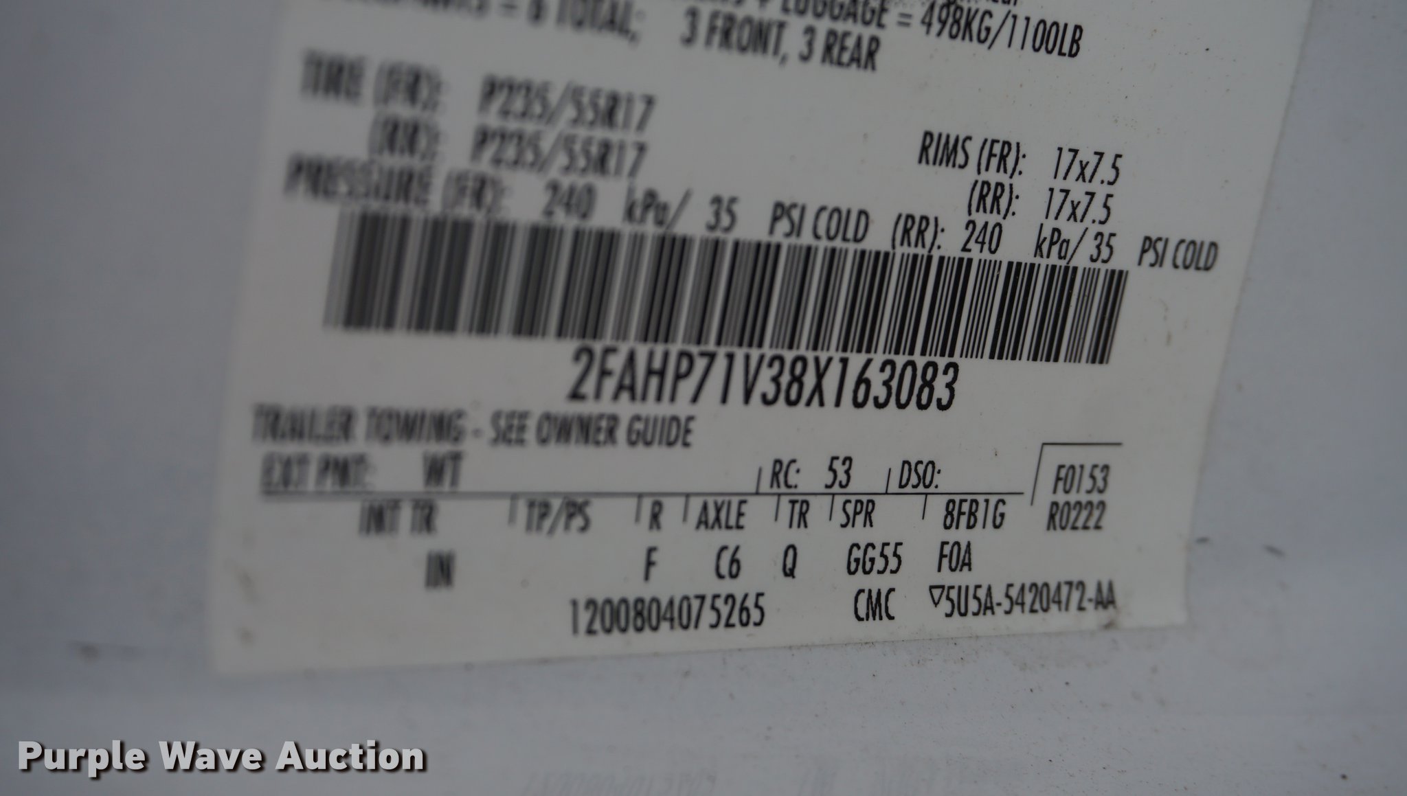 2008 Ford Crown Victoria Police Interceptor. 34,652 miles on odometer, 4.6L V8 SOHC 16V FFV gas engine, Automatic transmission, AC and heat, Tilt, Cruise, AM/FM, Power windows, locks, mirrors, and seat, Cloth front interior, Vinyl rear interior, Grill guard, Spotlight, 235/55R17 tires, Front bumper and grill damage. Kansas title. 2FAHP71V38X163083. City of Prairie Village Police Department. 7710 Mission Rd. Prairie Village, KS 66208