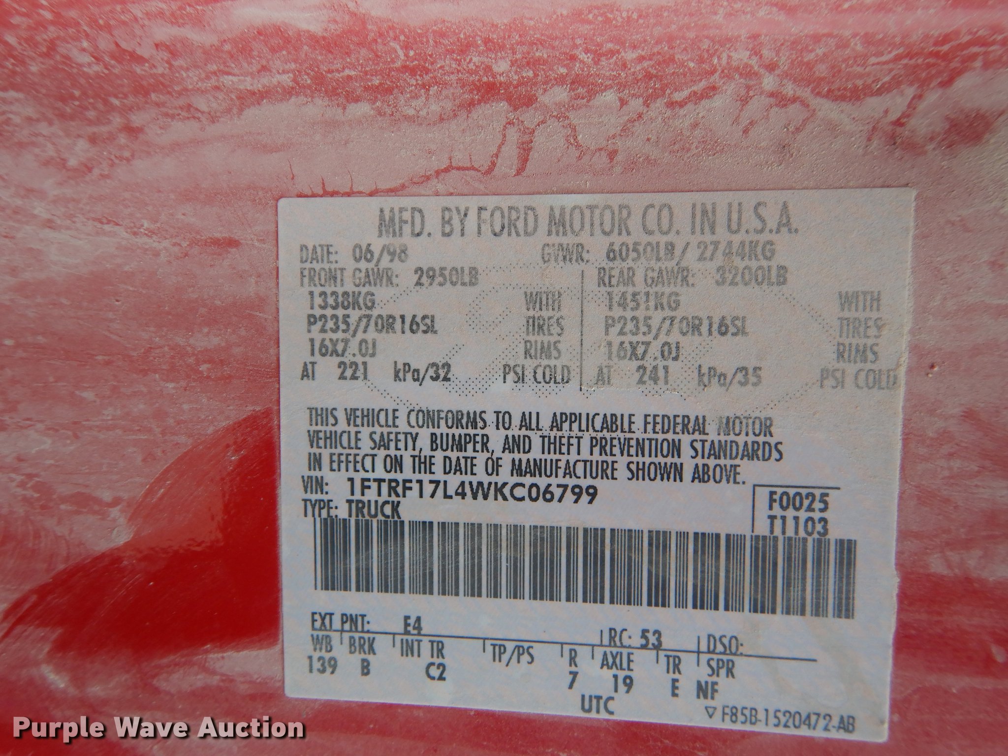 Purple Wave is selling a used 1/2 Ton Pickup or Van in Kansas. This item is a 1998 Ford F150 XL pickup truck with the following: 171,449 miles on odometer, 5.4L V8 SOHC 16V gas engine, Automatic transmission, AC and heat, AM/FM, Cloth interior, Bed liner, Kumho 245/70R16 tires, Check engine light on, Tailgate is hard to close, Unit# 400