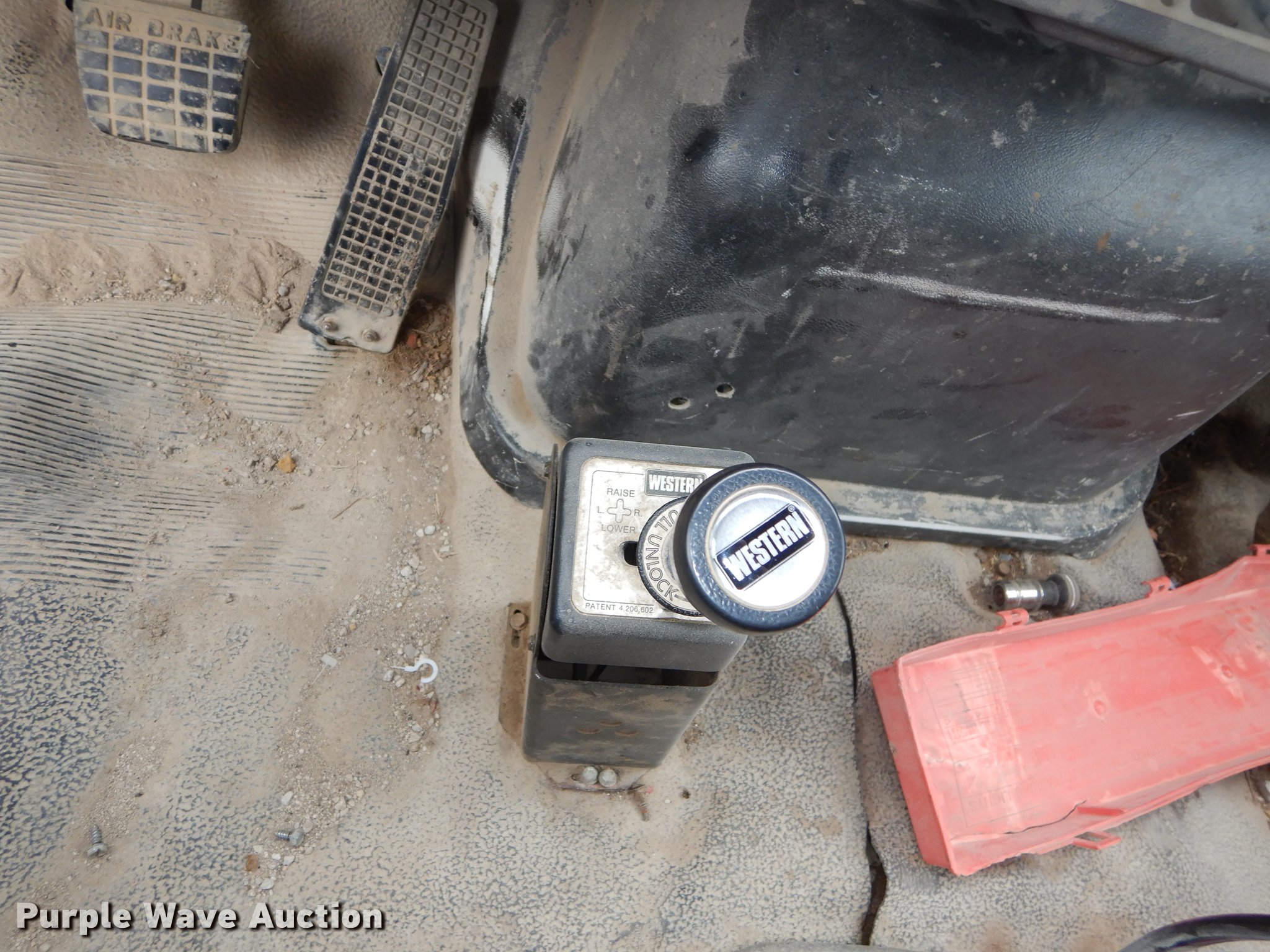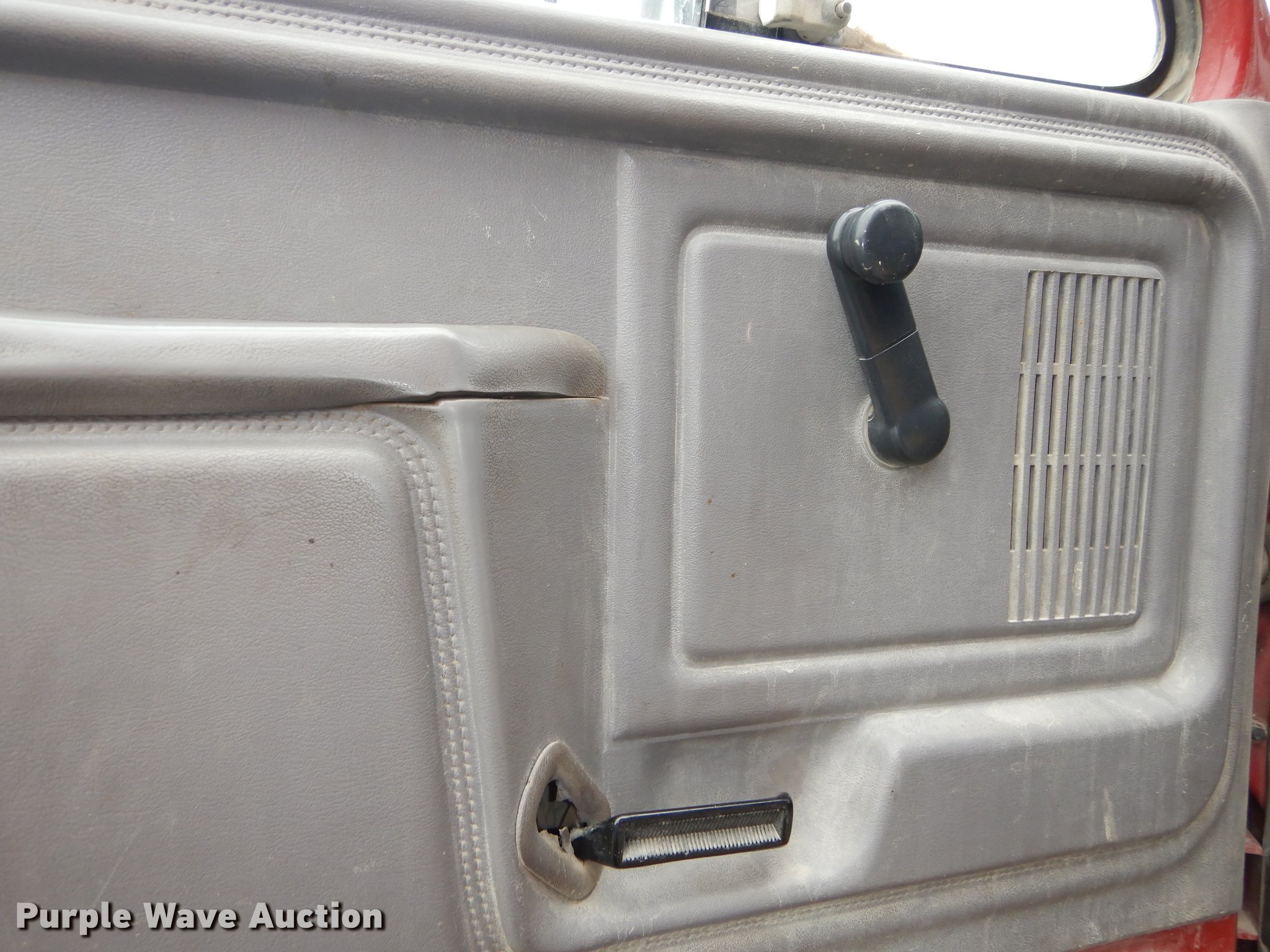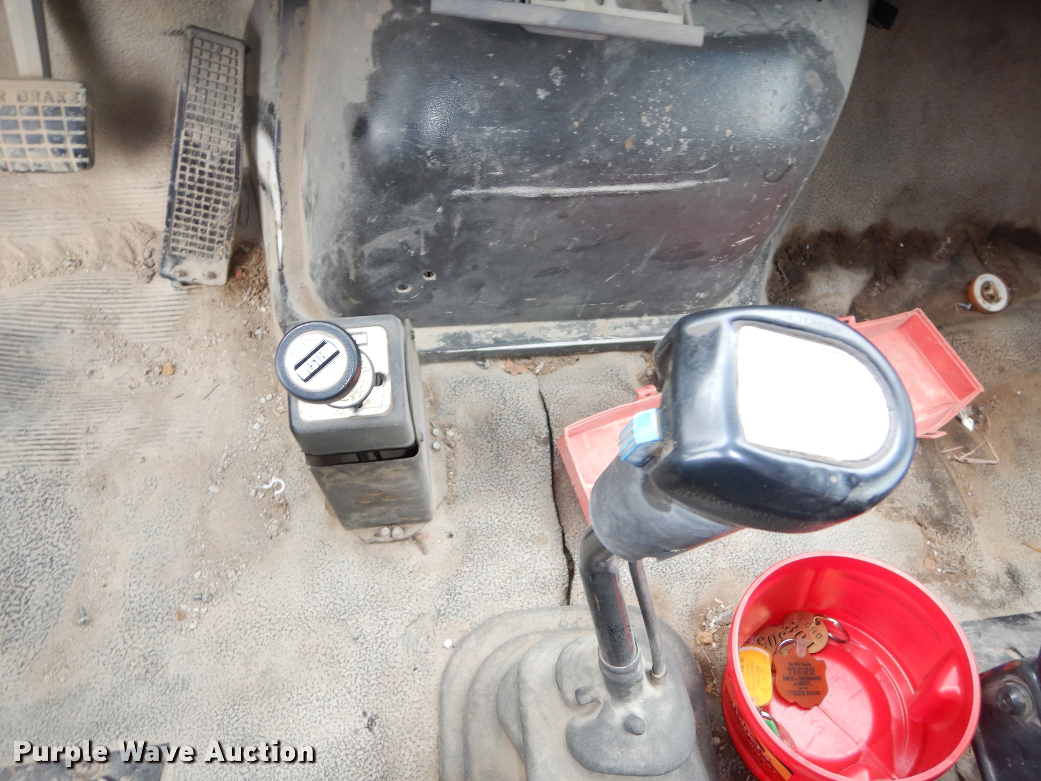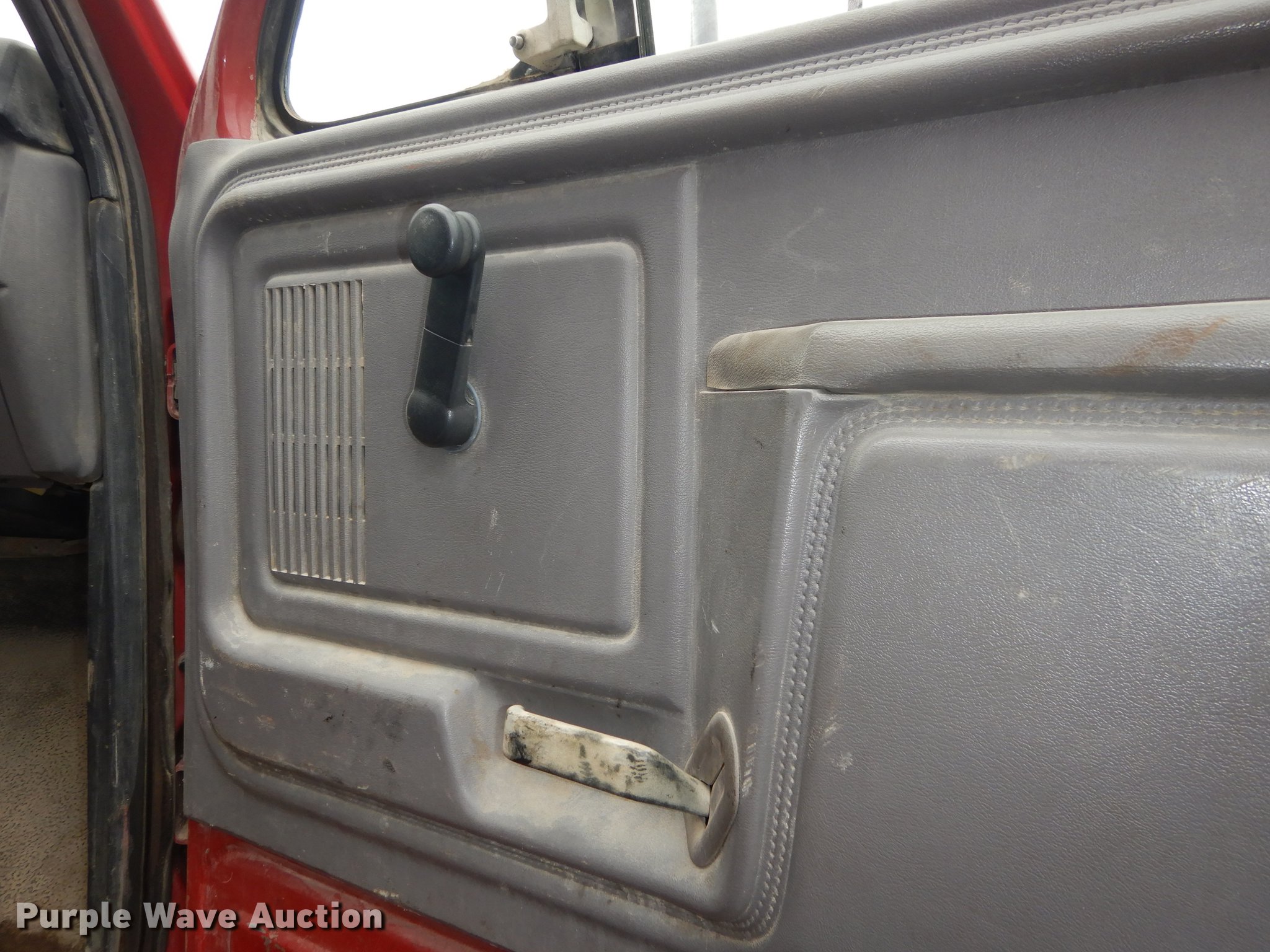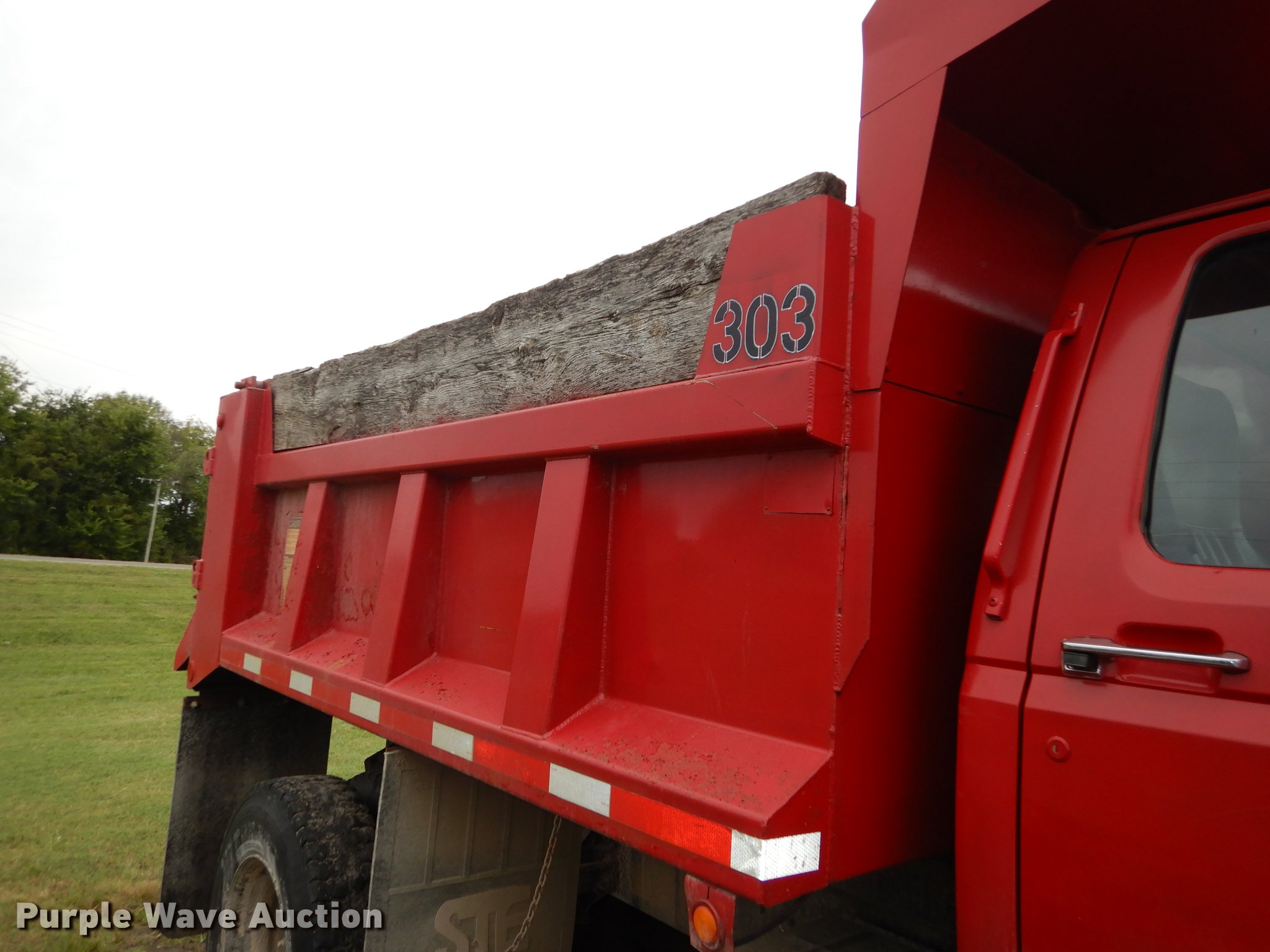 Purple Wave is selling a used Construction Dump Truck in Kansas. This item is a 1997 Ford F800 dump truck with the following: 90,649 miles on odometer, Cummins 8.3L L6 turbo diesel engine, Eaton Fuller Road Ranger RT7608LL eight speed manual transmission, Single axle, AC and heat, AM/FM, Vinyl interior, Strobe light, Block heater, 10'L x 94"W steel dump bed, 22" side height, 12" side board height, Single ram hoist, Manual end gate, Western 9'W plow, Dual fuel tanks, Air brakes, 158" wheelbase, 11R22.5 tires, GVWR 35,000 lbs, FAWR 12,000 lbs, RAWR 23,000 lbs, Dead batteries, Fuel and temperature gauges inoperable, Speedometer inoperable, Plow control box inoperable, Non-operational AC, Unit# 303