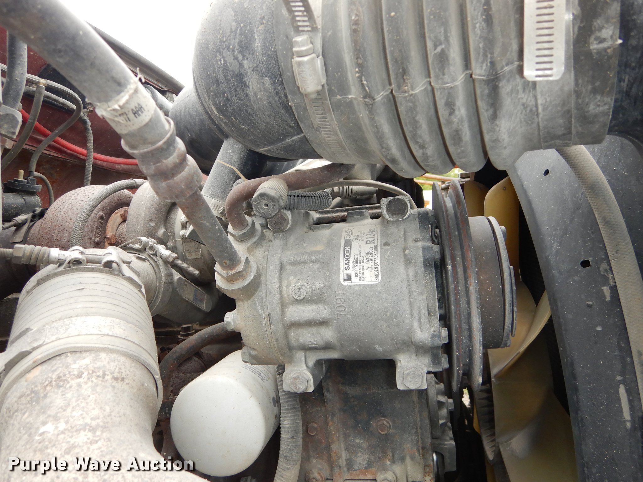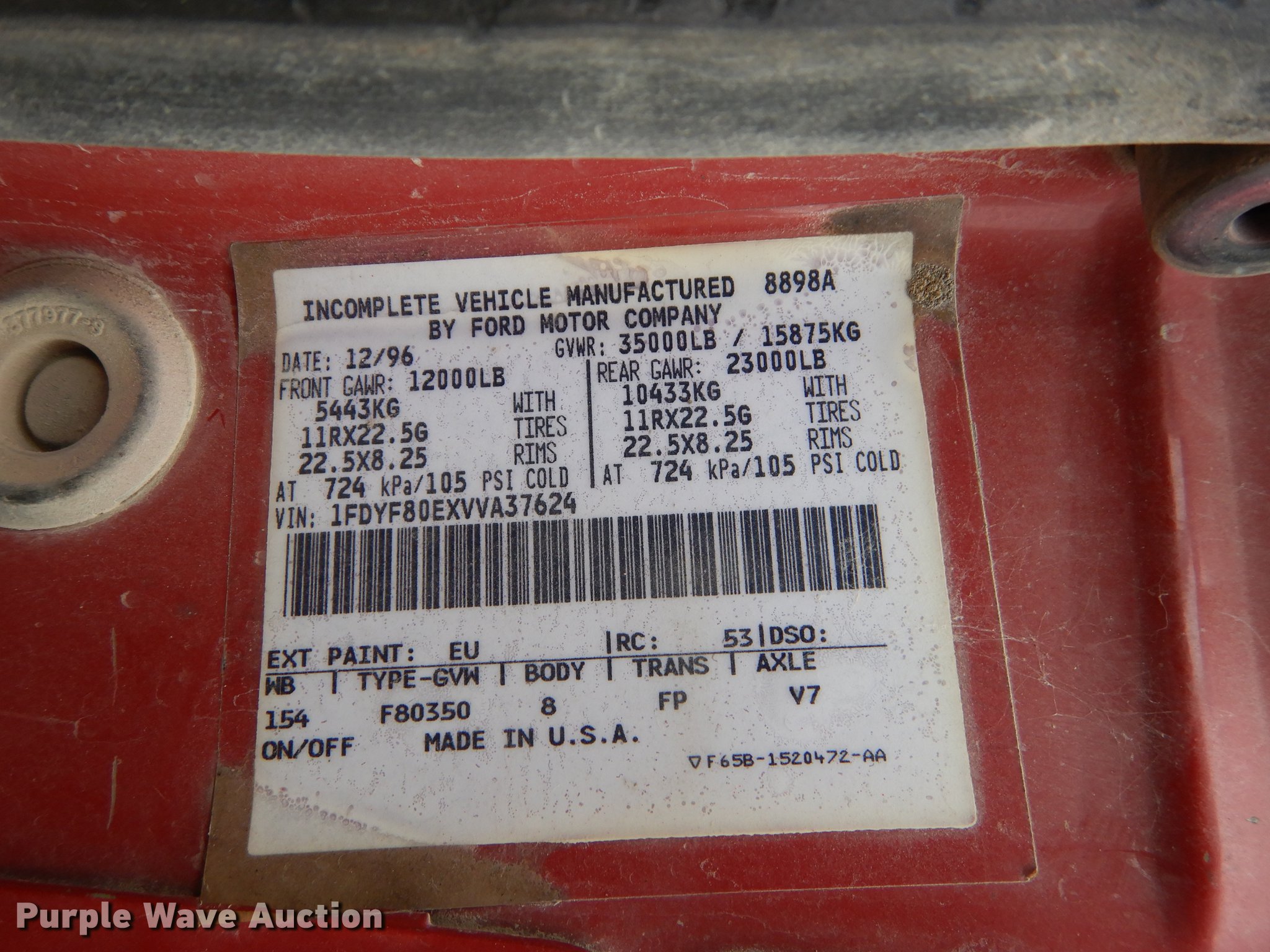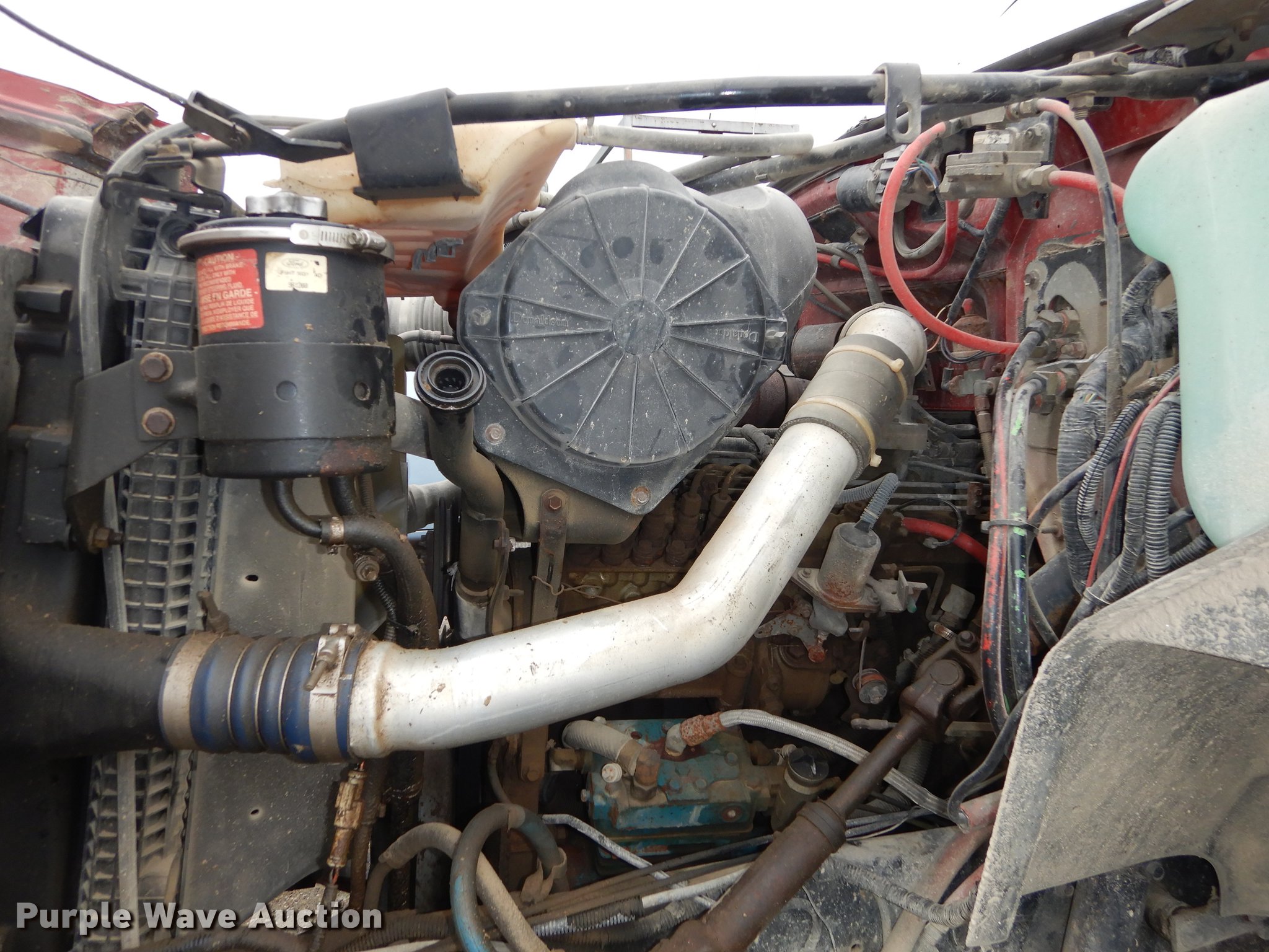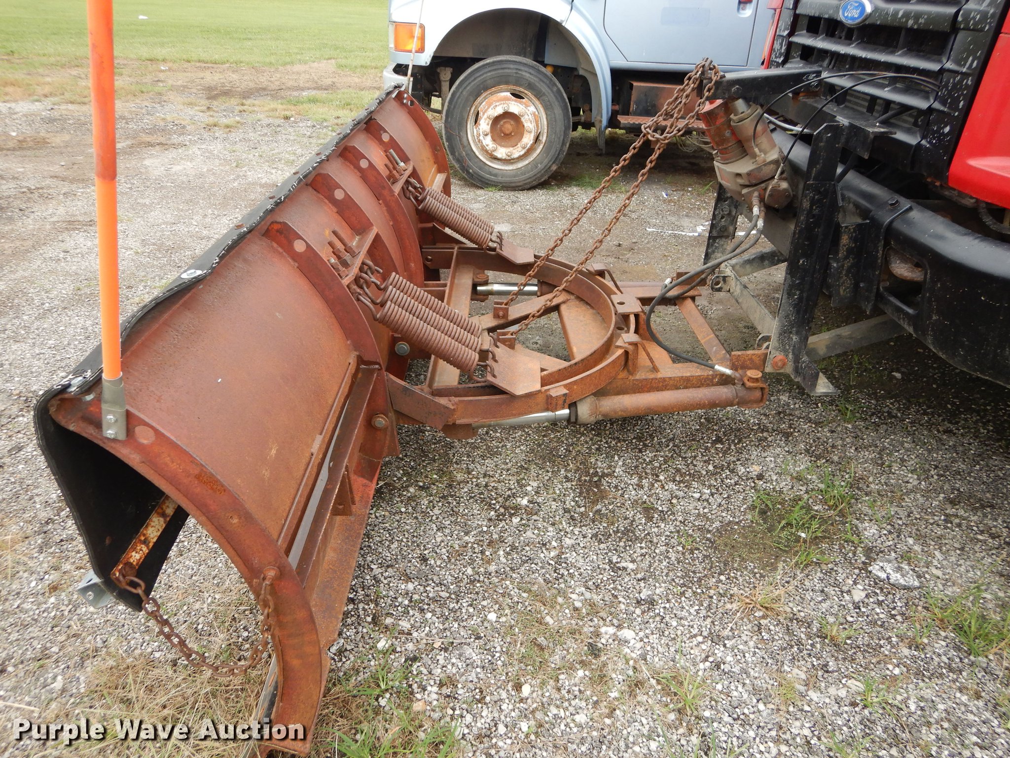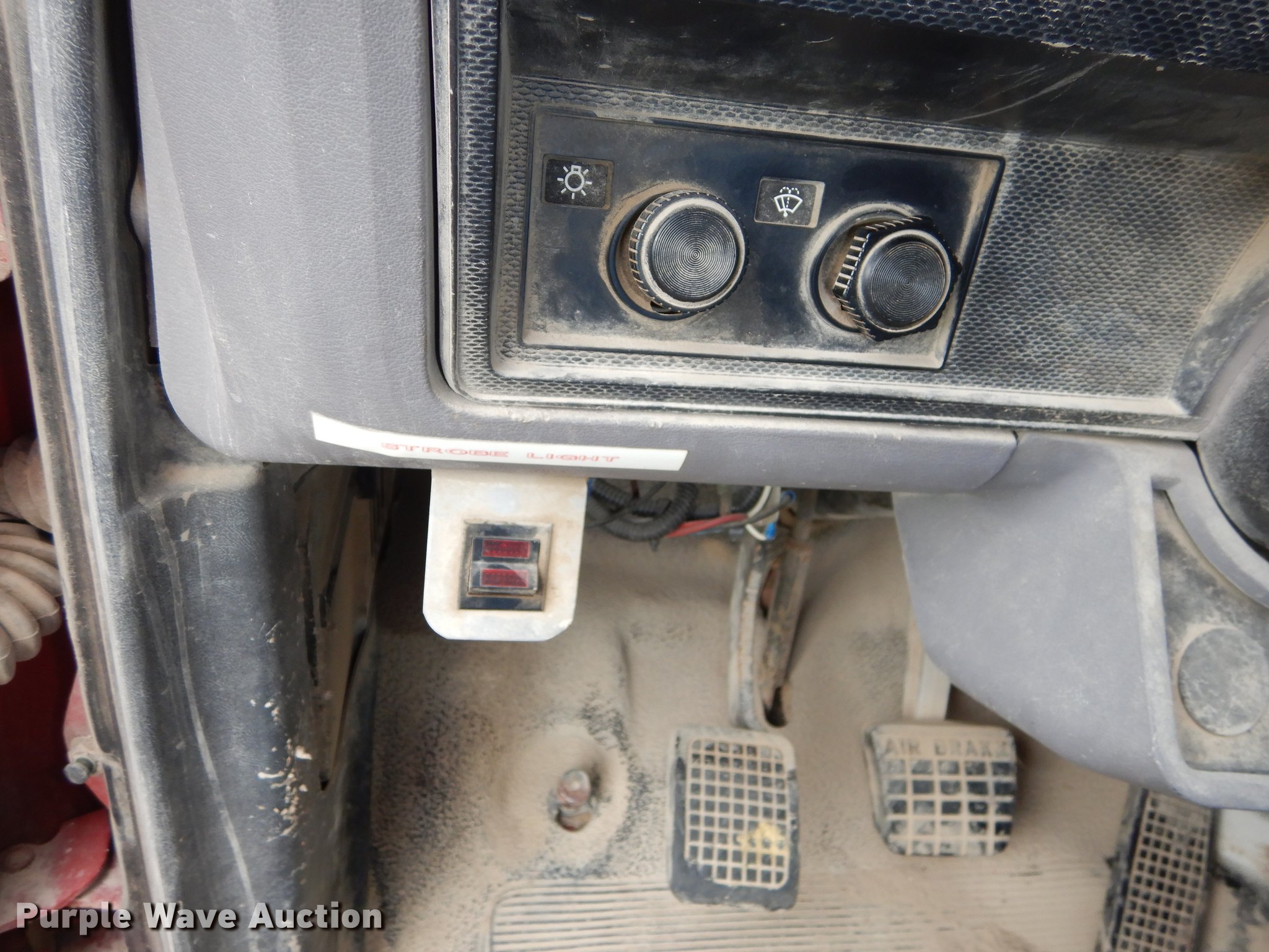 Purple Wave is selling a used Construction Dump Truck in Kansas. This item is a 1997 Ford F800 dump truck with the following: 90,649 miles on odometer, Cummins 8.3L L6 turbo diesel engine, Eaton Fuller Road Ranger RT7608LL eight speed manual transmission, Single axle, AC and heat, AM/FM, Vinyl interior, Strobe light, Block heater, 10'L x 94"W steel dump bed, 22" side height, 12" side board height, Single ram hoist, Manual end gate, Western 9'W plow, Dual fuel tanks, Air brakes, 158" wheelbase, 11R22.5 tires, GVWR 35,000 lbs, FAWR 12,000 lbs, RAWR 23,000 lbs, Dead batteries, Fuel and temperature gauges inoperable, Speedometer inoperable, Plow control box inoperable, Non-operational AC, Unit# 303
