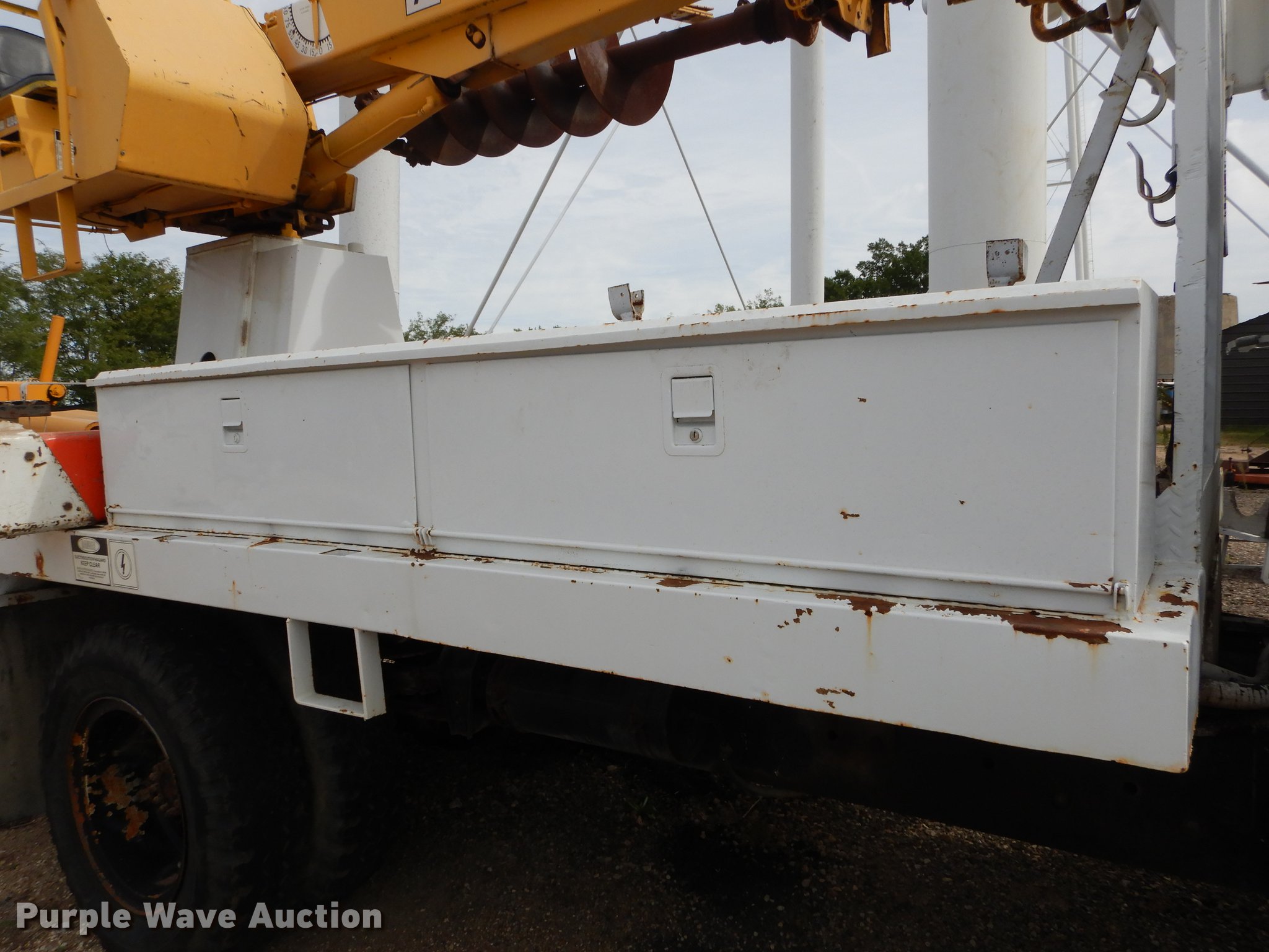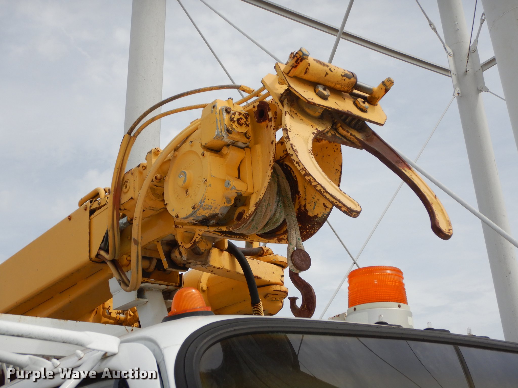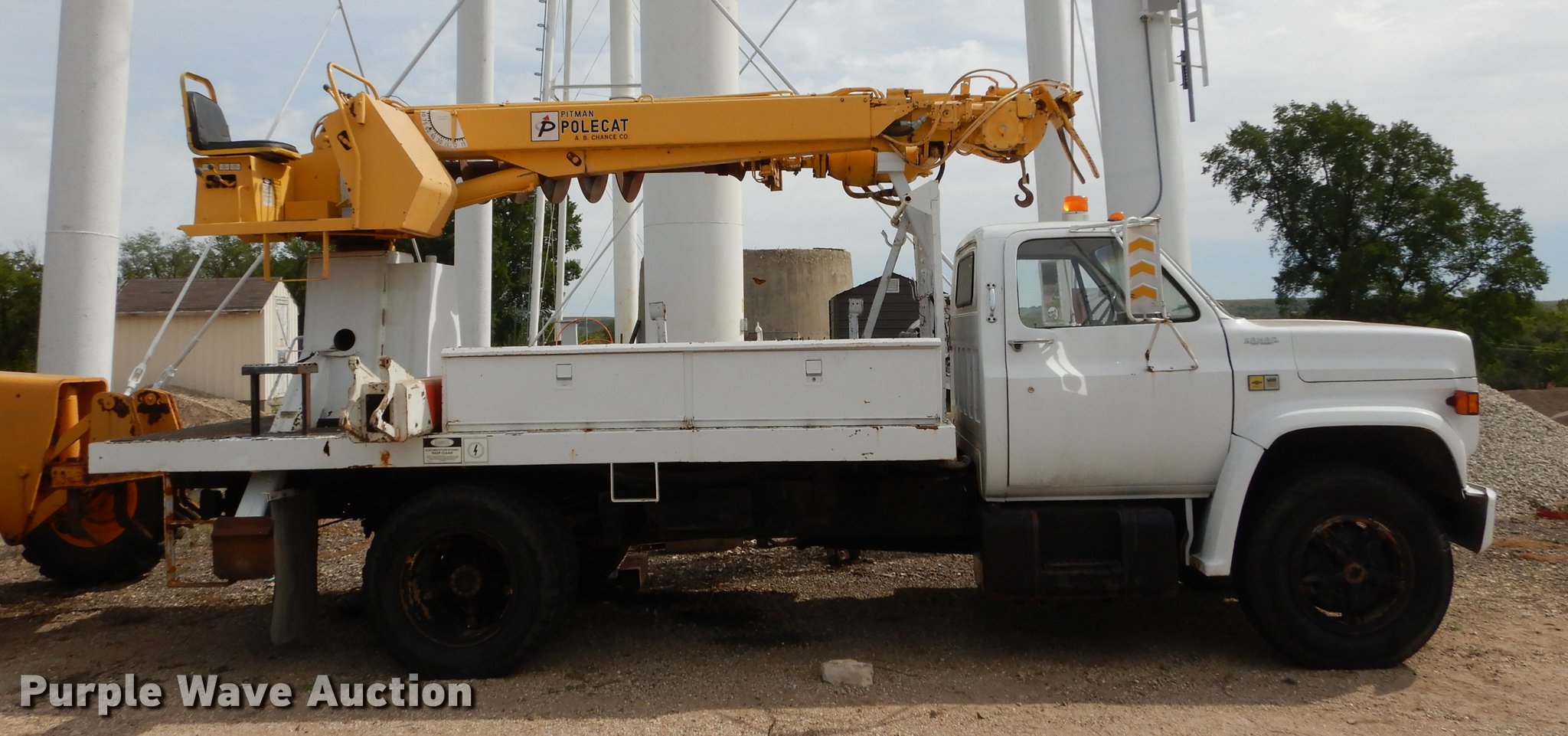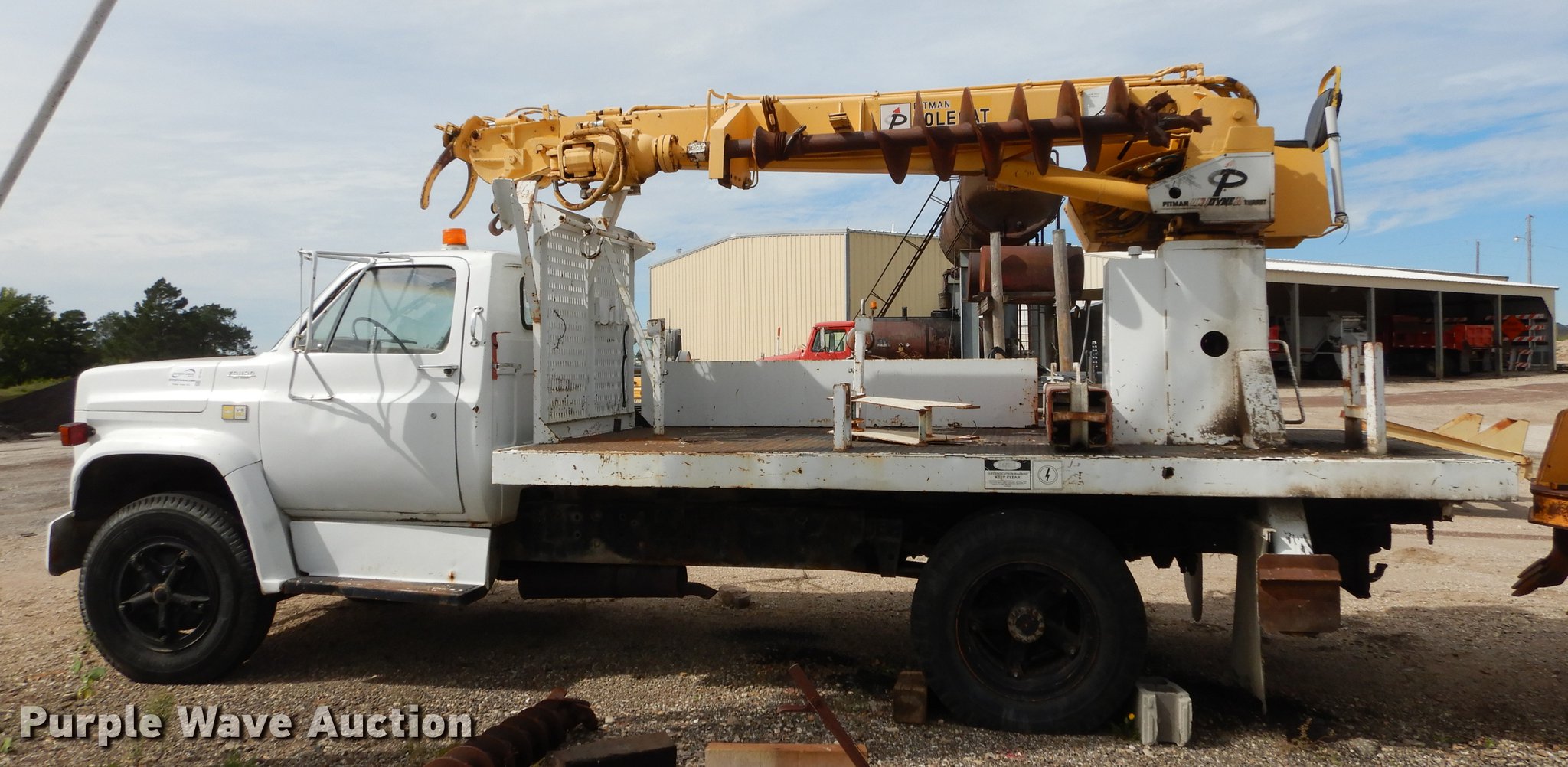 Purple Wave is selling a used Digger Derrick Truck in Kansas. This item is a 1980 Chevrolet C60 Custom Deluxe digger derrick truck with the following: 61,492 miles on odometer, 2,519 hours on meter, Eight cylinder gas engine, Five speed manual transmission, Two speed rear end, Single axle, Heat, AM/FM, Vinyl interior, Strobe light, 14'L x 93"W service bed, Toolbox, Pitman Unidyne II Turrent Polecat digger derrick, Model PCMG4NBD1, 26' to 29'9" boom length, 1,200 to 9,000 lbs max lift capacity, 34' to 38' max lift height, Material handler, Telescopic boom, 7'L x 18" diameter auger bit, 8'L x 9" diameter auger bit, Tulsa winch, 75 degree vertical lift radius, Rear outriggers, Serial 12540574065, Single fuel tank, Pintle hitch, Trailer wiring, Spring suspension, Hydraulic brakes, 170" wheelbase, Dunlop 9.00-20 tires, GVWR 23,160 lbs, Material handler hose needs to be replaced
