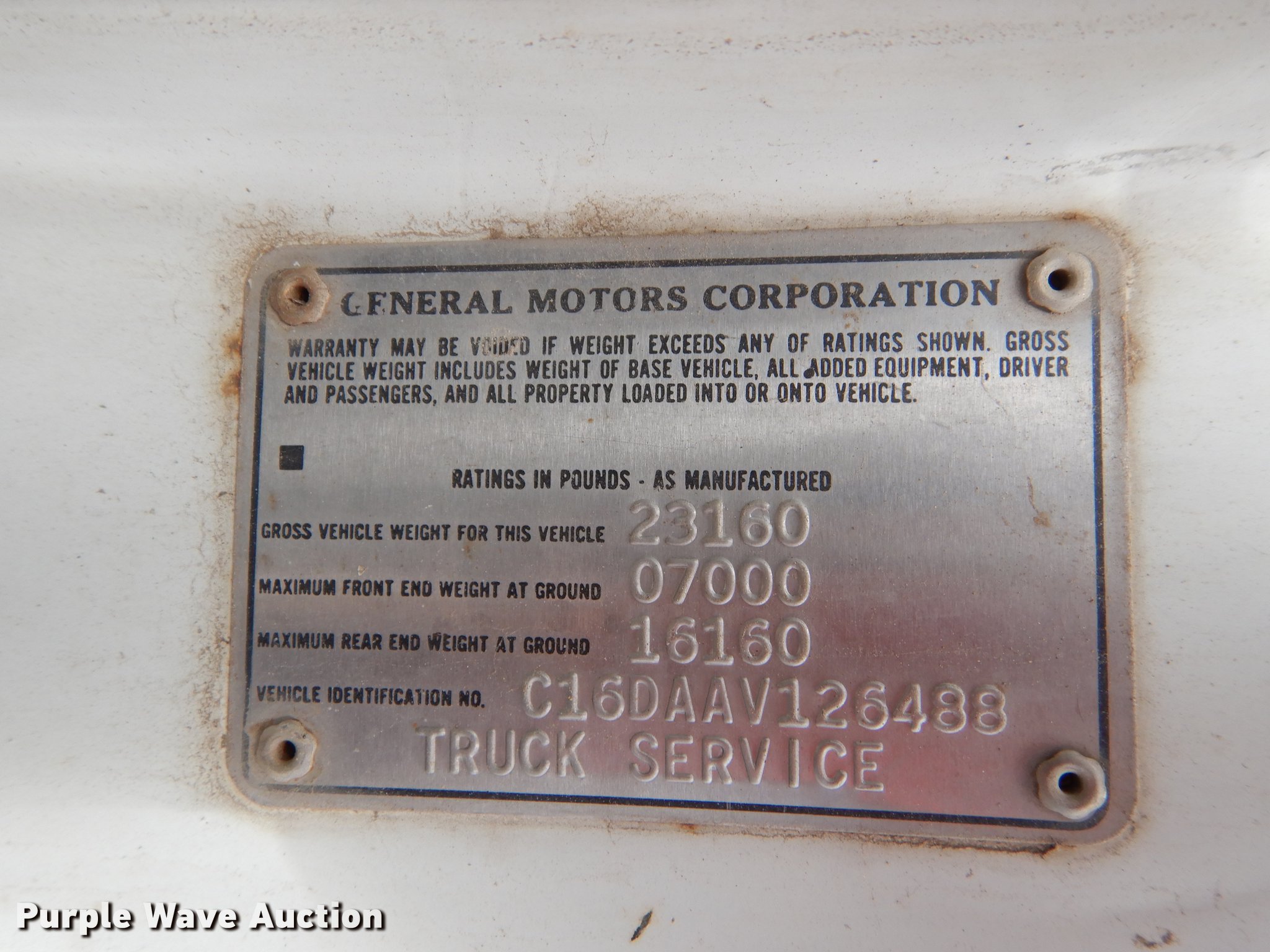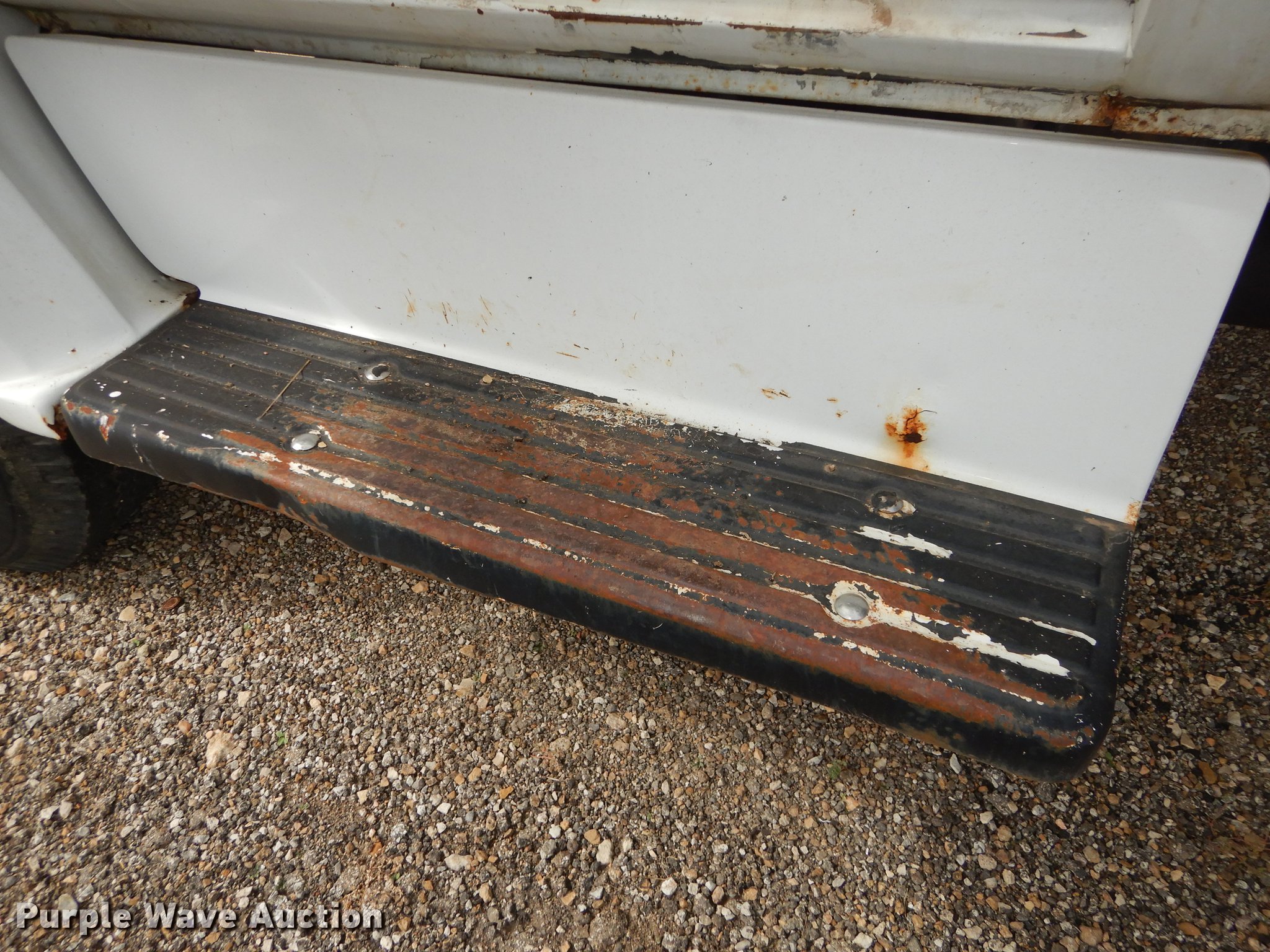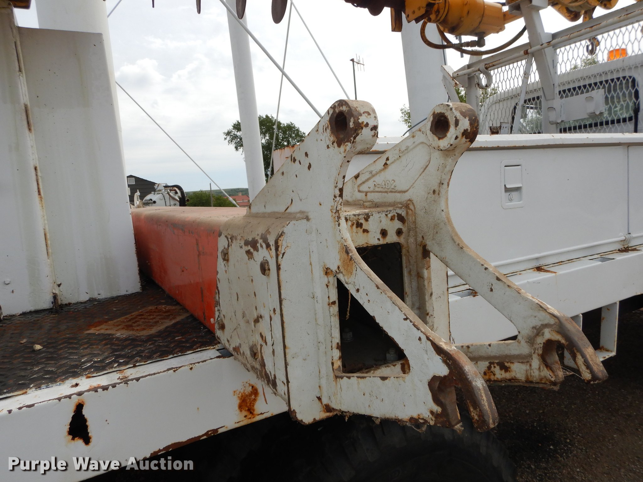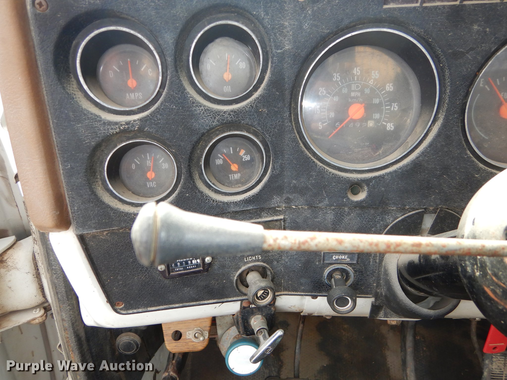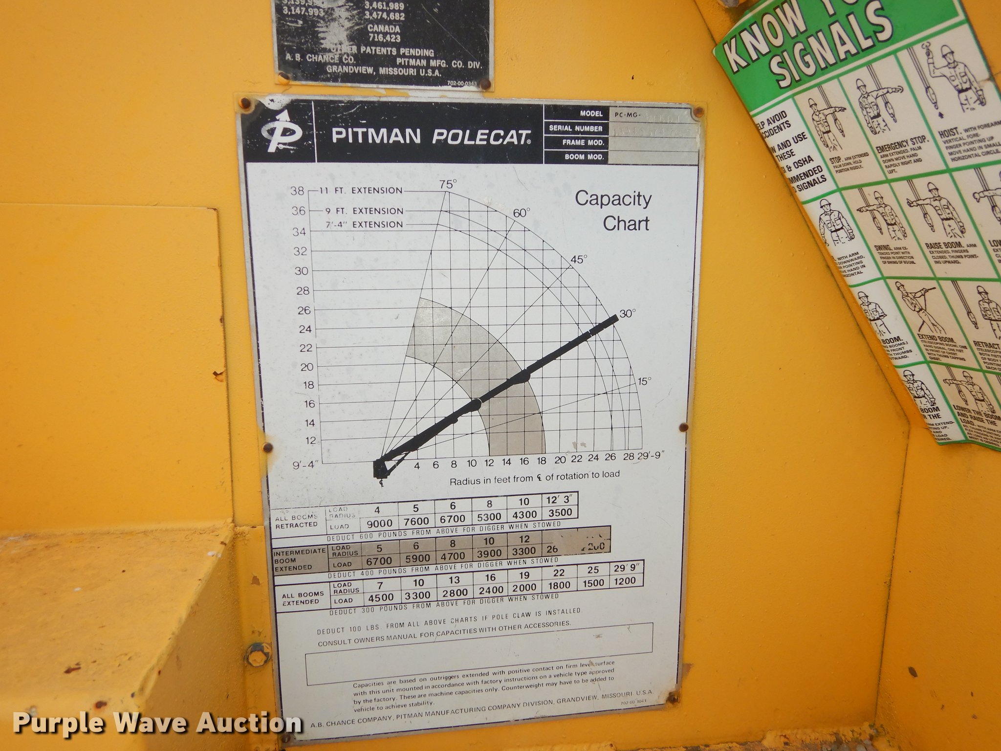Purple Wave is selling a used Digger Derrick Truck in Kansas. This item is a 1980 Chevrolet C60 Custom Deluxe digger derrick truck with the following: 61,492 miles on odometer, 2,519 hours on meter, Eight cylinder gas engine, Five speed manual transmission, Two speed rear end, Single axle, Heat, AM/FM, Vinyl interior, Strobe light, 14'L x 93"W service bed, Toolbox, Pitman Unidyne II Turrent Polecat digger derrick, Model PCMG4NBD1, 26' to 29'9" boom length, 1,200 to 9,000 lbs max lift capacity, 34' to 38' max lift height, Material handler, Telescopic boom, 7'L x 18" diameter auger bit, 8'L x 9" diameter auger bit, Tulsa winch, 75 degree vertical lift radius, Rear outriggers, Serial 12540574065, Single fuel tank, Pintle hitch, Trailer wiring, Spring suspension, Hydraulic brakes, 170" wheelbase, Dunlop 9.00-20 tires, GVWR 23,160 lbs, Material handler hose needs to be replaced