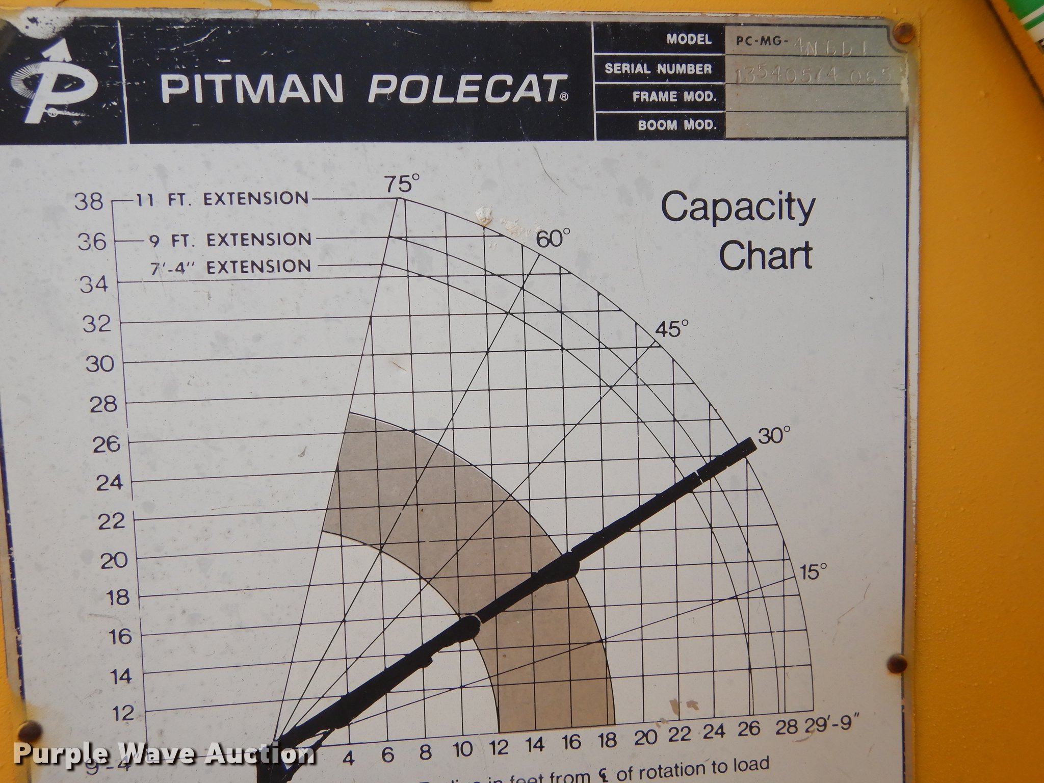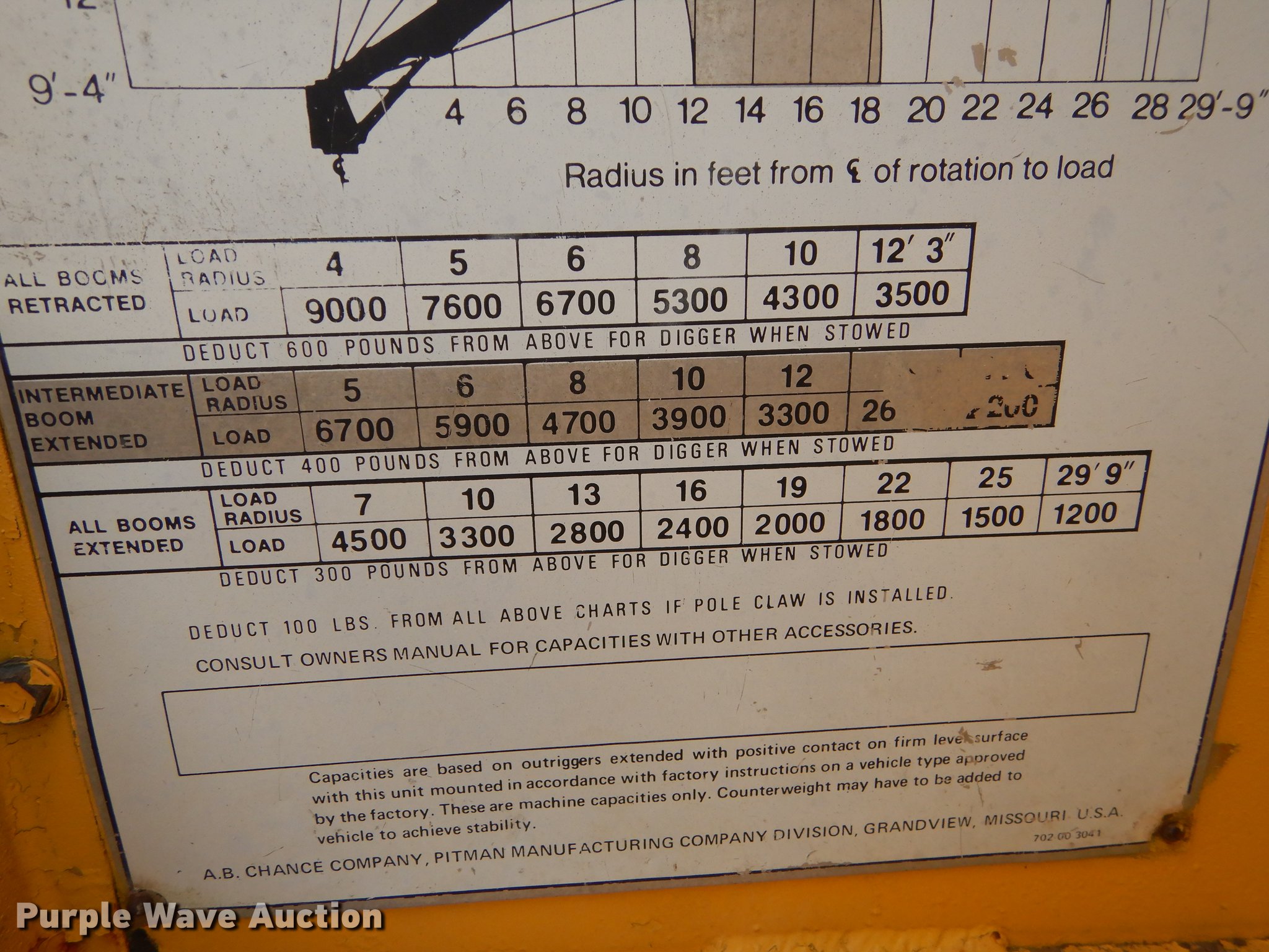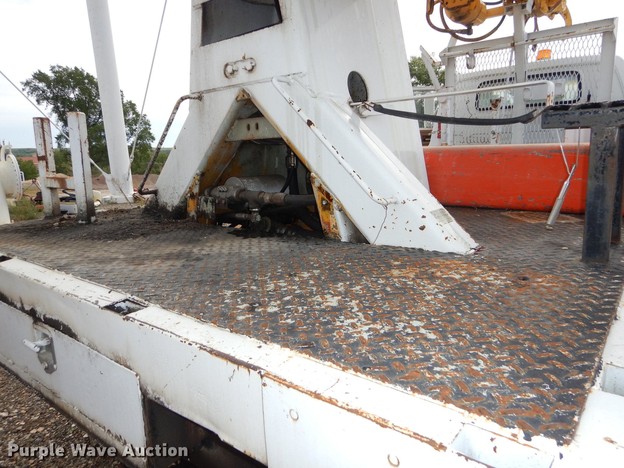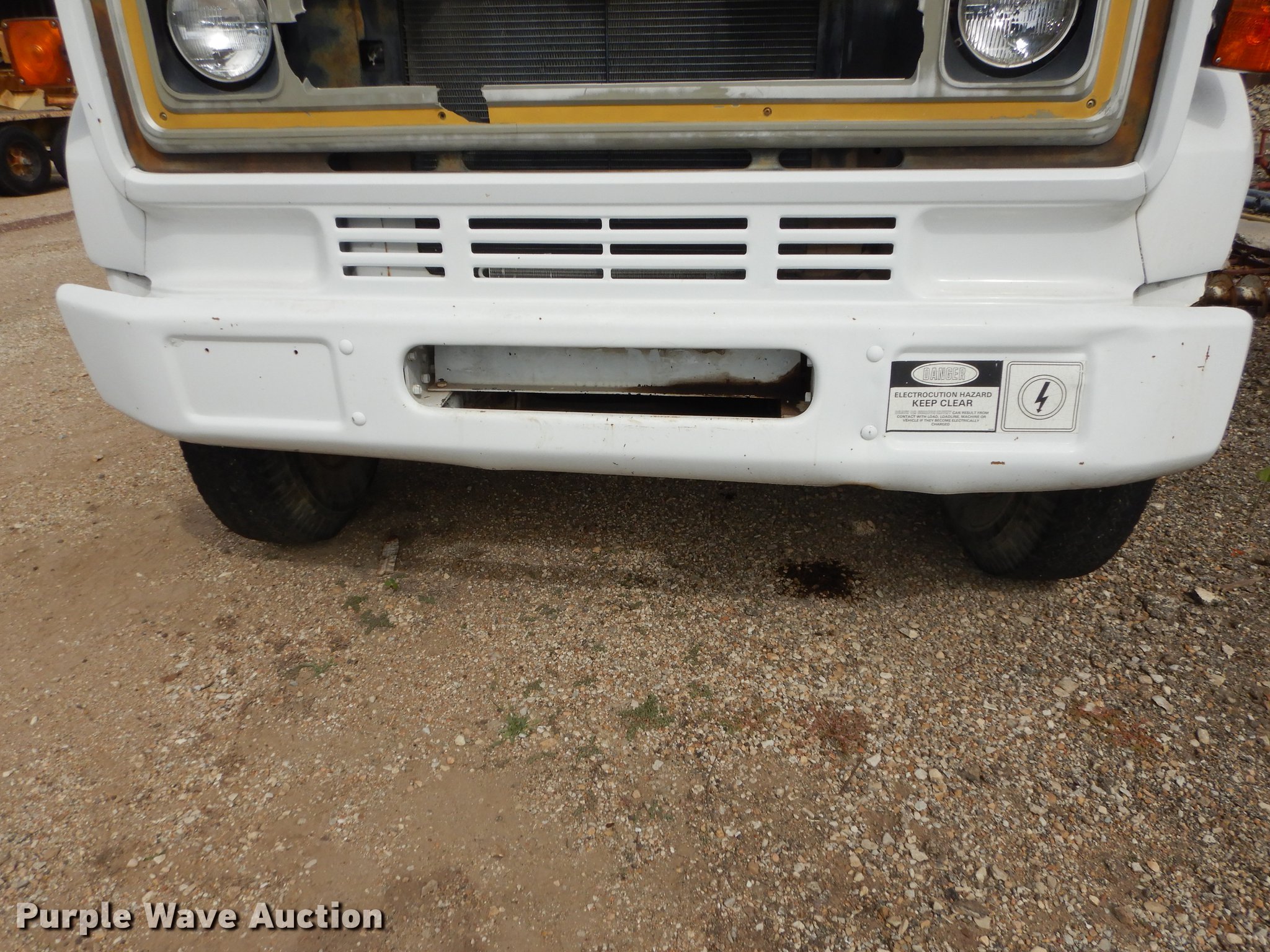 Purple Wave is selling a used Digger Derrick Truck in Kansas. This item is a 1980 Chevrolet C60 Custom Deluxe digger derrick truck with the following: 61,492 miles on odometer, 2,519 hours on meter, Eight cylinder gas engine, Five speed manual transmission, Two speed rear end, Single axle, Heat, AM/FM, Vinyl interior, Strobe light, 14'L x 93"W service bed, Toolbox, Pitman Unidyne II Turrent Polecat digger derrick, Model PCMG4NBD1, 26' to 29'9" boom length, 1,200 to 9,000 lbs max lift capacity, 34' to 38' max lift height, Material handler, Telescopic boom, 7'L x 18" diameter auger bit, 8'L x 9" diameter auger bit, Tulsa winch, 75 degree vertical lift radius, Rear outriggers, Serial 12540574065, Single fuel tank, Pintle hitch, Trailer wiring, Spring suspension, Hydraulic brakes, 170" wheelbase, Dunlop 9.00-20 tires, GVWR 23,160 lbs, Material handler hose needs to be replaced