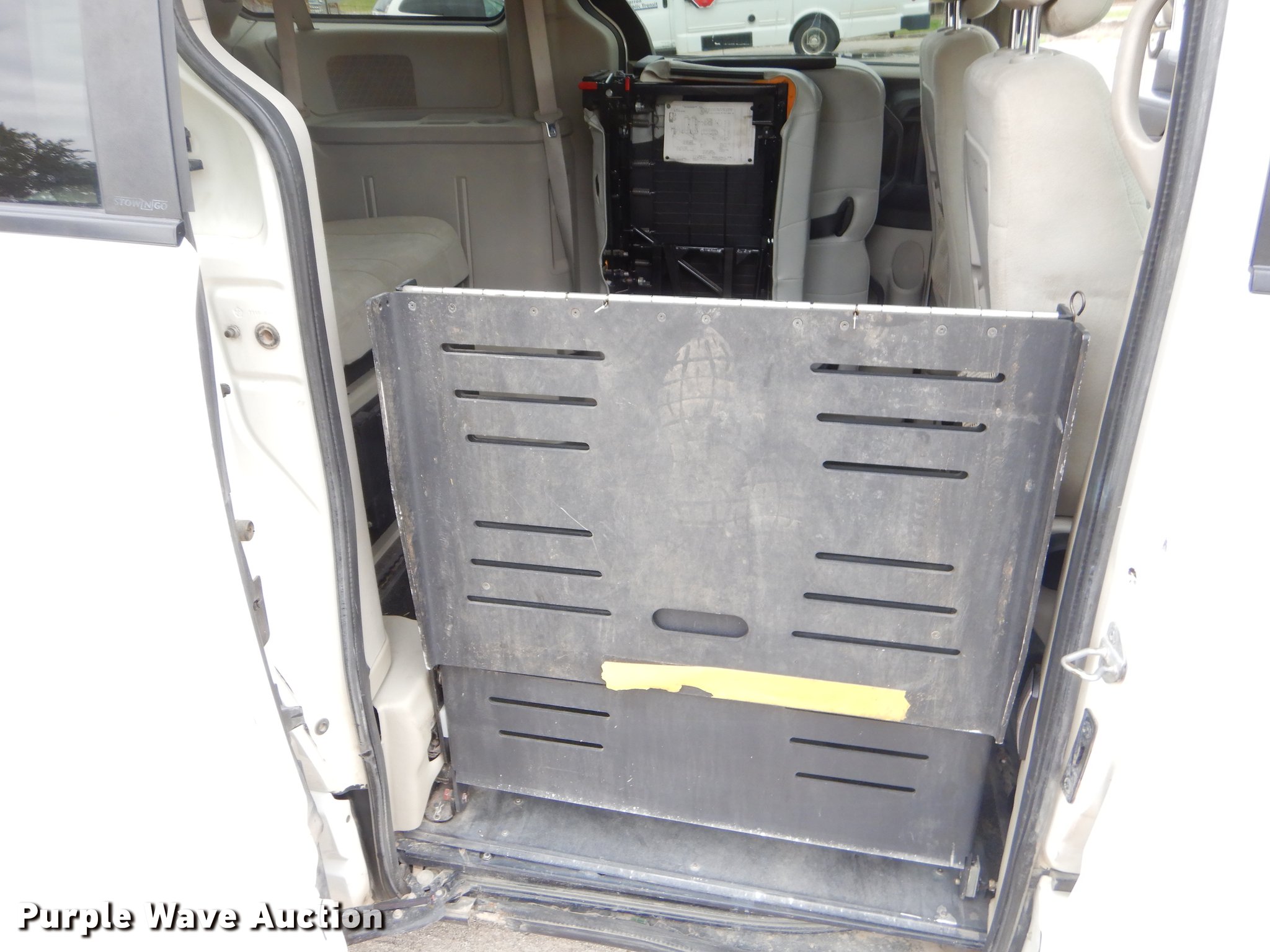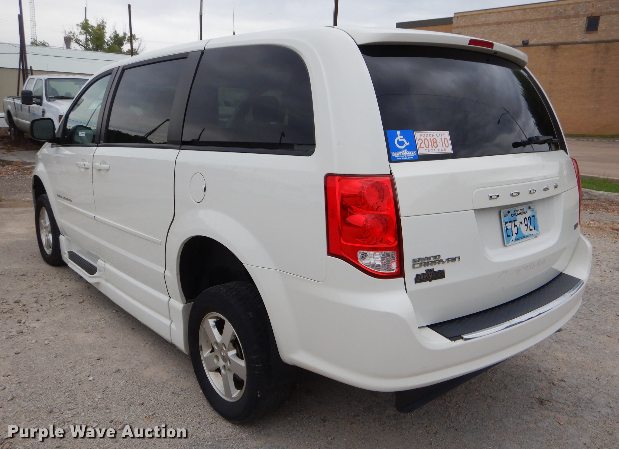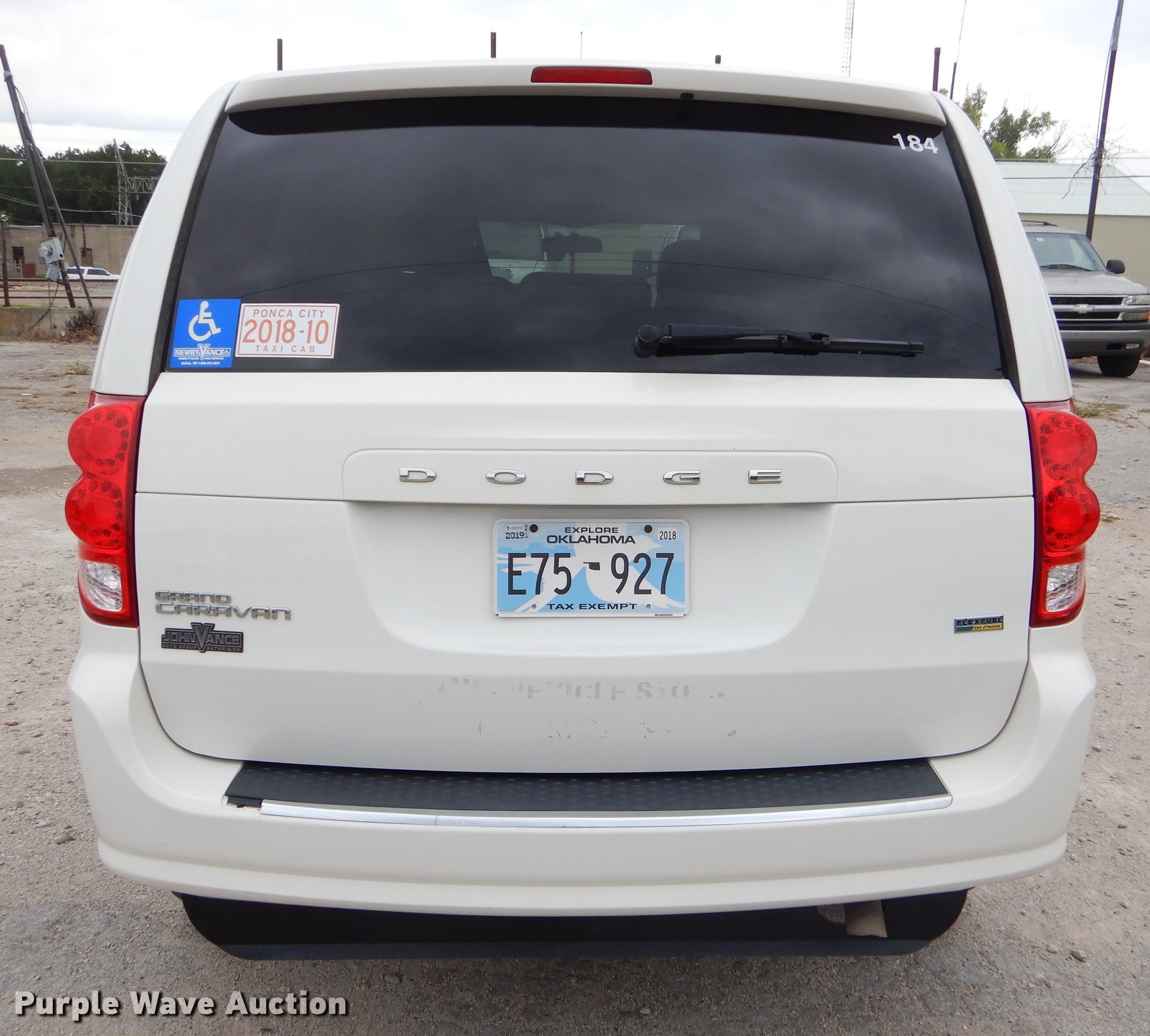 Purple Wave is selling a used Passenger Vehicle in Oklahoma. This item is a 2012 Dodge Grand Caravan van with the following: 187,475 miles on odometer, 3.6L V6 DOHC 24V gas engine, Automatic transmission, AC and heat, Tilt, Cruise, AM/FM/CD, Power windows, locks, and mirrors, Cloth interior, Backup alarm, Running boards, Wheelchair ramp, 235/60R16 tires, Possible flywheel cracked, Check engine light on, Unit# 184